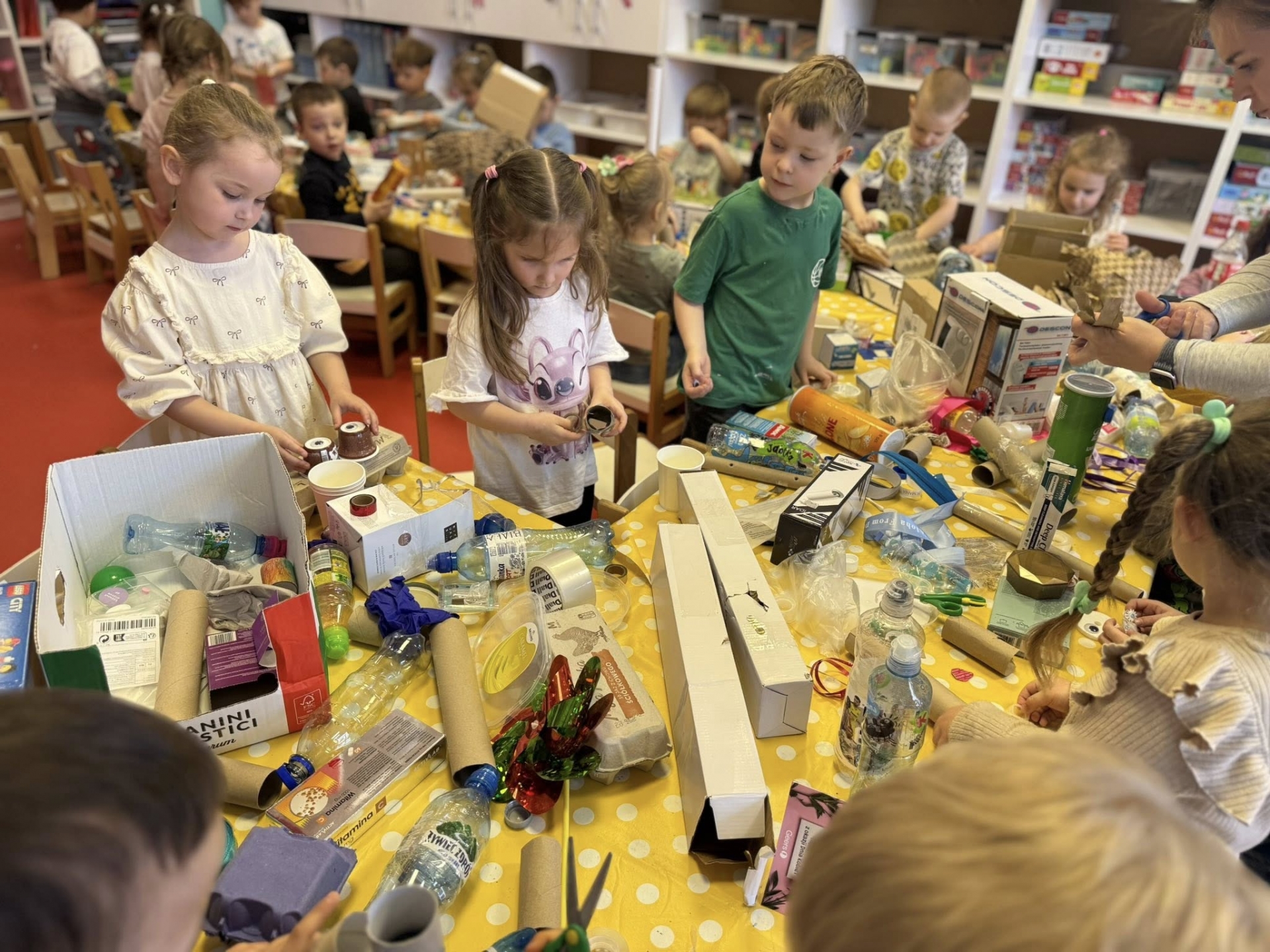 Podczas zajęć adaptacyjnych dzieci w przyjaznej atmosferze zapoznają się z rytmem dnia panującym w naszym przedszkolu. Poznają rówieśników w grupie, uczą się imion, wybierają i starają się zapamiętać swoje miejsce przy stoliku, która jest ich szafka, i co najważniejsze w tym wszystkim uczestniczą Państwo.