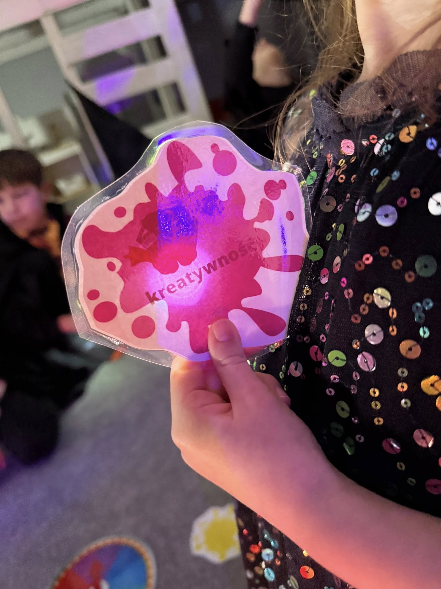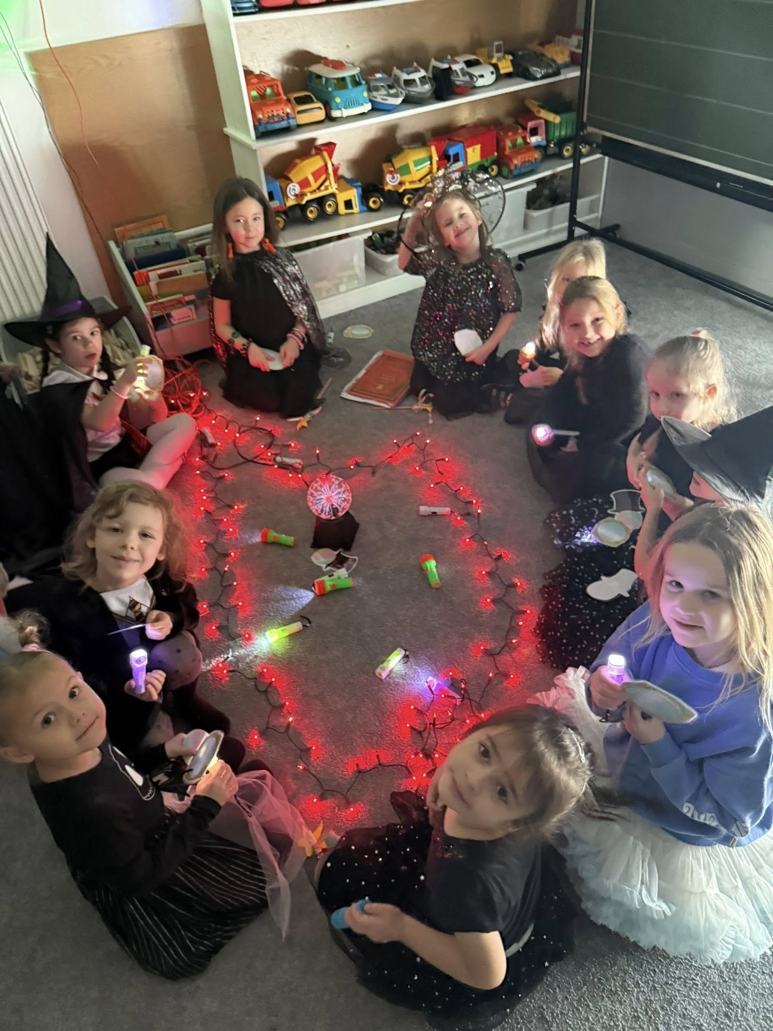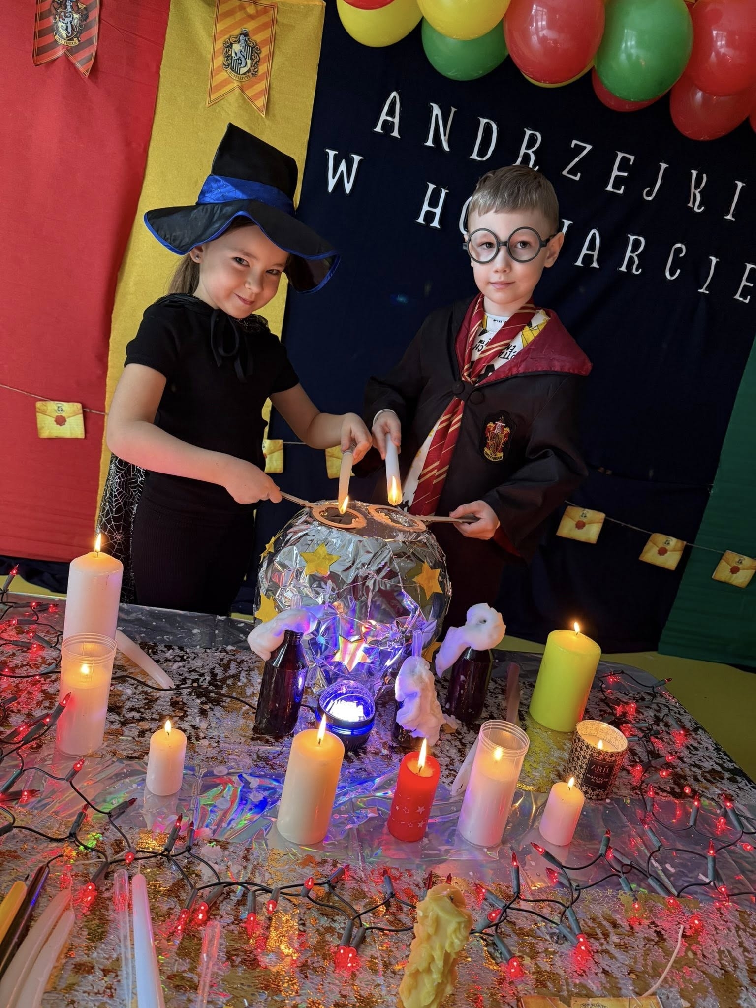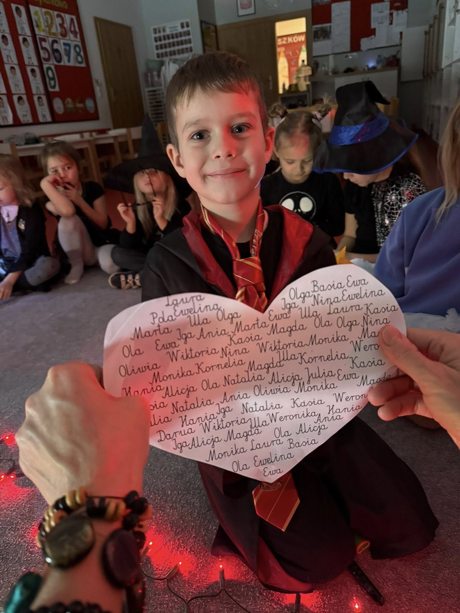 Wielką atrakcją okazały się podświetlane wróżby z latarką – niezwykłe światło ujawniało ukryte przepowiednie, a sala zamieniła się w prawdziwą komnatę czarów. Świeczki, światełka i kolorowe dekoracje sprawiły, że dzieci wyglądały jak mali magowie i czarodziejki. Atmosfera była pełna radości i tajemnicy.