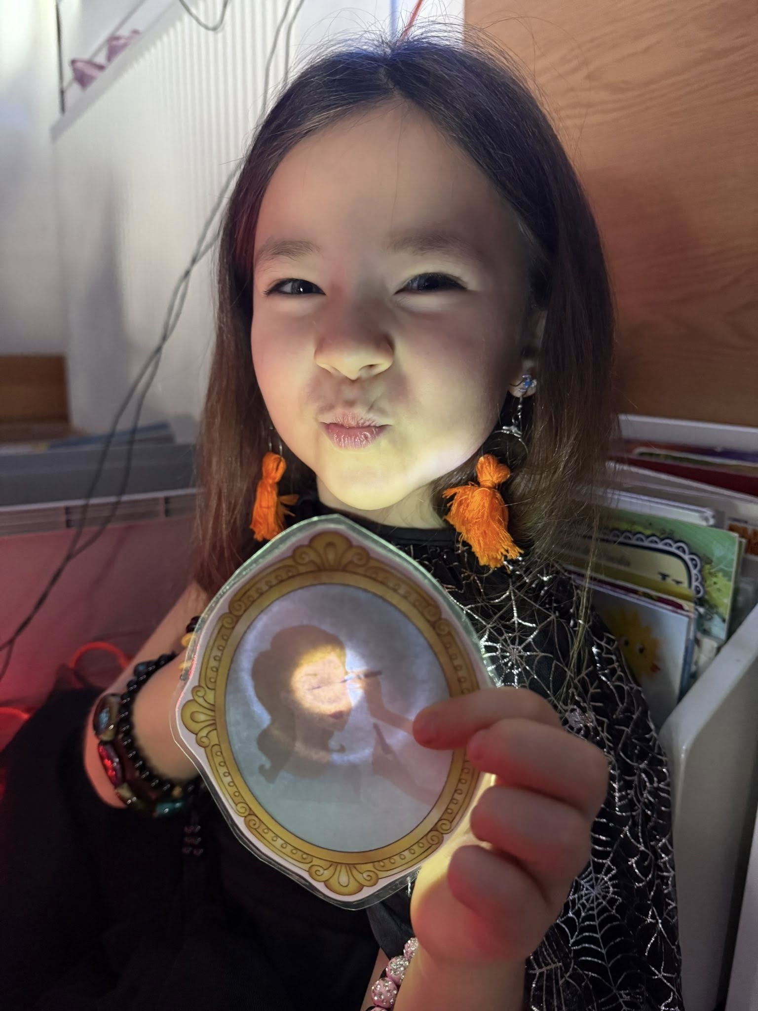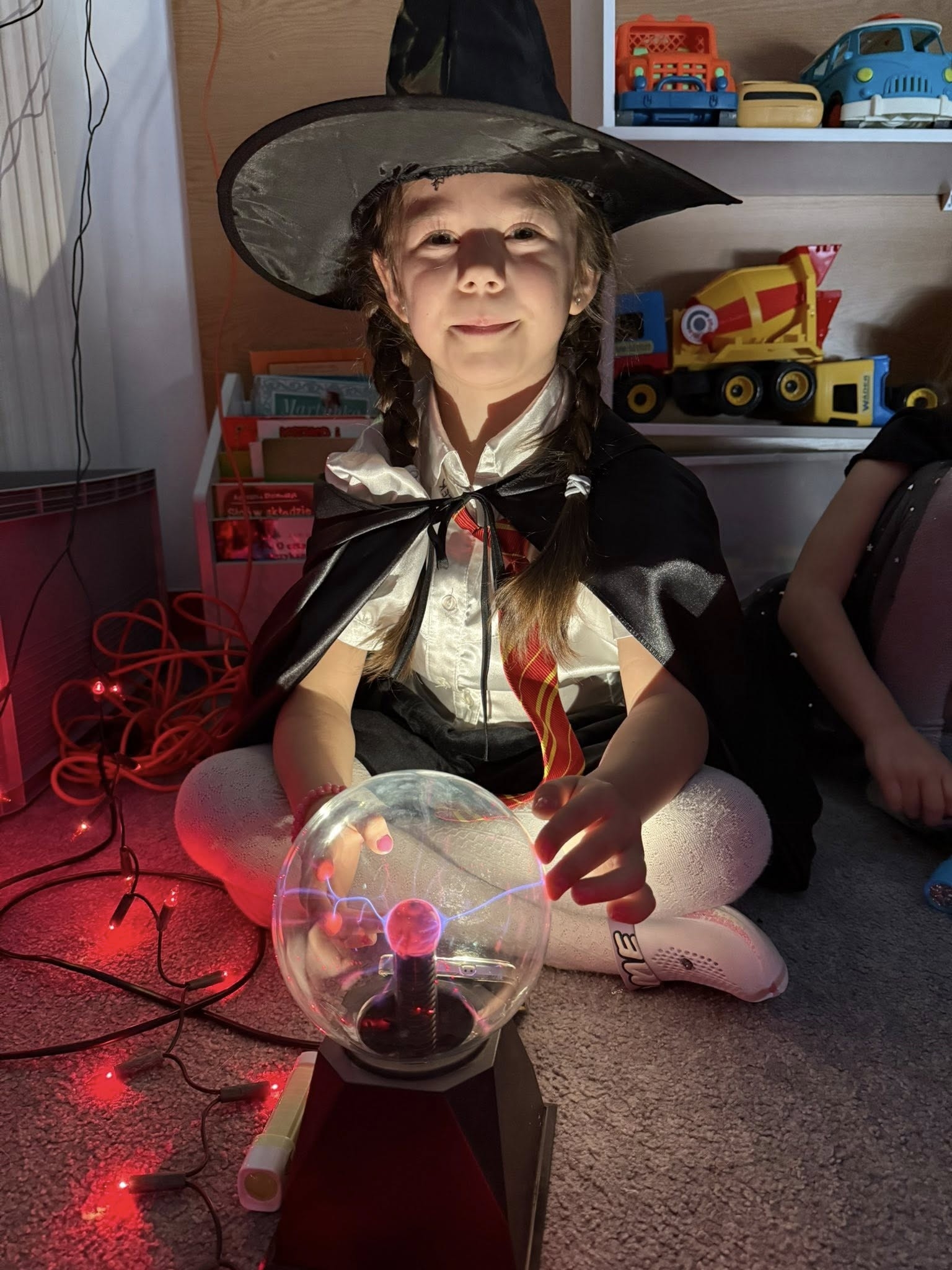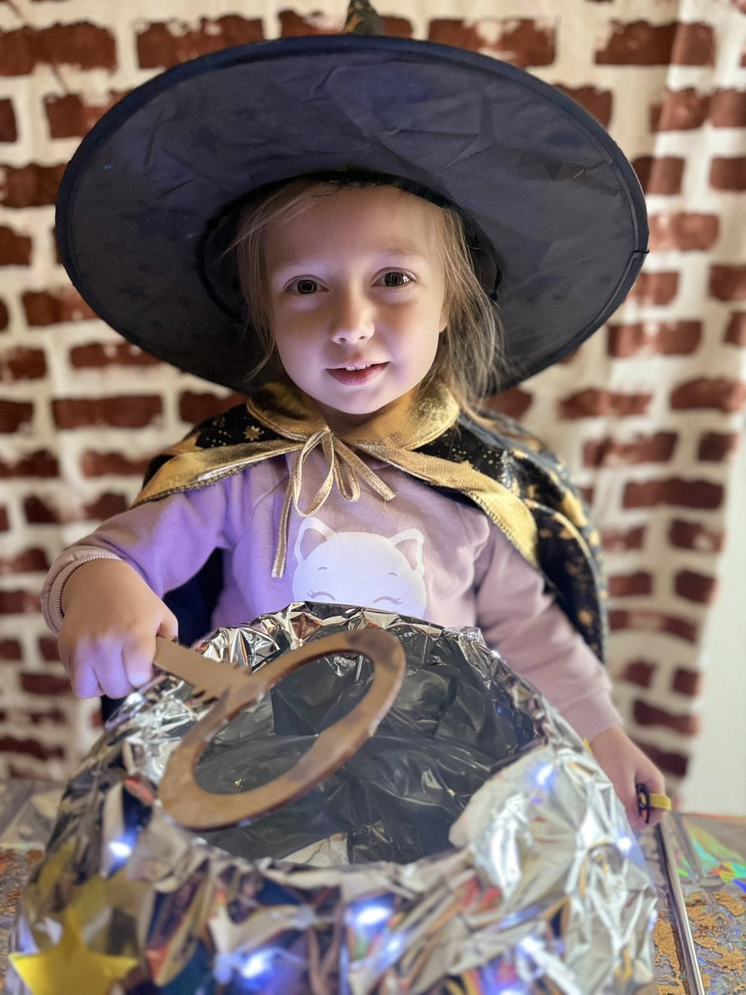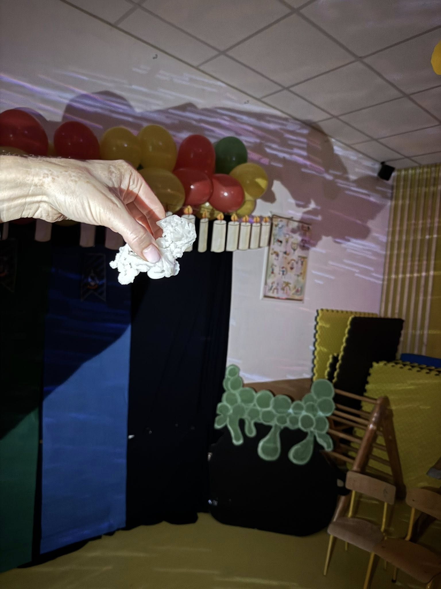 Wielką atrakcją okazały się podświetlane wróżby z latarką – niezwykłe światło ujawniało ukryte przepowiednie, a sala zamieniła się w prawdziwą komnatę czarów. Świeczki, światełka i kolorowe dekoracje sprawiły, że dzieci wyglądały jak mali magowie i czarodziejki. Atmosfera była pełna radości i tajemnicy.