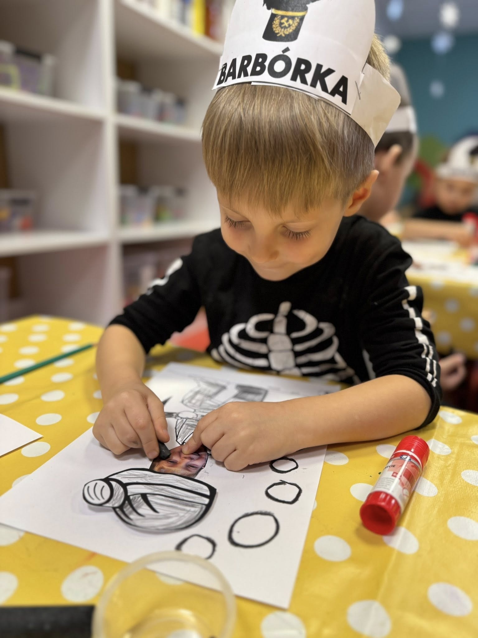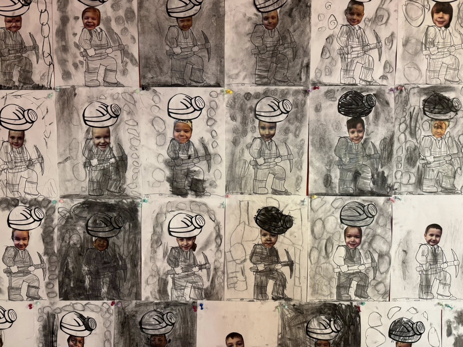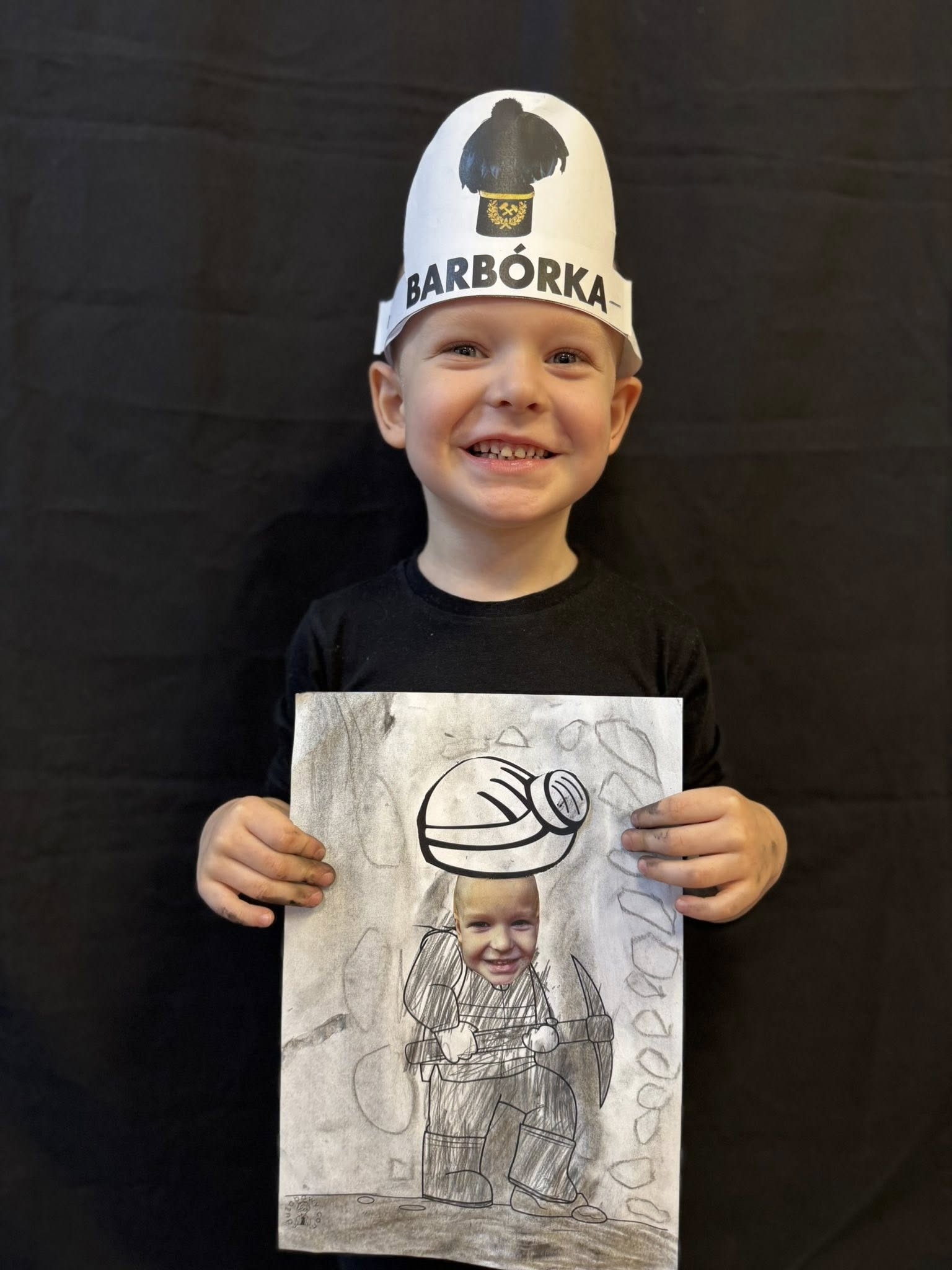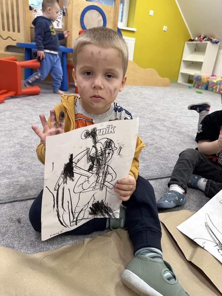 Barbórka była także okazją do rozwijania kreatywności. Starsze grupy przygotowały rysunki przedstawiające siebie jako górników pracujących w kopalni. Do prac używano prawdziwych węglowych kredek i patyczków, które nadawały im głęboki, czarny kolor. Maluszki tworzyły dzieła z czarnej plasteliny, inspirowane górniczym światem. Zerówka i przedszkolaki wykonały dodatkowe prace plastyczne z użyciem kolorowego papieru i prawdziwego węgla.