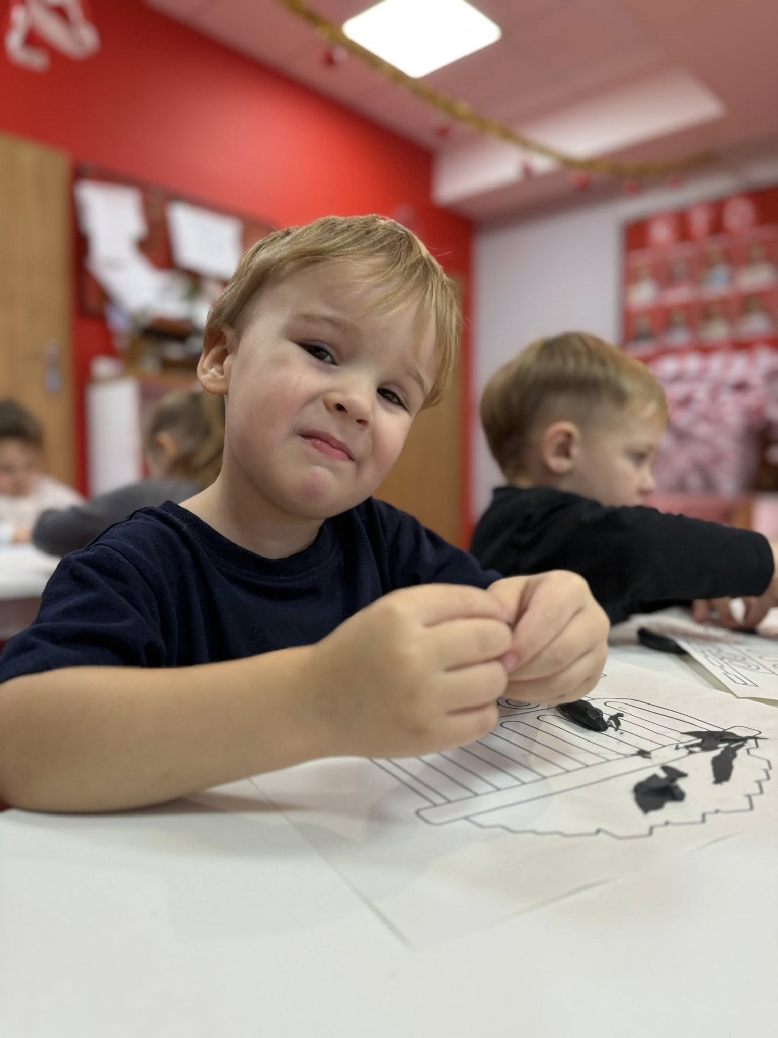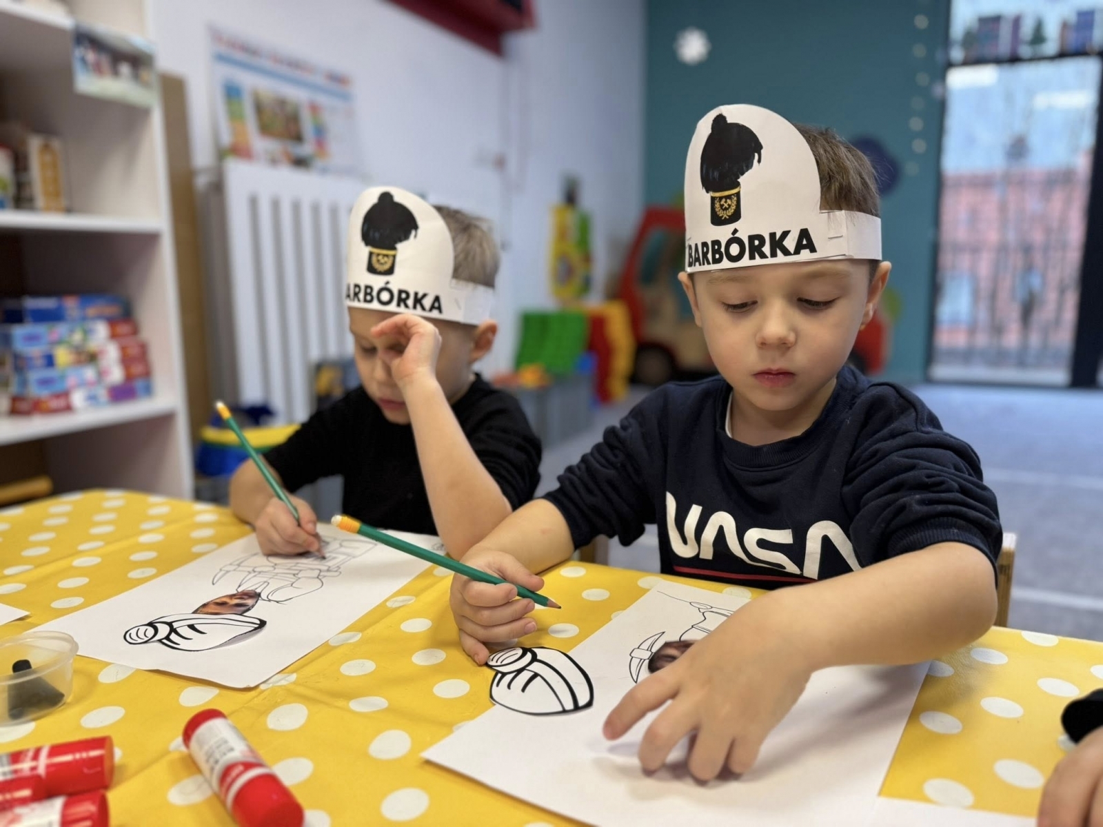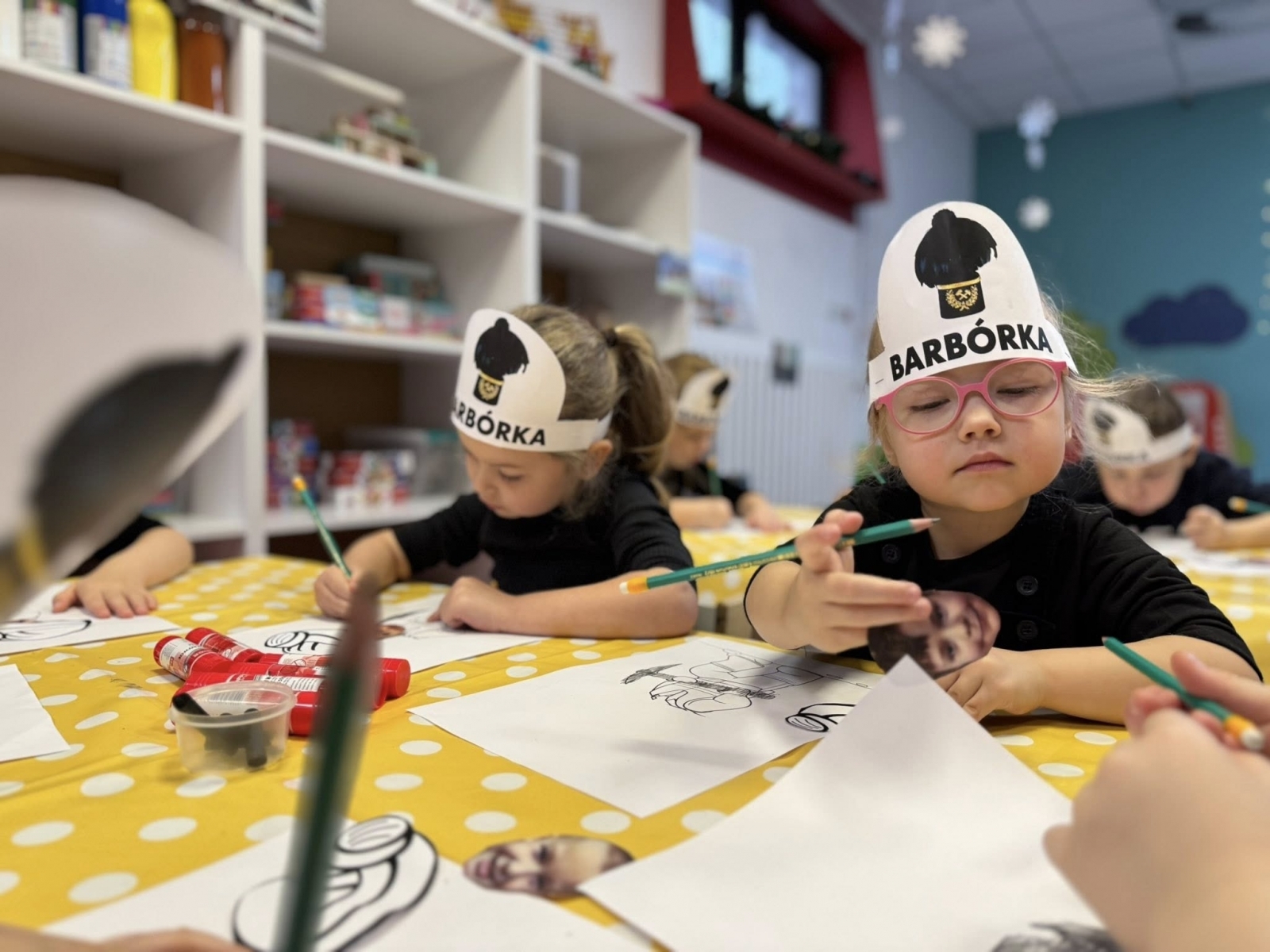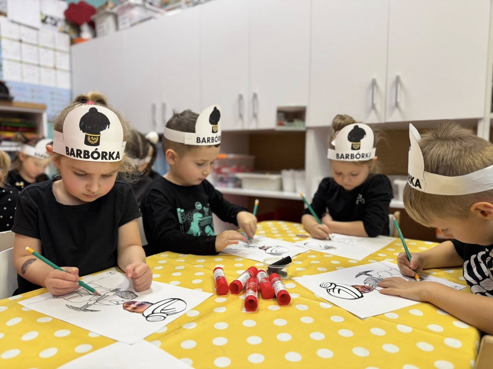 Barbórka była także okazją do rozwijania kreatywności. Starsze grupy przygotowały rysunki przedstawiające siebie jako górników pracujących w kopalni. Do prac używano prawdziwych węglowych kredek i patyczków, które nadawały im głęboki, czarny kolor. Maluszki tworzyły dzieła z czarnej plasteliny, inspirowane górniczym światem. Zerówka i przedszkolaki wykonały dodatkowe prace plastyczne z użyciem kolorowego papieru i prawdziwego węgla.
