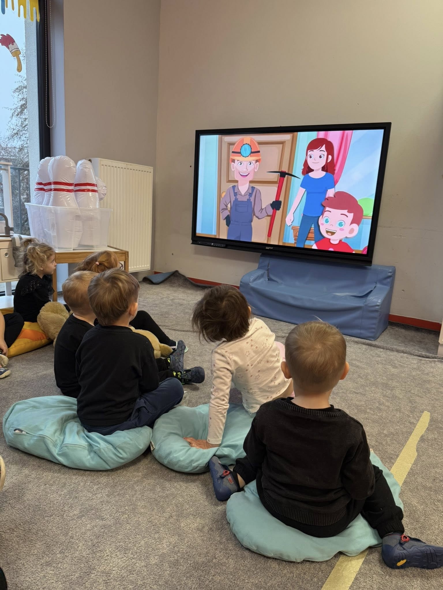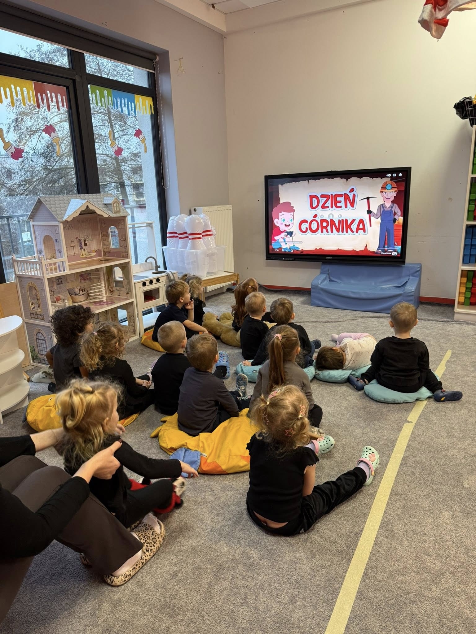 Maluszki obejrzały krótki film edukacyjny, dzięki któremu mogły lepiej zrozumieć, jak wygląda praca pod ziemią. Największą atrakcją okazało się dotknięcie prawdziwego węgla – dzieci sprawdzały jego wygląd, fakturę i przekonały się, że rzeczywiście brudzi ręce.