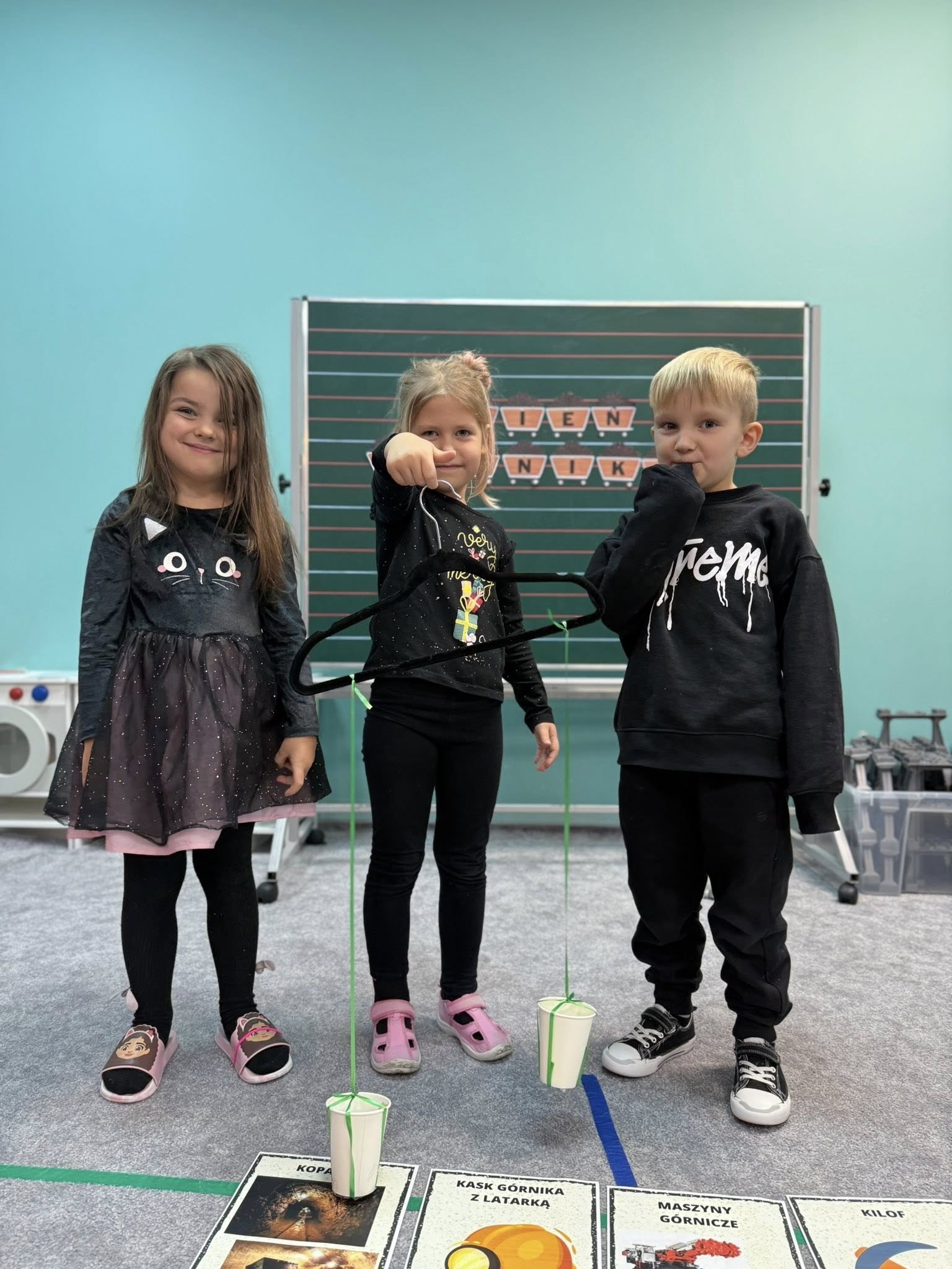 Obchody Barbórki nie ograniczyły się tylko do rozmów i zajęć plastycznych. Dzieci miały okazję obejrzeć strój roboczy i galowy górnika, a także wziąć udział w prostych doświadczeniach matematycznych. Porównywały przedmioty pod względem ciężaru, korzystając z wagi zrobionej z… wieszaka na ubrania.