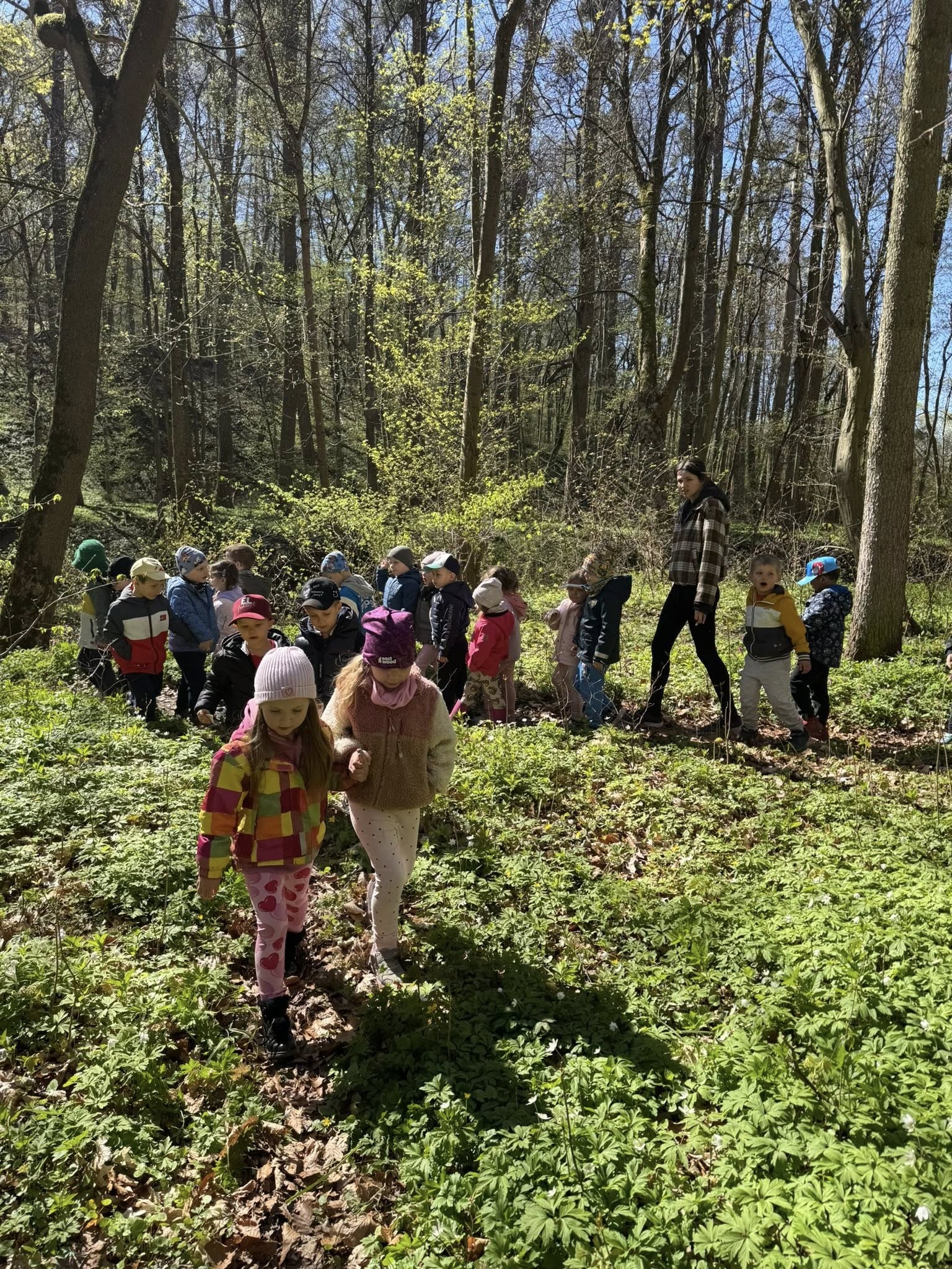 Spacerując malowniczymi szlakami, nasi podopieczni z zaciekawieniem odkrywali kolejne zakątki lasu. Podziwianie runa leśnego, rozpoznawanie gatunków drzew czy obserwacja owadów stały się okazją do spontanicznej nauki biologii.