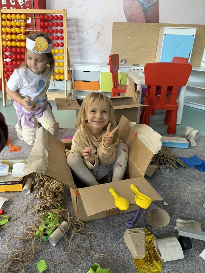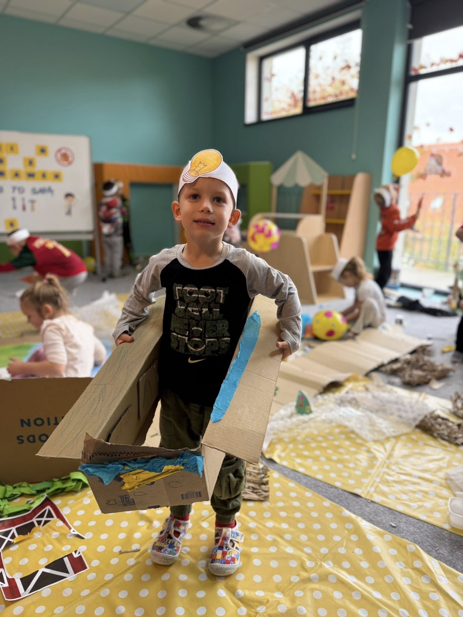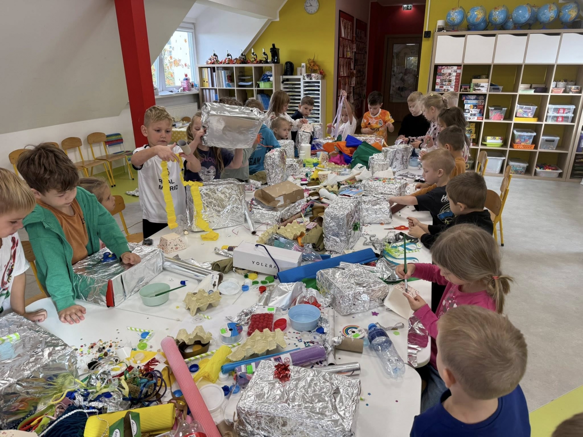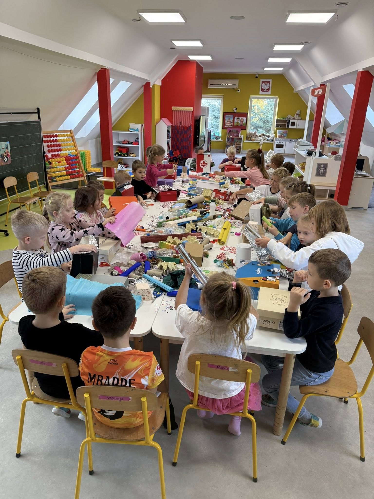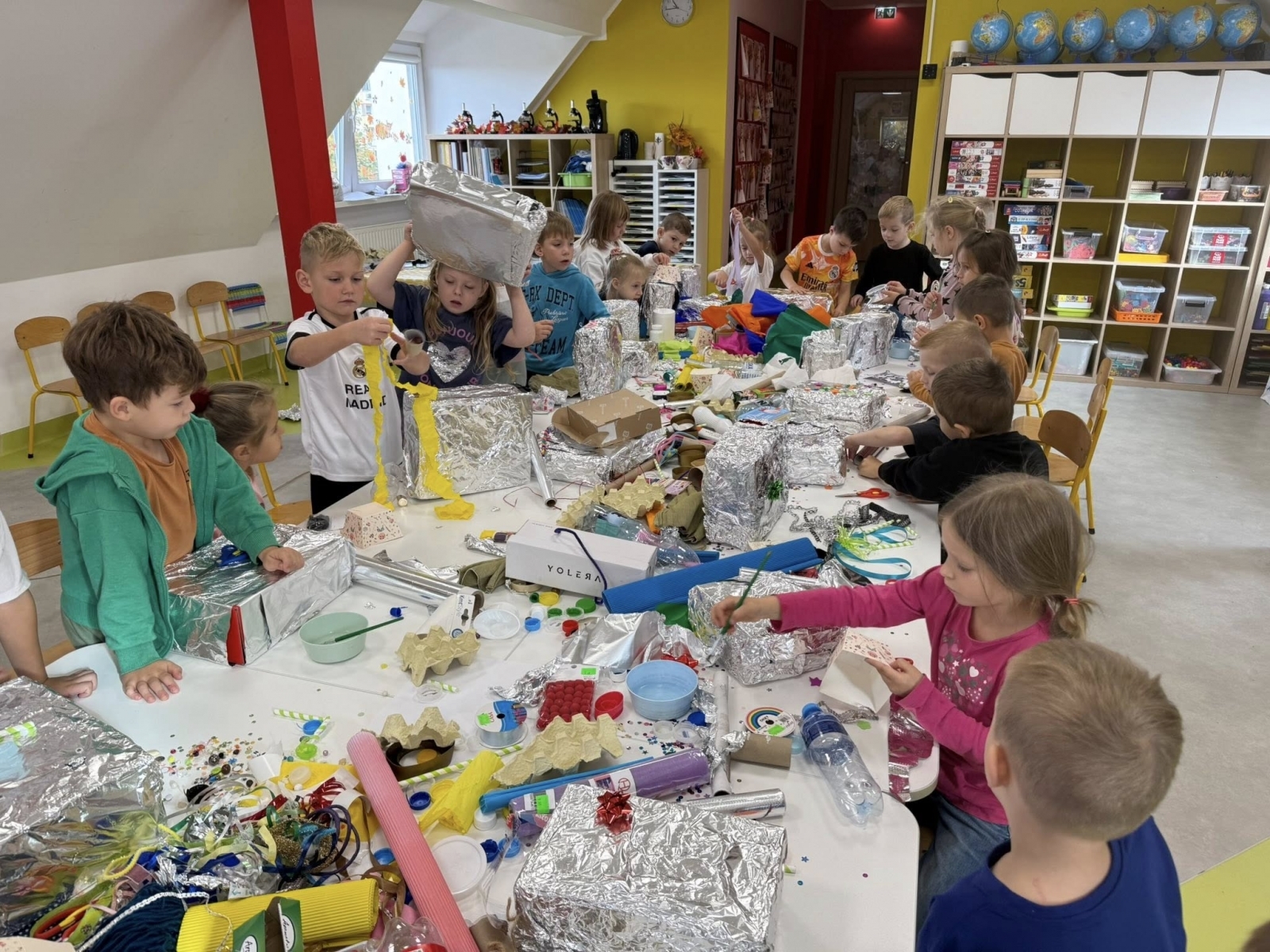 W salach Żłobka, Przedszkola i Zerówki Mały Europejczyk w Elblągu zapanowała twórcza atmosfera. Kartony, taśmy, rolki, sznurki, guziki, korki, nakrętki i pudełka – wszystko, co tylko można było przekształcić w coś nowego – stało się materiałem do budowy własnych zabawek. Starszaki rozpoczęły dzień od burzy mózgów, bo każdy wynalazek zaczyna się od dobrego pomysłu. Dzieci tworzyły maszyny, pojazdy, roboty i konstrukcje, które zachwycały pomysłowością i zaangażowaniem.
