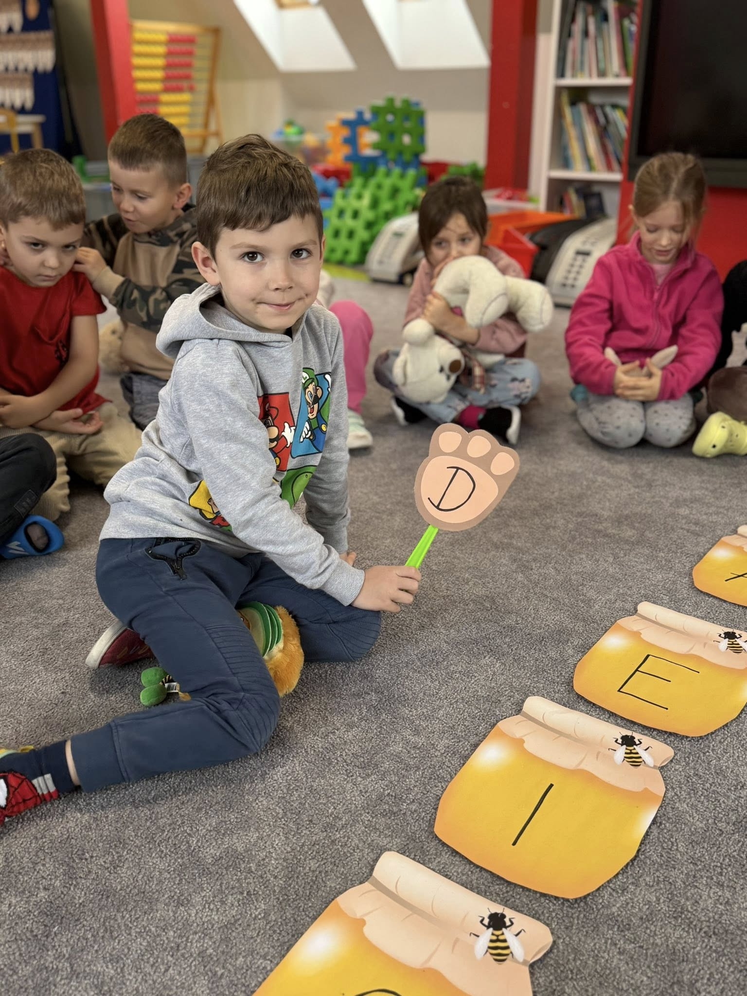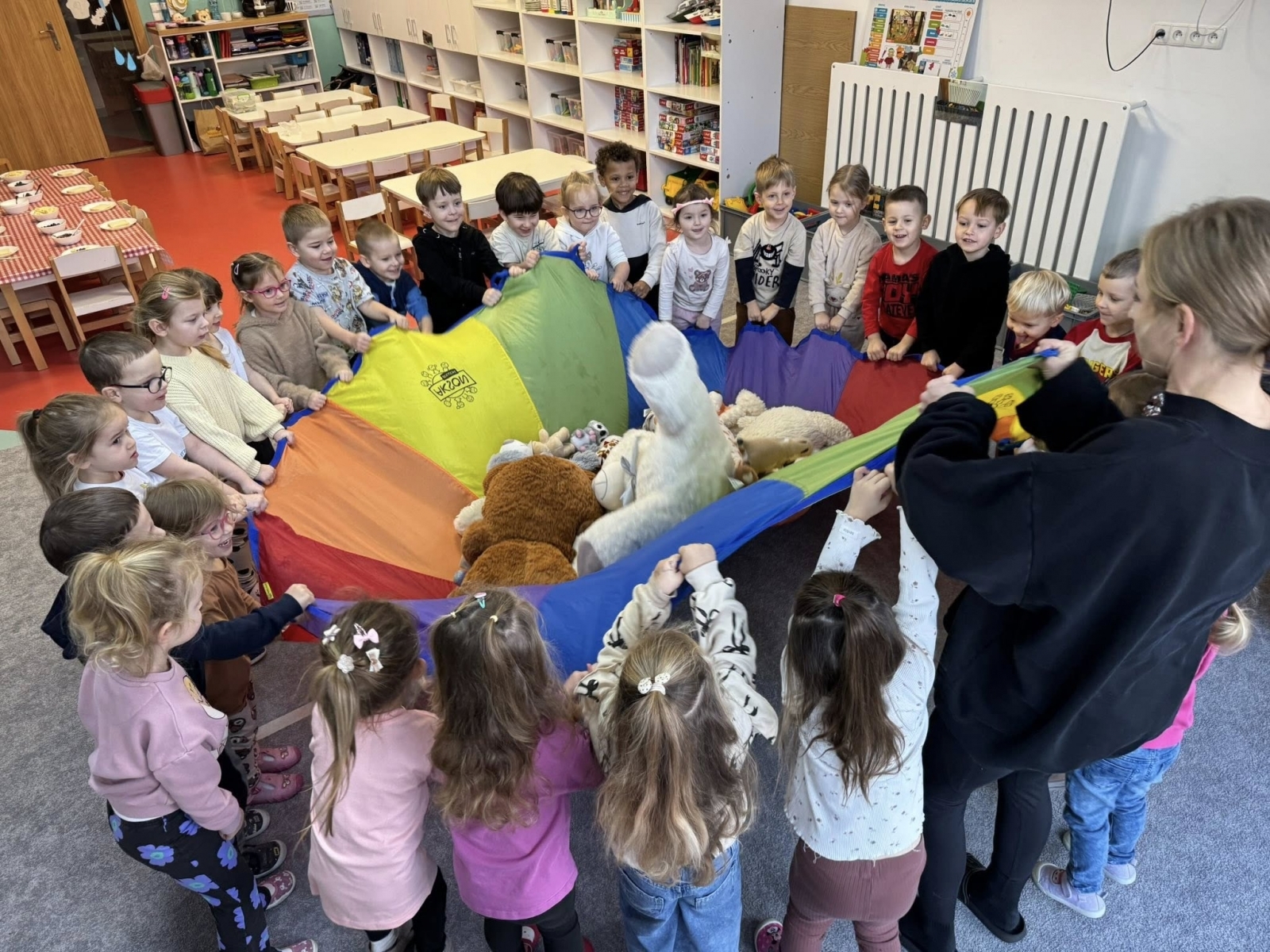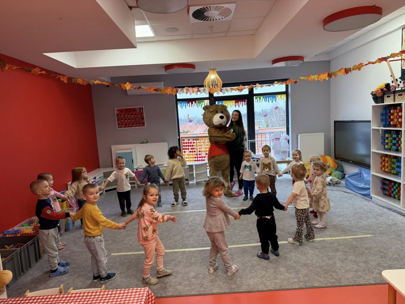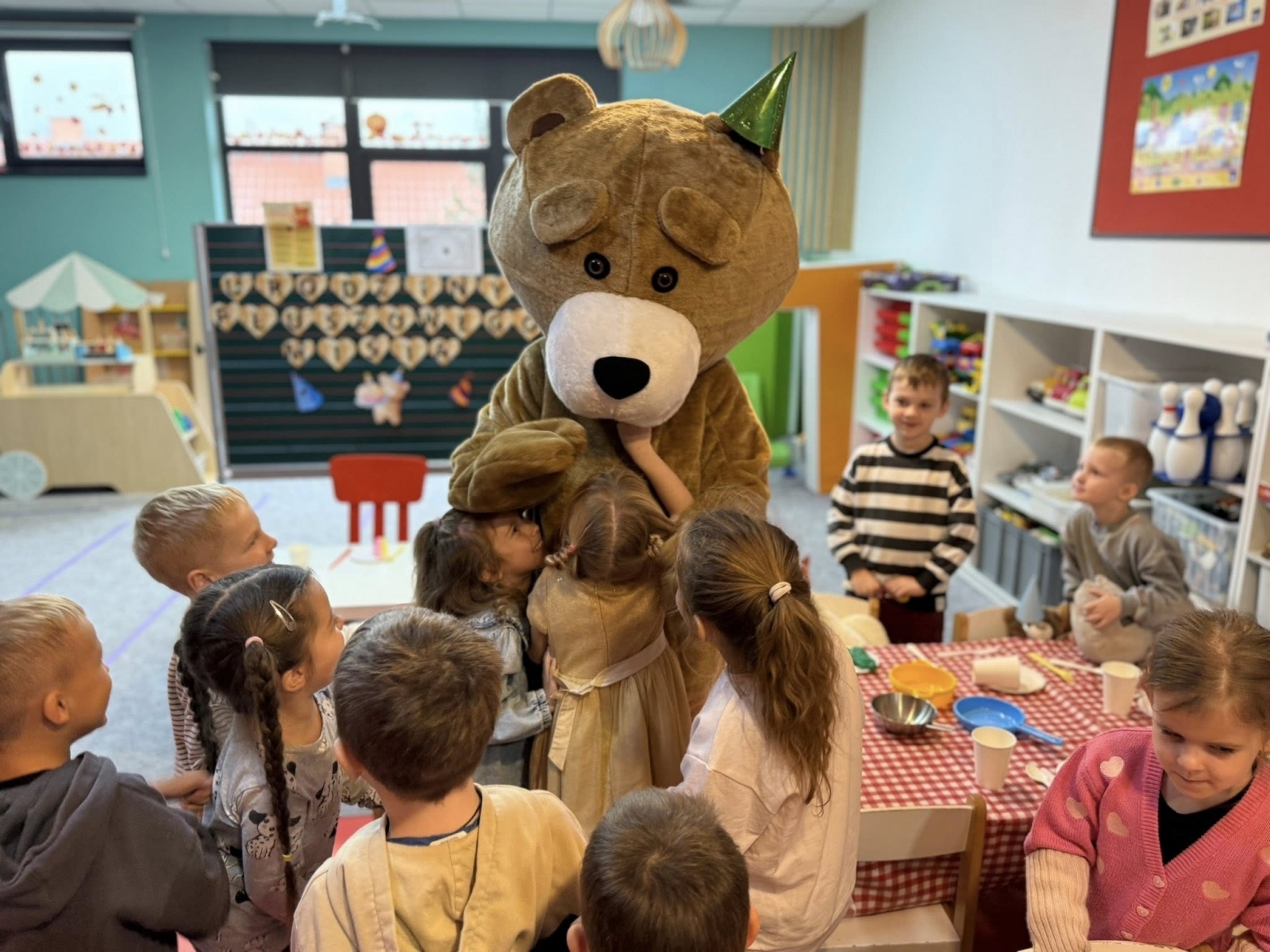 Dzień był pełen aktywności ruchowych i gier w parach z misiami. Dzieci ćwiczyły współpracę, uczyły się dzielić radością i wspólnie rozwiązywać zadania. Największą atrakcją okazała się wizyta „prawdziwego misia”, który tańczył z dziećmi, przybijał piątki i wspólnie bawił się w klasyczną grę „Stary niedźwiedź mocno śpi”. Ten moment wywołał ogromne emocje i sprawił, że święto nabrało magicznego charakteru.
