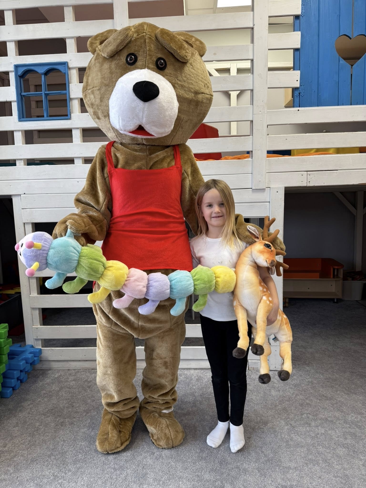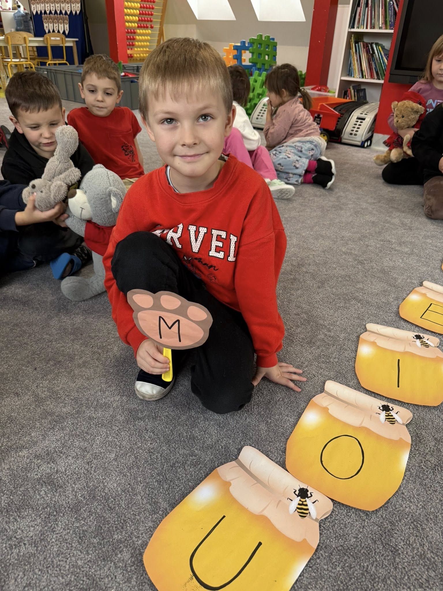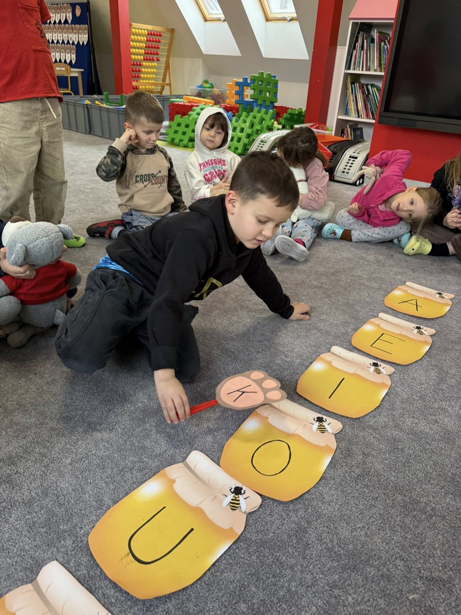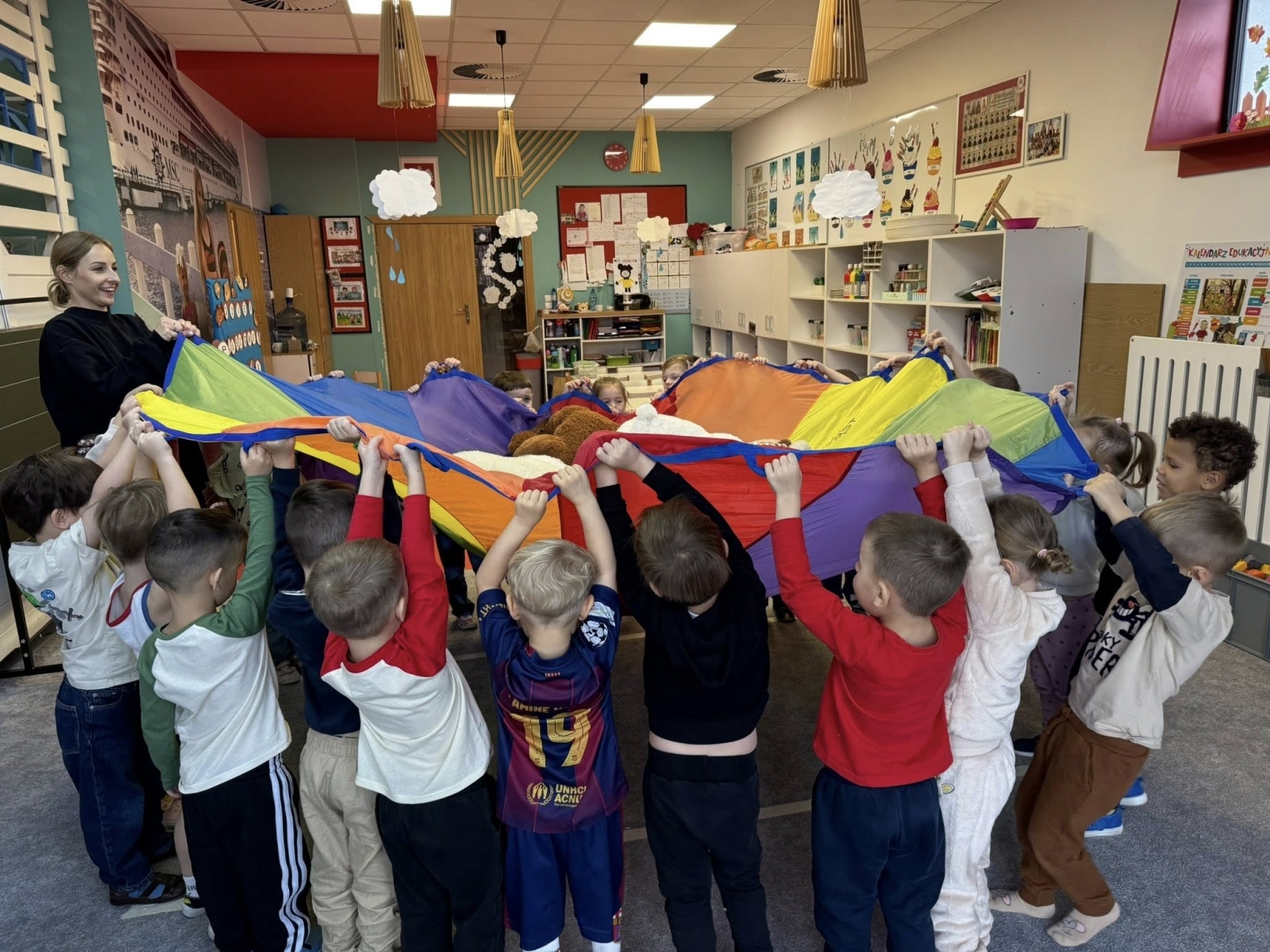 Dzień był pełen aktywności ruchowych i gier w parach z misiami. Dzieci ćwiczyły współpracę, uczyły się dzielić radością i wspólnie rozwiązywać zadania. Największą atrakcją okazała się wizyta „prawdziwego misia”, który tańczył z dziećmi, przybijał piątki i wspólnie bawił się w klasyczną grę „Stary niedźwiedź mocno śpi”. Ten moment wywołał ogromne emocje i sprawił, że święto nabrało magicznego charakteru.