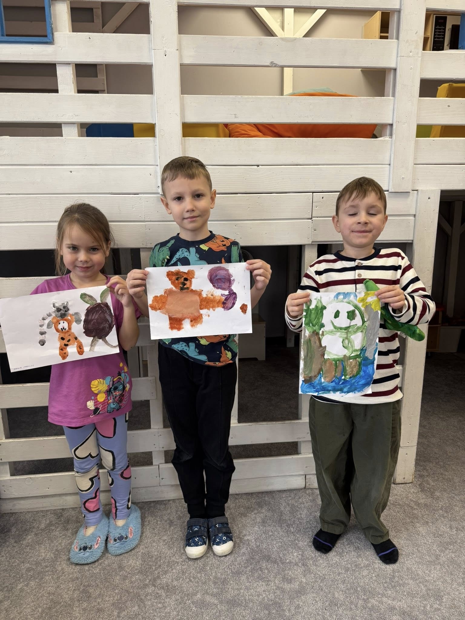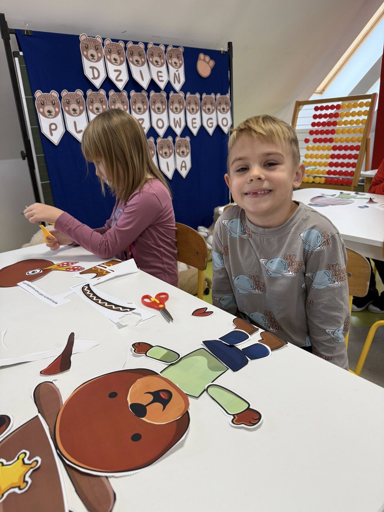 Najmłodsza grupa bawiła się w rytmie tańców i zabaw z misiowym gościem. Dzieci opowiadały o swoich pluszakach, zdradzając ich imiona i historie. Na koniec wykonały prace plastyczne, które zachwyciły kolorami i pomysłowością.