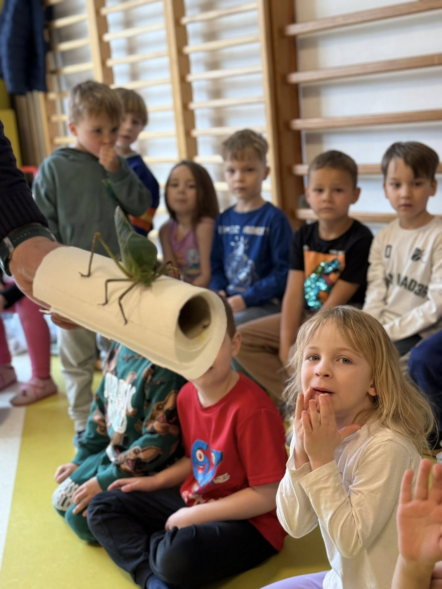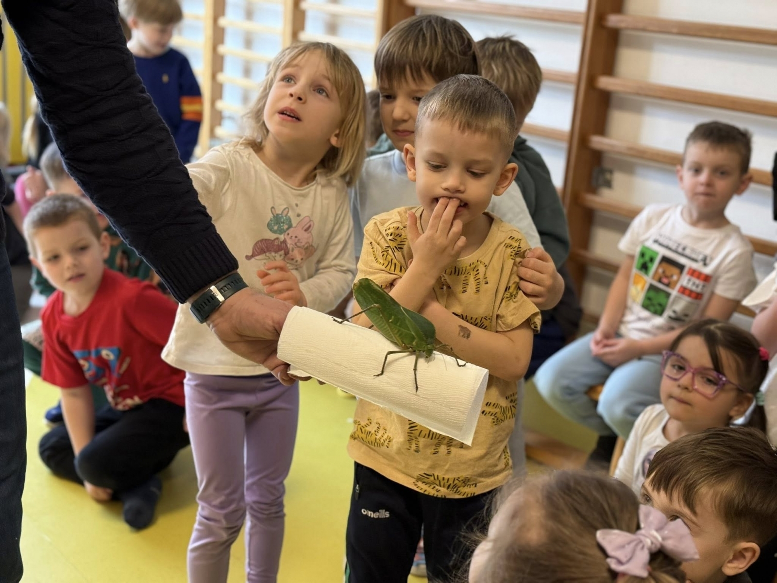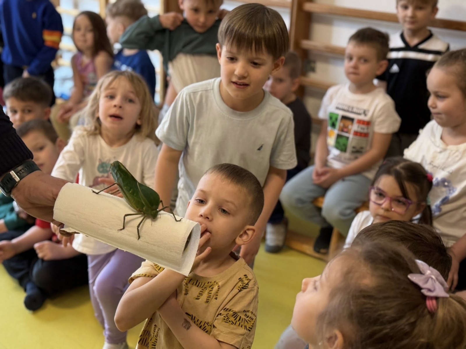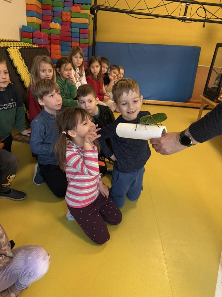 Choć każde zwierzę budziło zainteresowanie, prawdziwą sensacją i niekwestionowaną gwiazdą pokazu okazały się ogromne pasikoniki. Ich niespotykany rozmiar wywołał wśród dzieci falę zachwytu i niedowierzania. To właśnie przy tych owadach nasi podopieczni wykazali się największą odwagą. Spotkanie nie polegało bowiem wyłącznie na oglądaniu zwierząt przez szybę – kluczowym elementem pokazu była możliwość bezpośredniego kontaktu. Pod czujnym i fachowym okiem instruktora, przedszkolaki oraz uczniowie zerówki uczyli się, jak bezpiecznie i delikatnie trzymać te małe cuda natury. Gość pokazywał dzieciom, jak układać zwierzęta na dłoni, a najodważniejsi śmiałkowie zdecydowali się nawet na umieszczenie pasikonika czy patyczaka na czubku głowy, co wywoływało salwy śmiechu i radosne okrzyki.