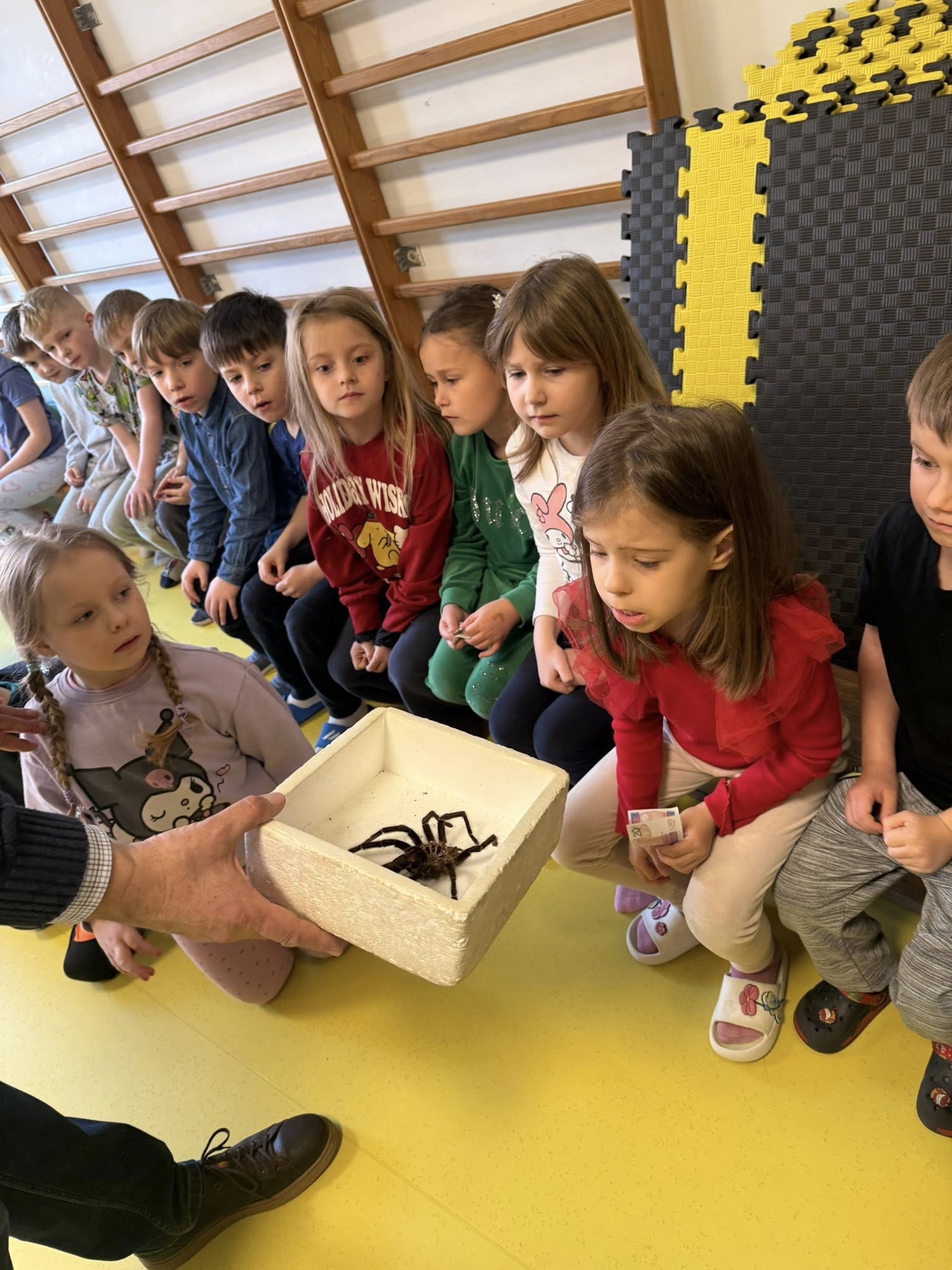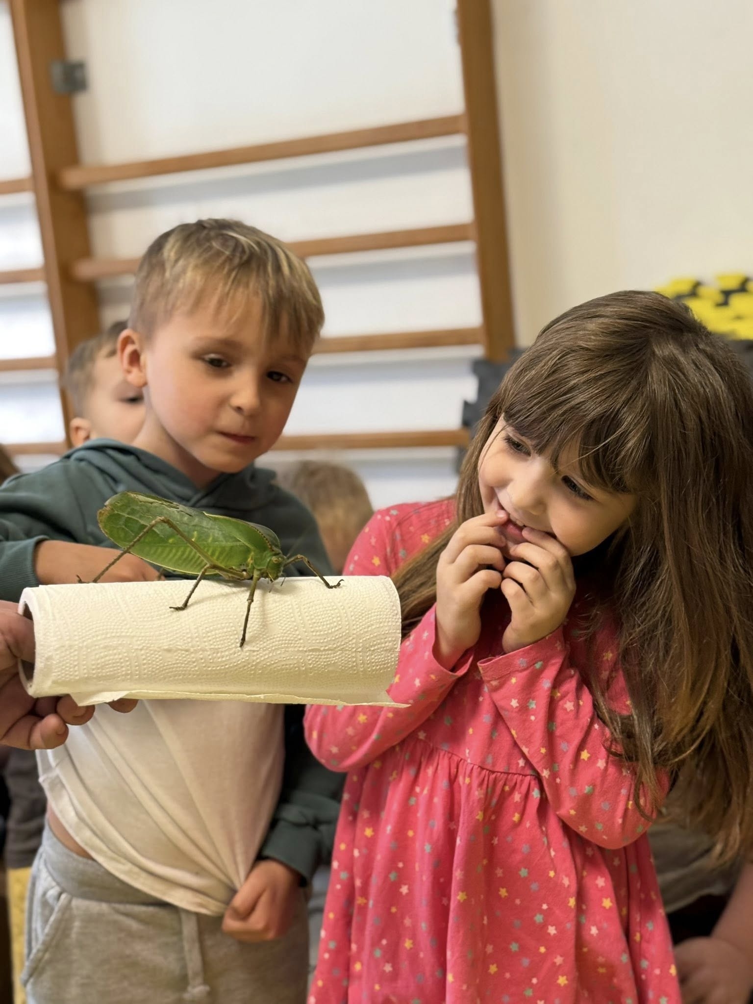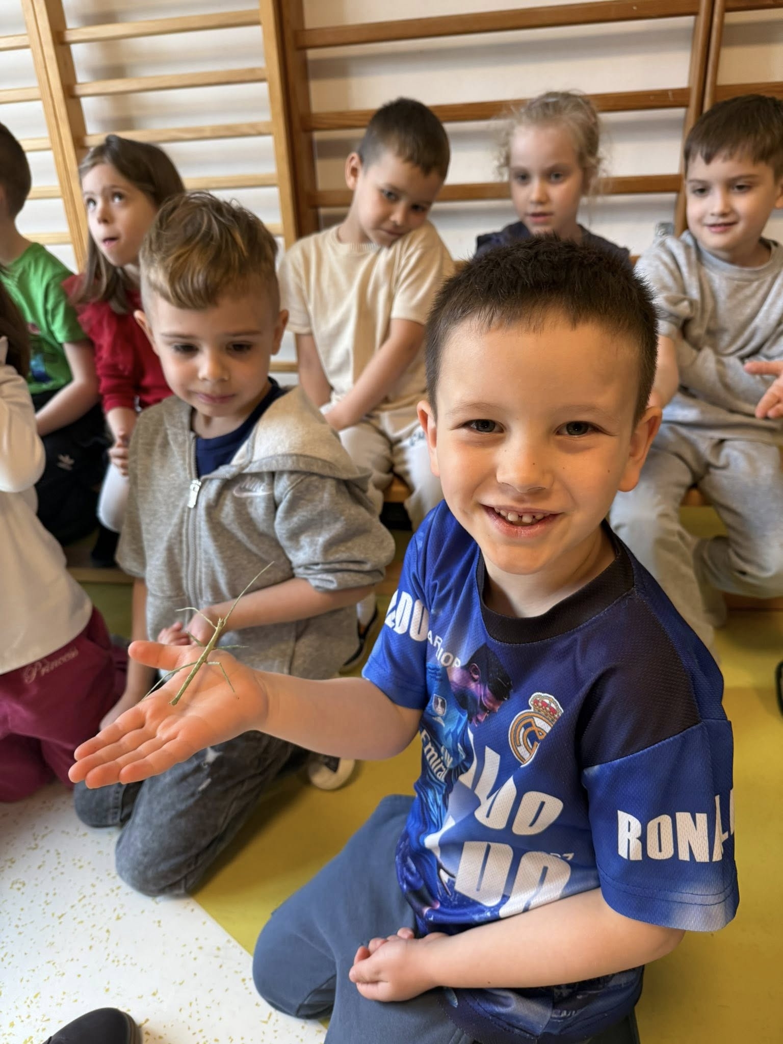 Choć każde zwierzę budziło zainteresowanie, prawdziwą sensacją i niekwestionowaną gwiazdą pokazu okazały się ogromne pasikoniki. Ich niespotykany rozmiar wywołał wśród dzieci falę zachwytu i niedowierzania. To właśnie przy tych owadach nasi podopieczni wykazali się największą odwagą. Spotkanie nie polegało bowiem wyłącznie na oglądaniu zwierząt przez szybę – kluczowym elementem pokazu była możliwość bezpośredniego kontaktu. Pod czujnym i fachowym okiem instruktora, przedszkolaki oraz uczniowie zerówki uczyli się, jak bezpiecznie i delikatnie trzymać te małe cuda natury. Gość pokazywał dzieciom, jak układać zwierzęta na dłoni, a najodważniejsi śmiałkowie zdecydowali się nawet na umieszczenie pasikonika czy patyczaka na czubku głowy, co wywoływało salwy śmiechu i radosne okrzyki.