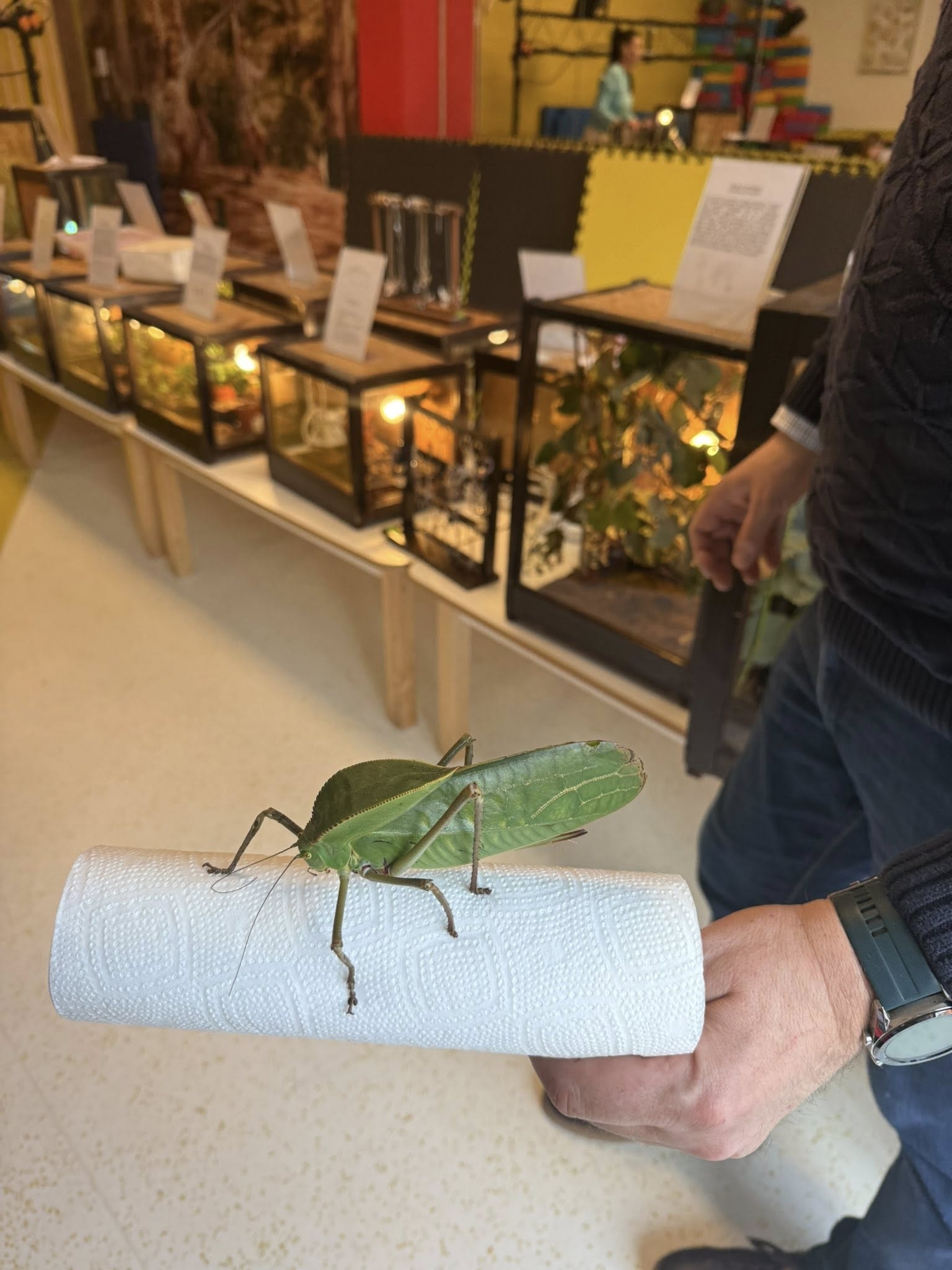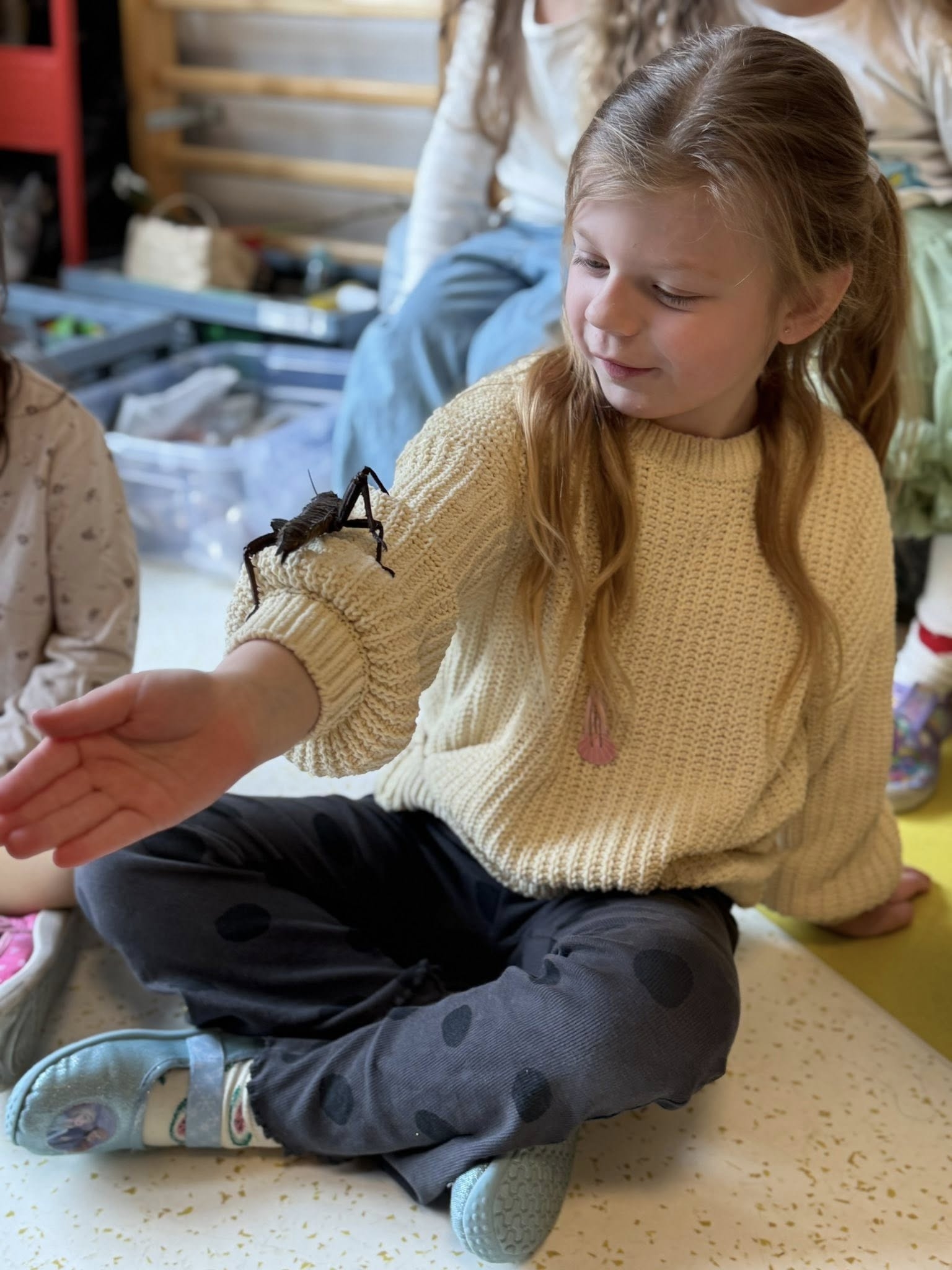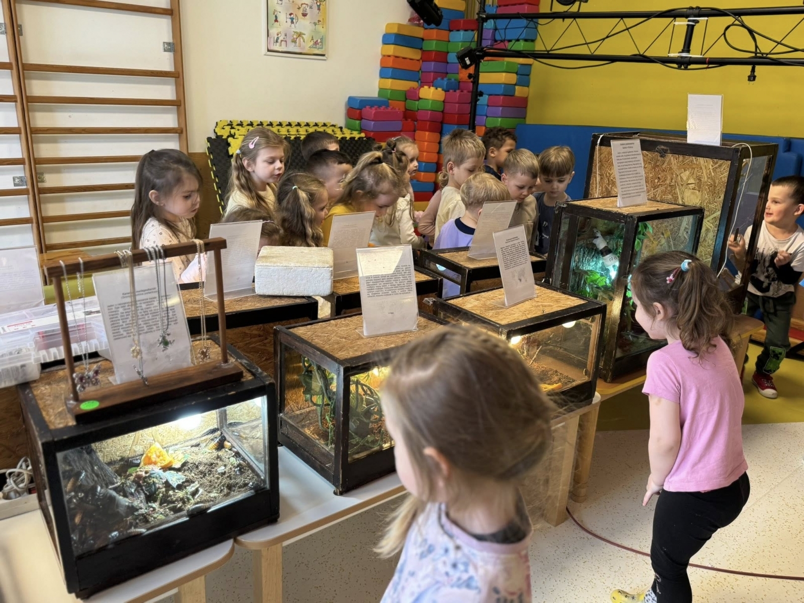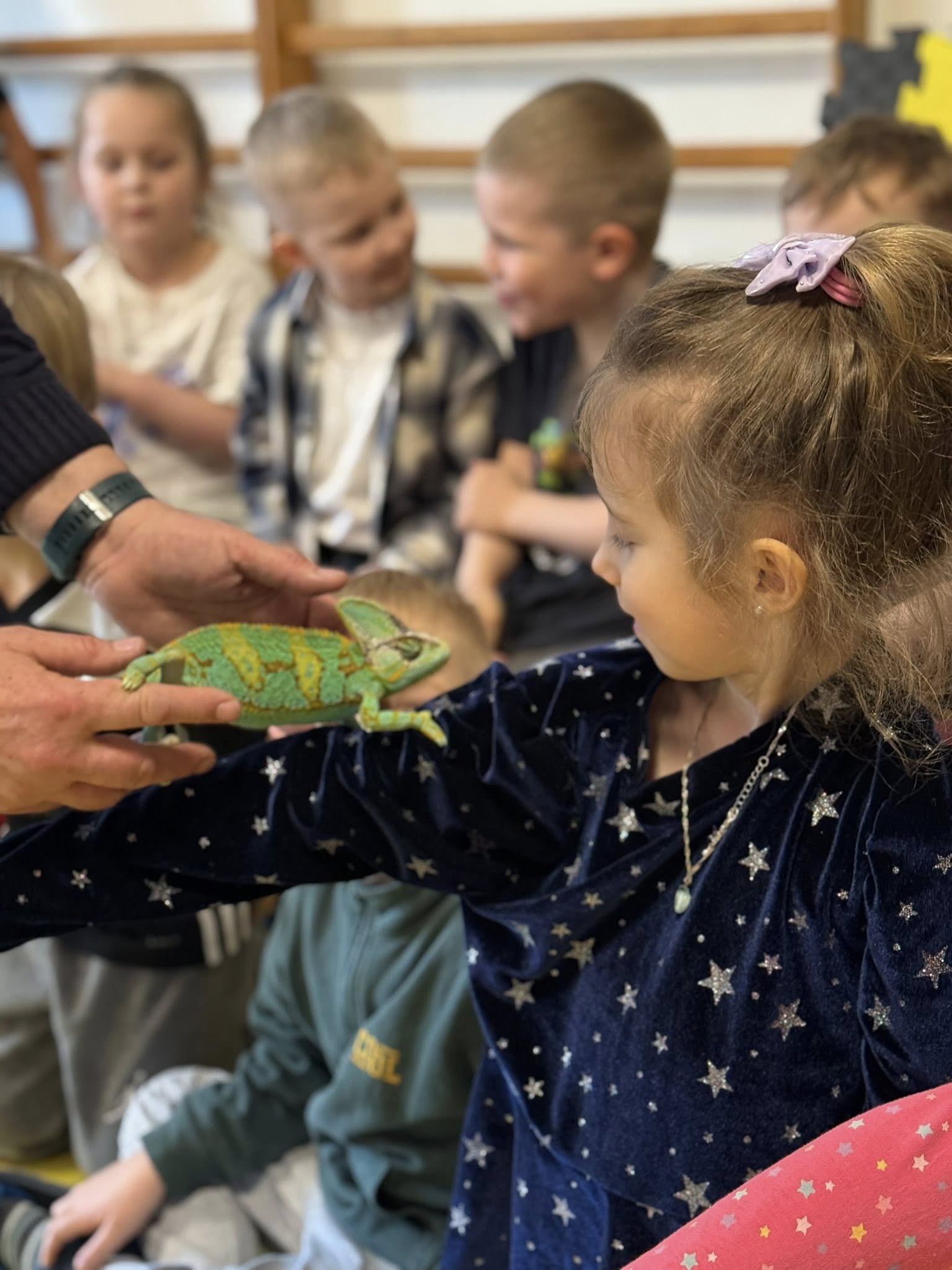 Choć każde zwierzę budziło zainteresowanie, prawdziwą sensacją i niekwestionowaną gwiazdą pokazu okazały się ogromne pasikoniki. Ich niespotykany rozmiar wywołał wśród dzieci falę zachwytu i niedowierzania. To właśnie przy tych owadach nasi podopieczni wykazali się największą odwagą. Spotkanie nie polegało bowiem wyłącznie na oglądaniu zwierząt przez szybę – kluczowym elementem pokazu była możliwość bezpośredniego kontaktu. Pod czujnym i fachowym okiem instruktora, przedszkolaki oraz uczniowie zerówki uczyli się, jak bezpiecznie i delikatnie trzymać te małe cuda natury. Gość pokazywał dzieciom, jak układać zwierzęta na dłoni, a najodważniejsi śmiałkowie zdecydowali się nawet na umieszczenie pasikonika czy patyczaka na czubku głowy, co wywoływało salwy śmiechu i radosne okrzyki.