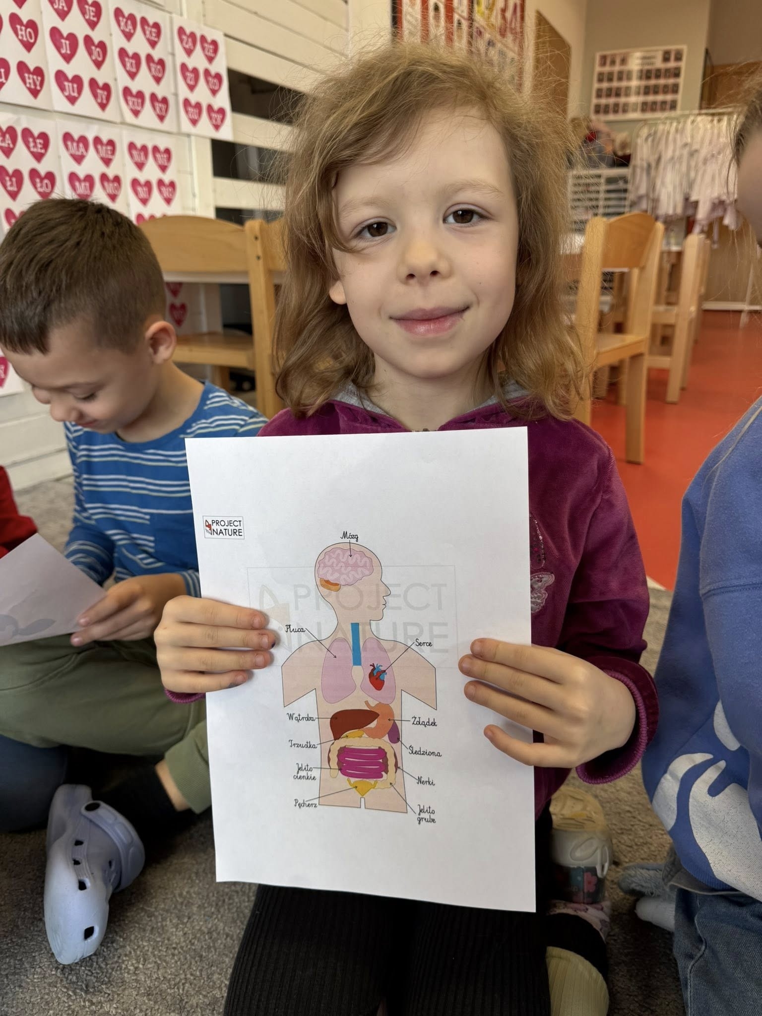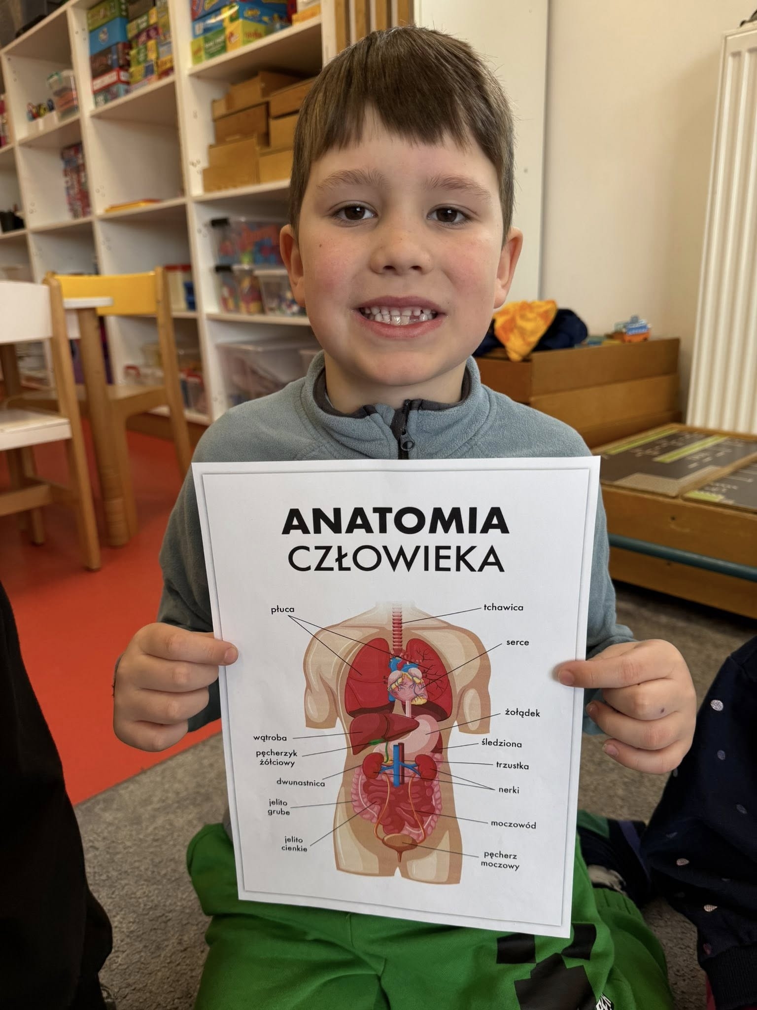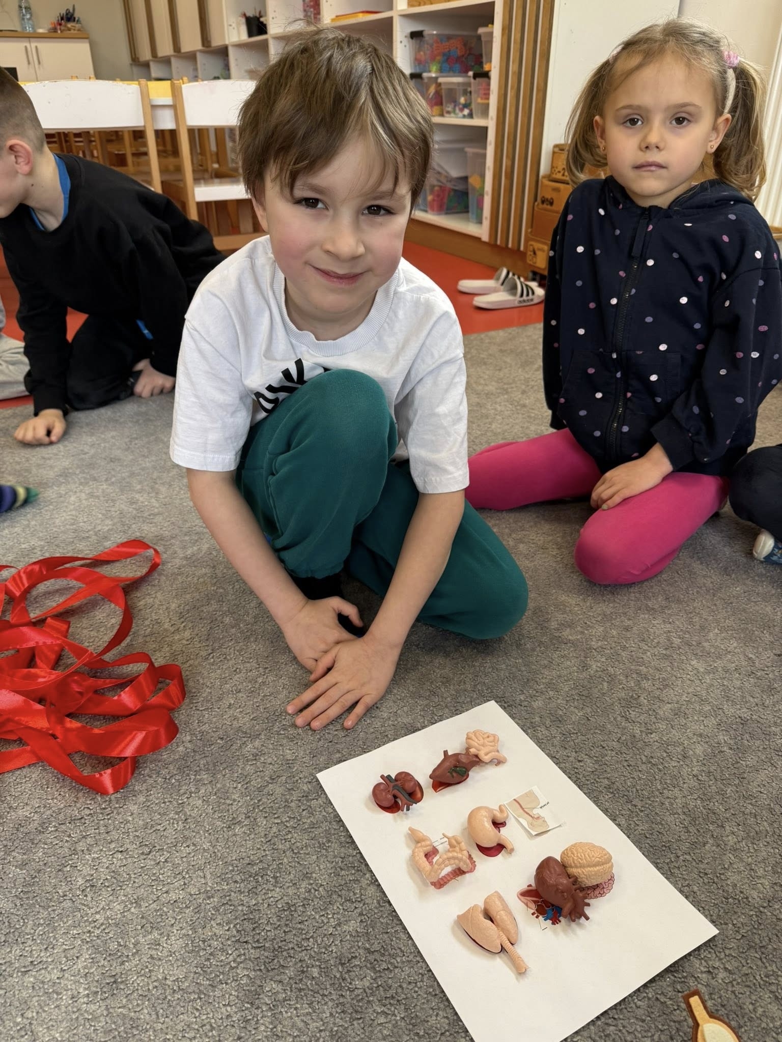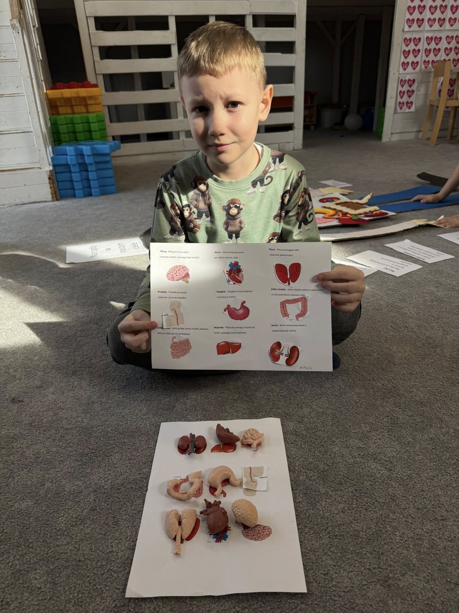 Kiedy już ustaliliśmy, jak dbać o naszą „biologiczną maszynę”, sala zerówki zamieniła się w małe laboratorium medyczne, w którym dzieci mogły obejrzeć realistyczne modele najważniejszych narządów. Wspólnie analizowaliśmy rolę poszczególnych organów, odkrywając, że mózg to nasze centrum dowodzenia pozwalające nam myśleć i zapamiętywać, serce to niestrudzona pompa tłocząca krew, a płuca działają niczym dwa balony dostarczające nam niezbędny tlen.