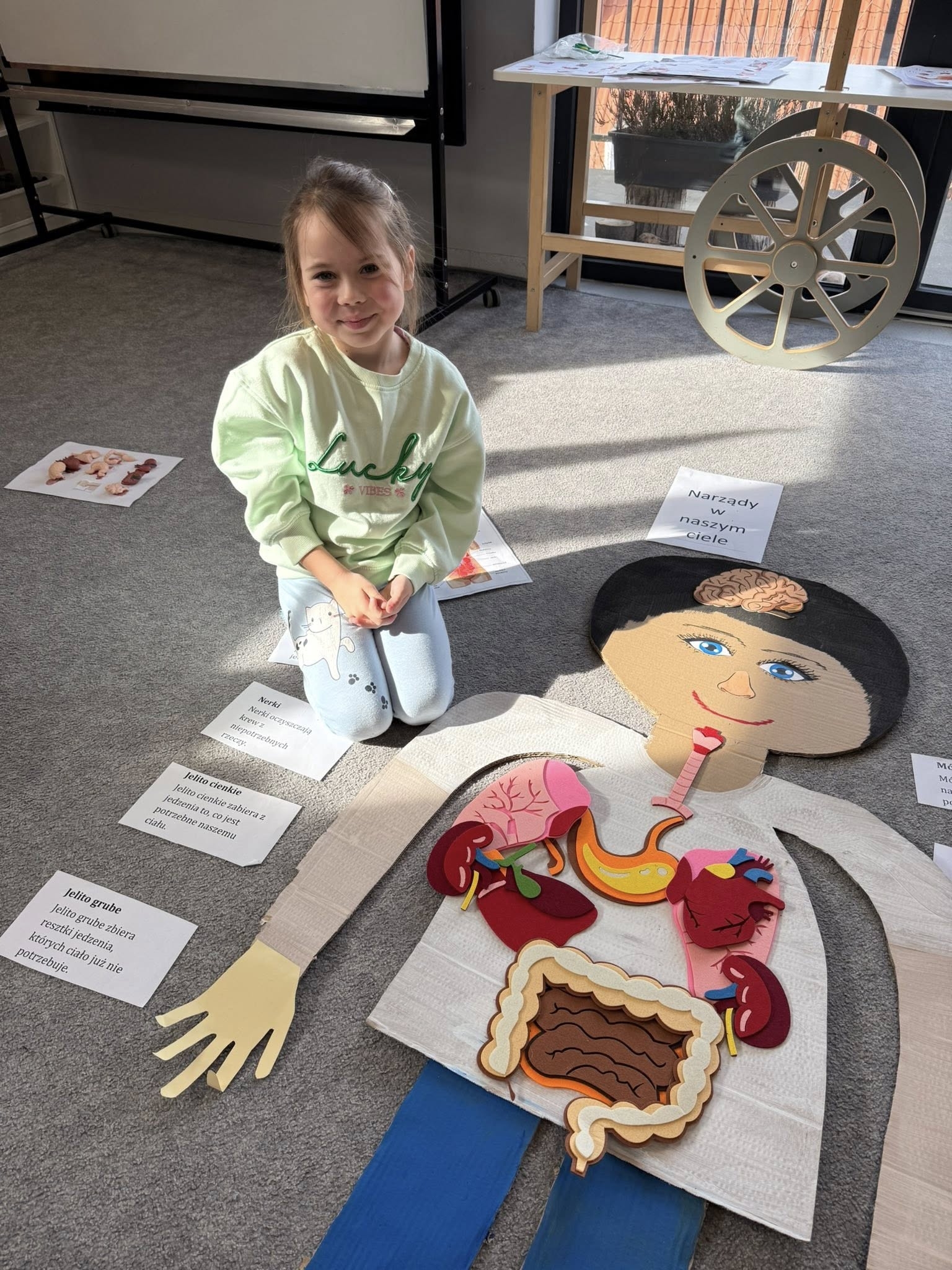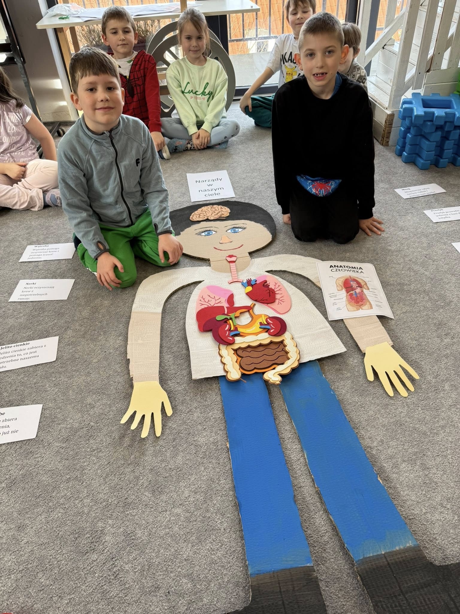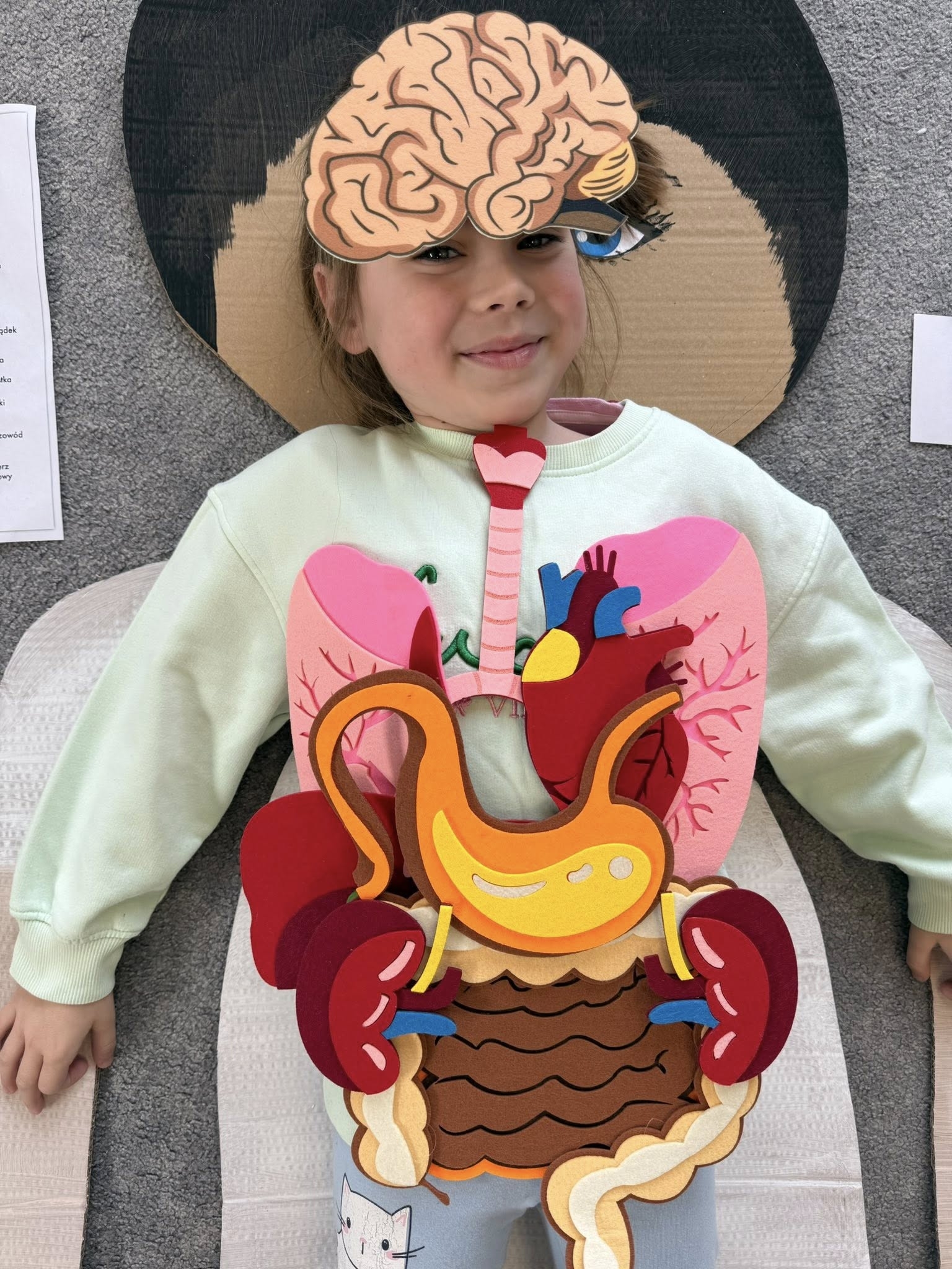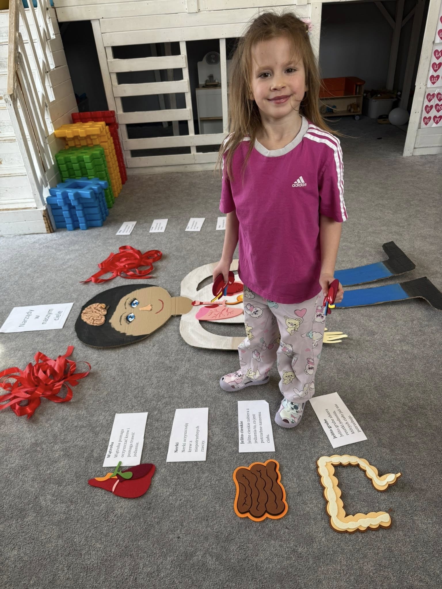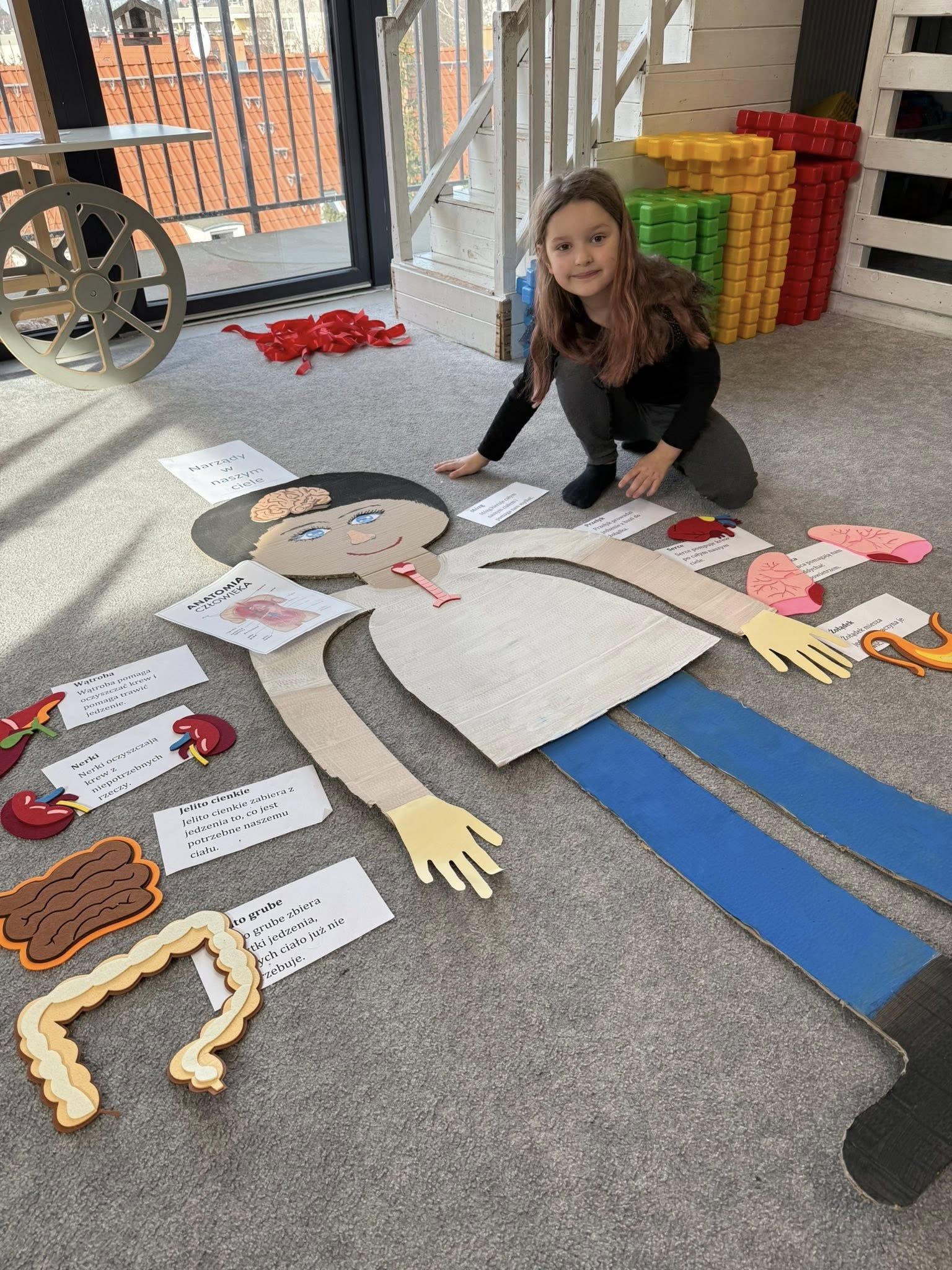 Prawdziwym hitem okazała się jednak zabawa ruchowa, podczas której dzieci mogły przyłożyć modele narządów do własnego ciała i zobaczyć, gdzie dokładnie się one znajdują, co podziałało na wyobraźnię lepiej niż jakikolwiek podręcznik. Dodatkowo dzieci zamieniły się w Detektywów Zdrowia, losując przedmioty z Magicznego Pudełka i dopasowując odnalezione słowa do sylwetki detektywa, a zwieńczeniem tych działań była praca plastyczna „Mój zdrowy talerz”.
