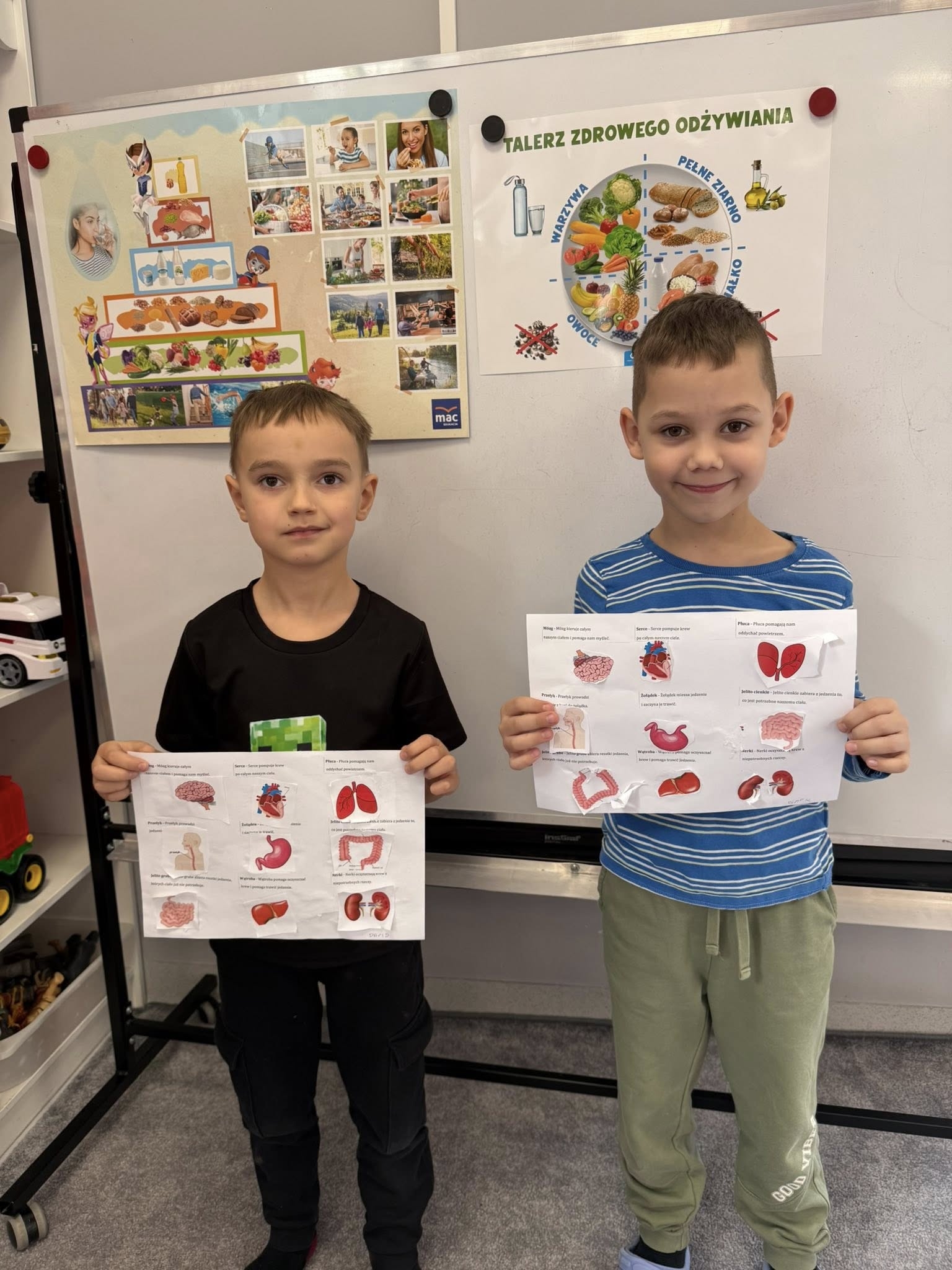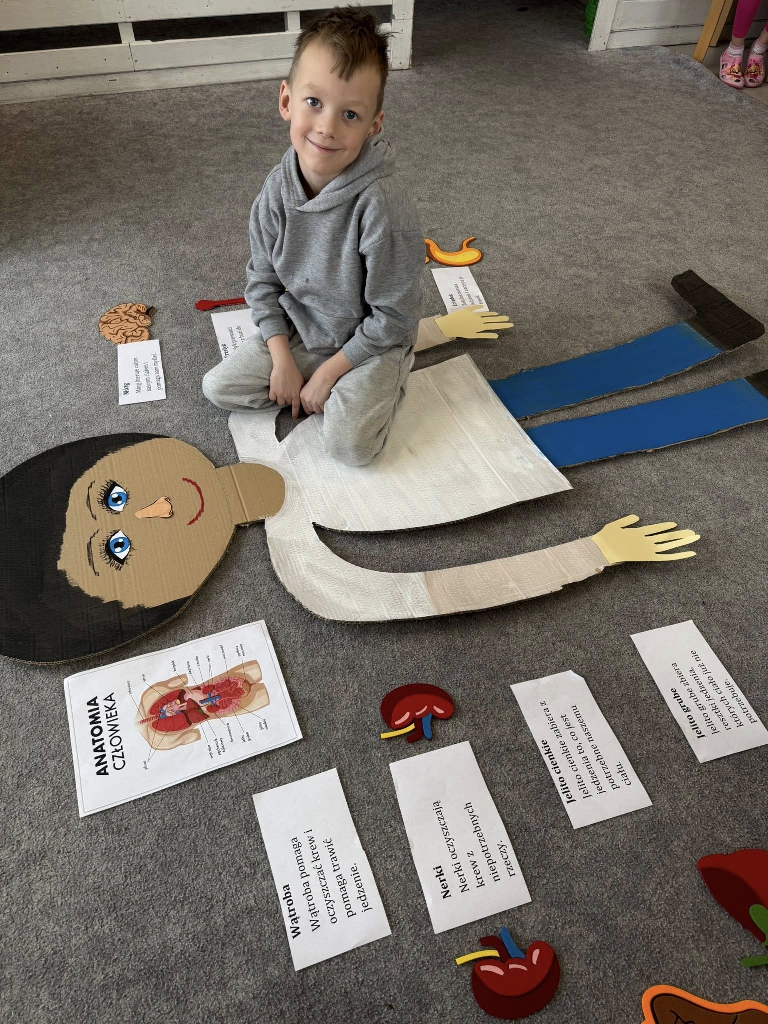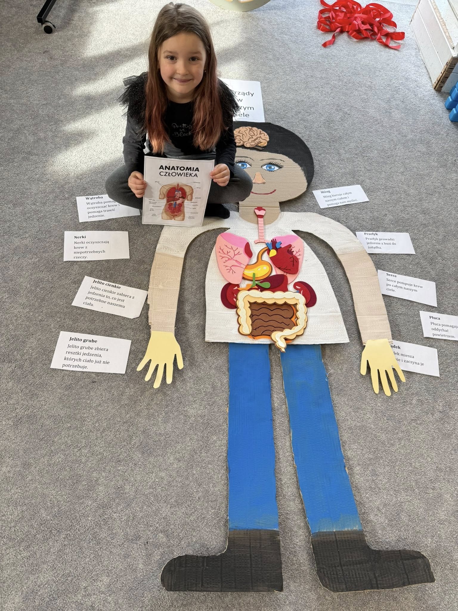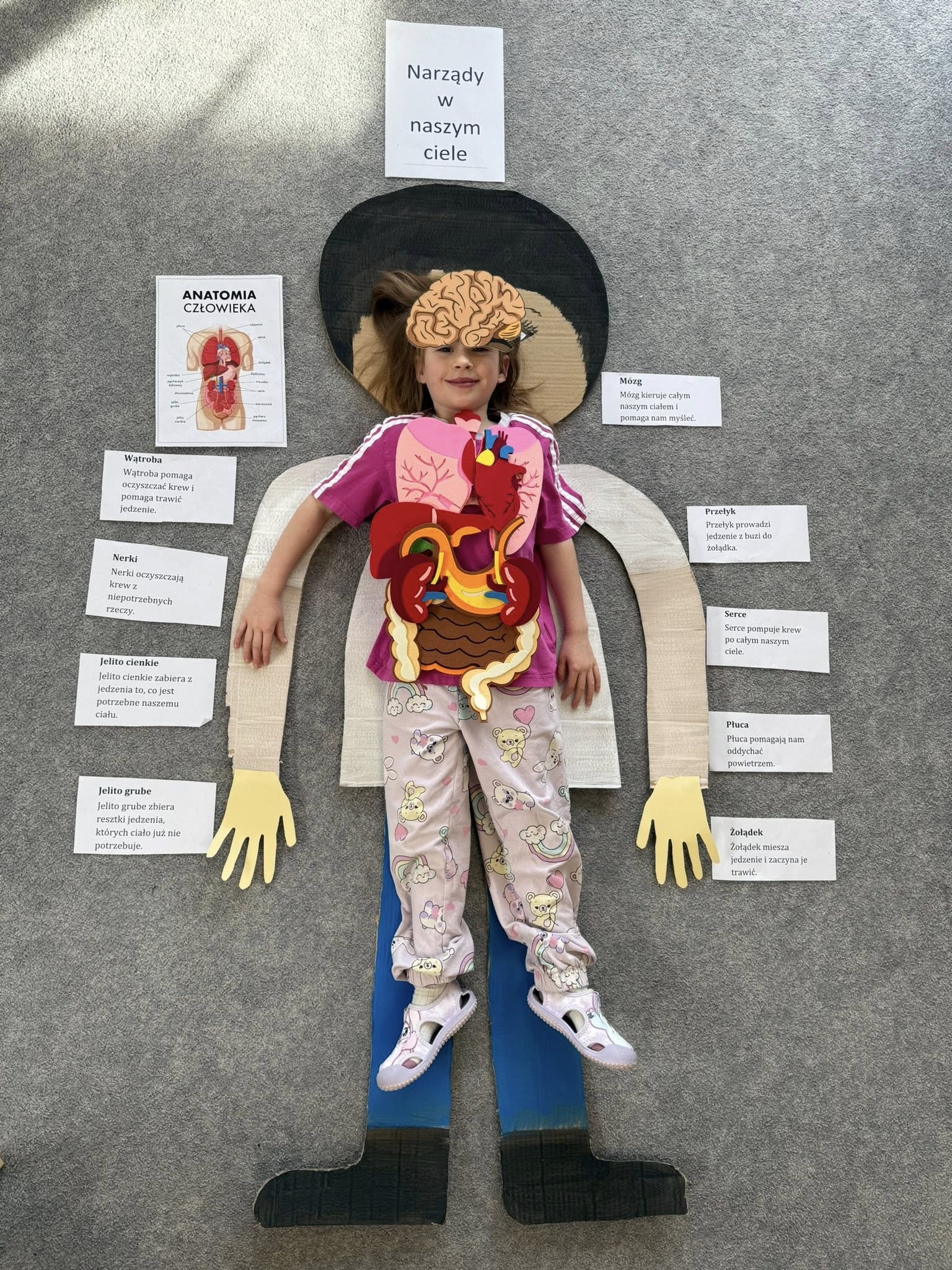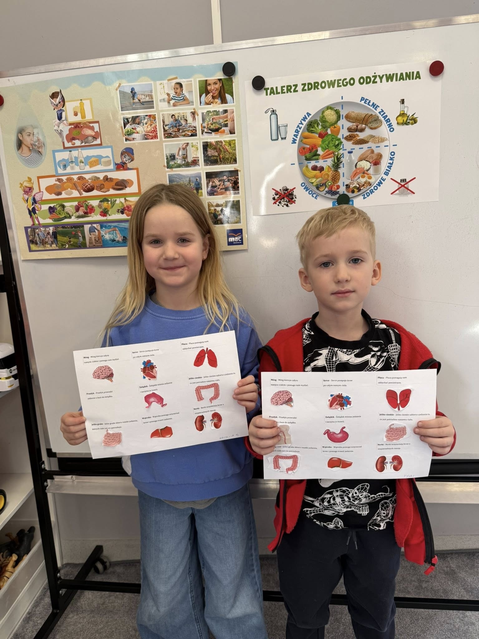 Prawdziwym hitem okazała się jednak zabawa ruchowa, podczas której dzieci mogły przyłożyć modele narządów do własnego ciała i zobaczyć, gdzie dokładnie się one znajdują, co podziałało na wyobraźnię lepiej niż jakikolwiek podręcznik. Dodatkowo dzieci zamieniły się w Detektywów Zdrowia, losując przedmioty z Magicznego Pudełka i dopasowując odnalezione słowa do sylwetki detektywa, a zwieńczeniem tych działań była praca plastyczna „Mój zdrowy talerz”.