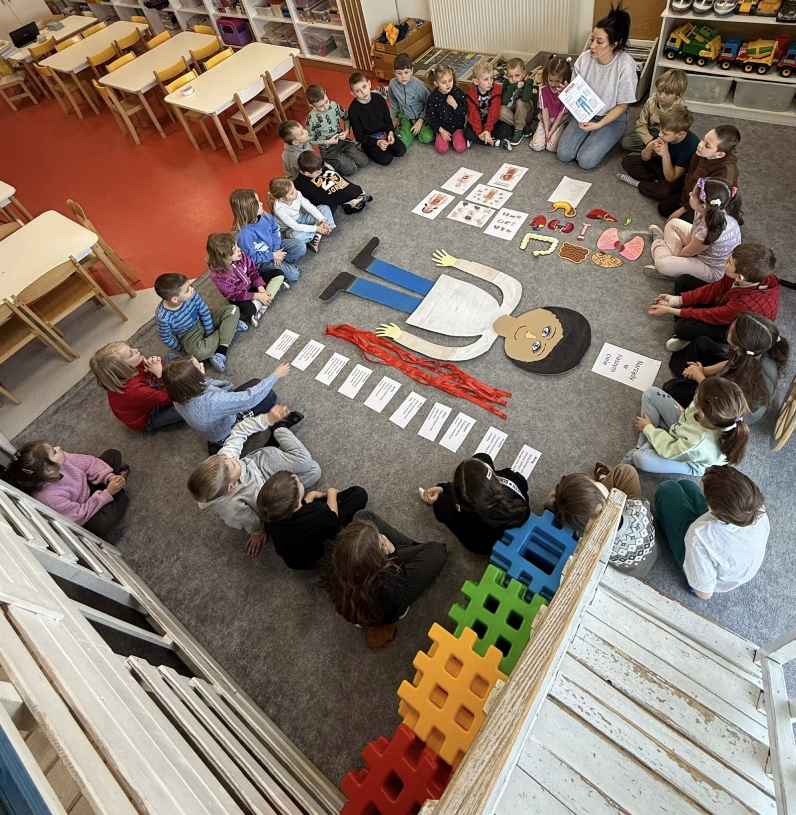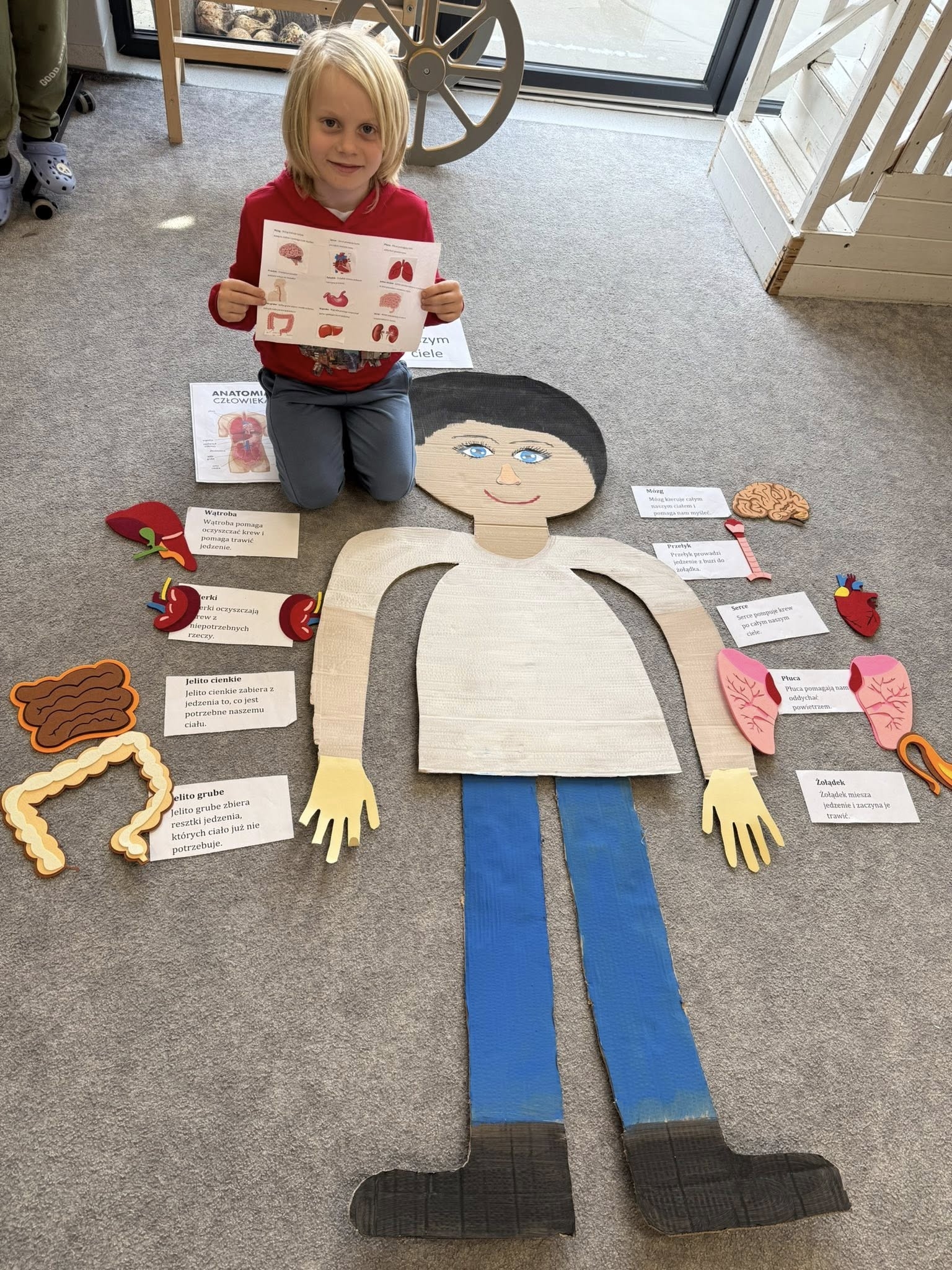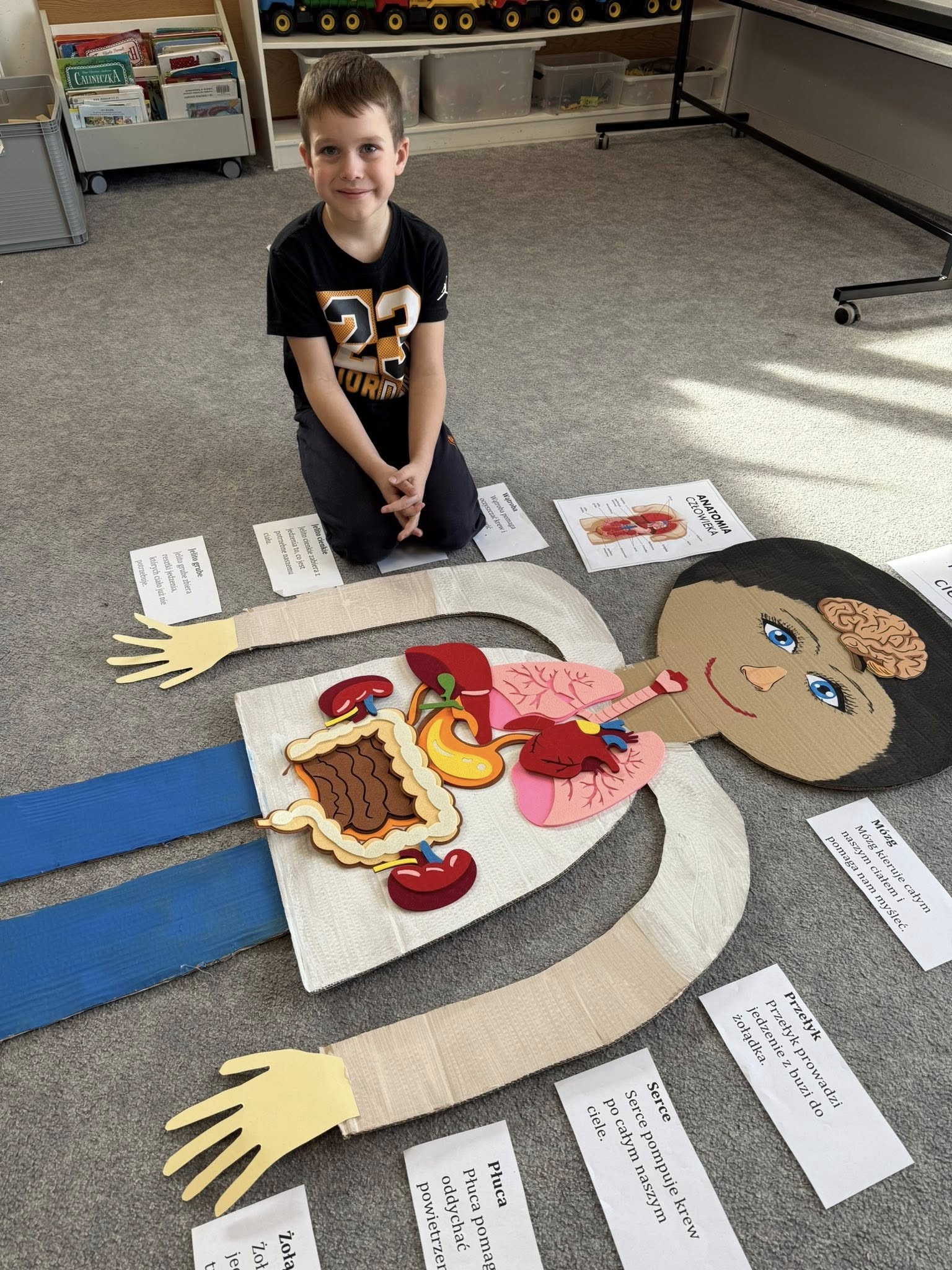 Dowiedzieliśmy się również, że żołądek, wątroba i jelita współpracują ze sobą, by trawić jedzenie i zamieniać je w energię potrzebną do biegania i skakania. To, co wyróżnia zajęcia w Żłobku, Przedszkolu i Zerówce Mały Europejczyk w Elblągu, to nacisk na praktykę, dlatego przedszkolaki z ogromnym skupieniem dopasowywały nazwy narządów do ilustracji, a następnie samodzielnie rozmieszczały poszczególne organy na dużej postaci wykonanej z kartonu.