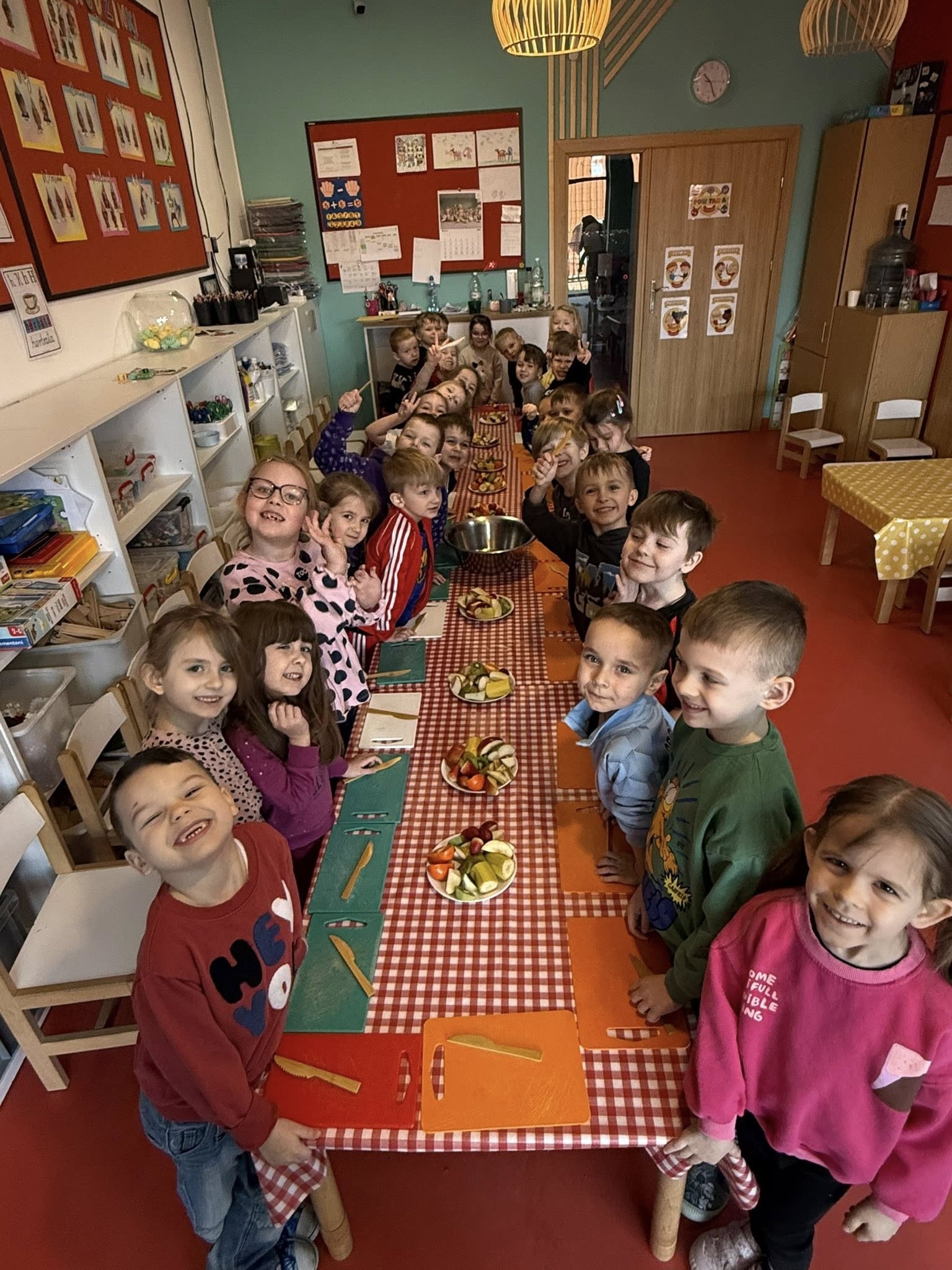 Czwartek był dniem owoców, podczas którego nie tylko rozmawialiśmy o ich właściwościach, ale również analizowaliśmy ich nazwy, dzieląc je na sylaby, głoski i litery. Dowiedzieliśmy się wtedy, że niektóre głoski, jak „sz” w słowie gruszka, składają się z dwóch liter, a zwieńczeniem dnia było samodzielne przygotowanie i zjedzenie pysznej sałatki owocowej na drugie śniadanie.