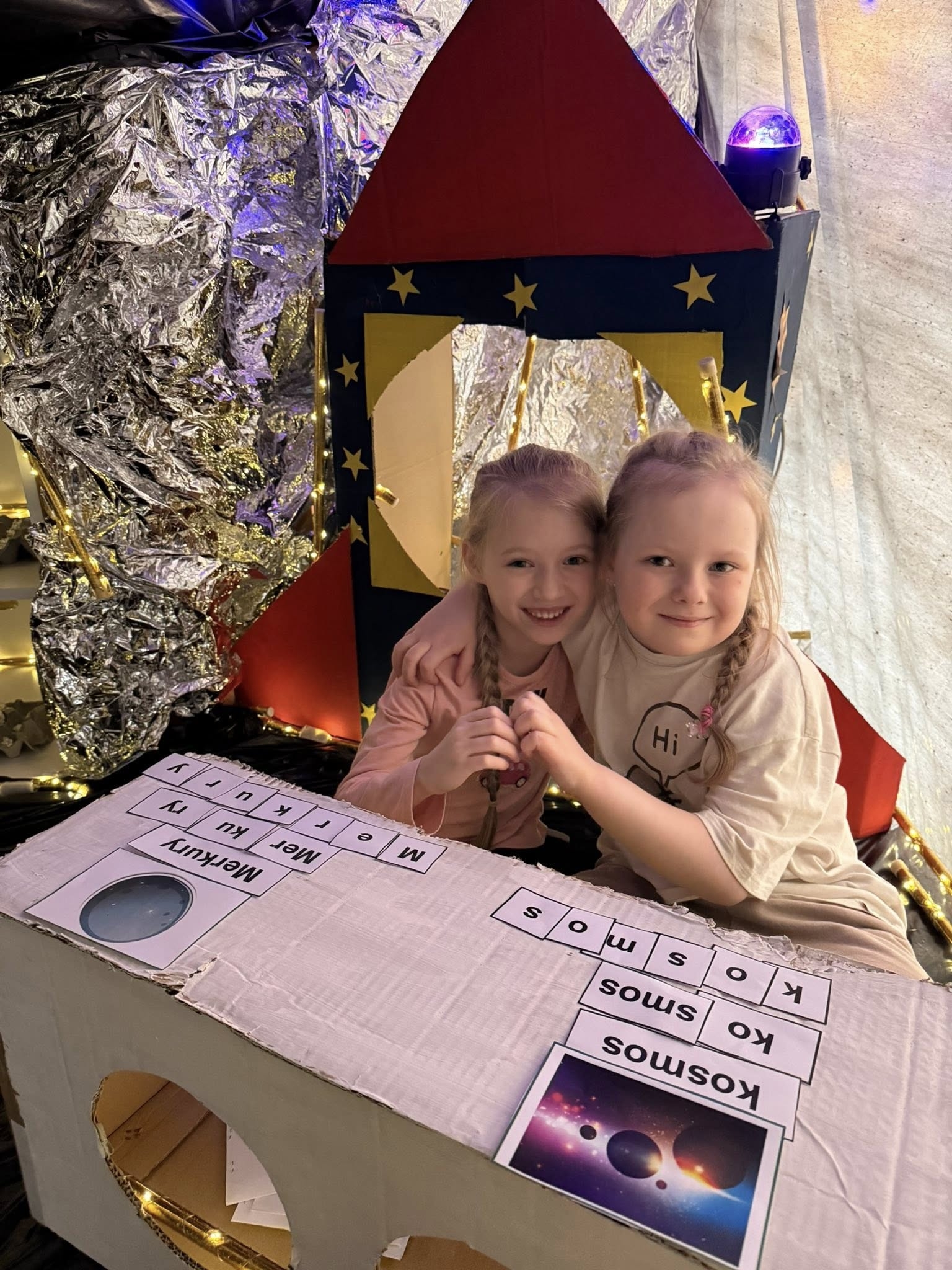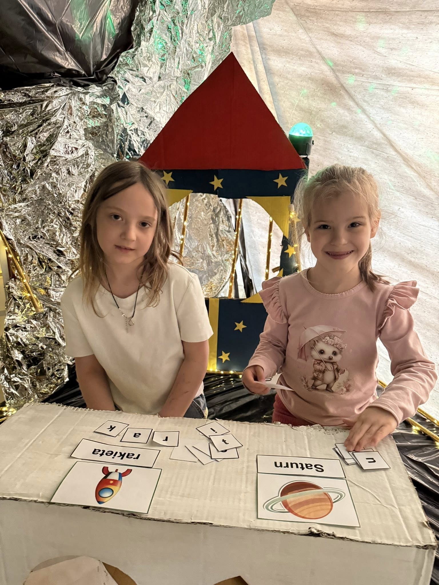 Nauka w naszej placówce zawsze idzie w parze z zabawą, dlatego kosmiczny motyw wykorzystaliśmy do rozwijania kluczowych umiejętności. Dzieci spróbowały swoich sił w „kosmicznej matematyce” – rozwiązując zadania, ćwiczyły nie tylko biegłość w liczeniu, ale przede wszystkim skupienie i precyzję, tak niezbędną każdemu przyszłemu naukowcowi. Wielką popularnością cieszyło się międzyplanetarne koło fortuny, które wylosowywało kolejne wyzwania. Nie zabrakło również ćwiczeń językowych. Podczas zabaw z literami dzieci układały wyrazy związane z kosmosem, co stało się doskonałym treningiem umiejętności czytania i budowania słownictwa w atmosferze radosnej przygody.