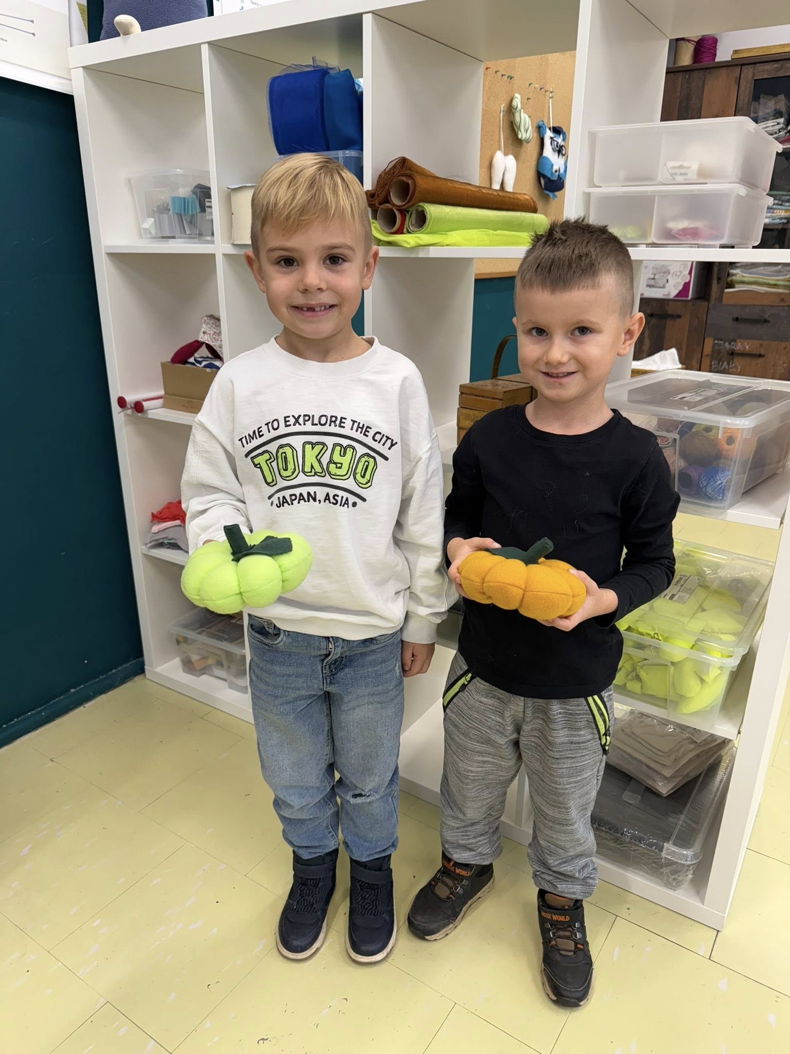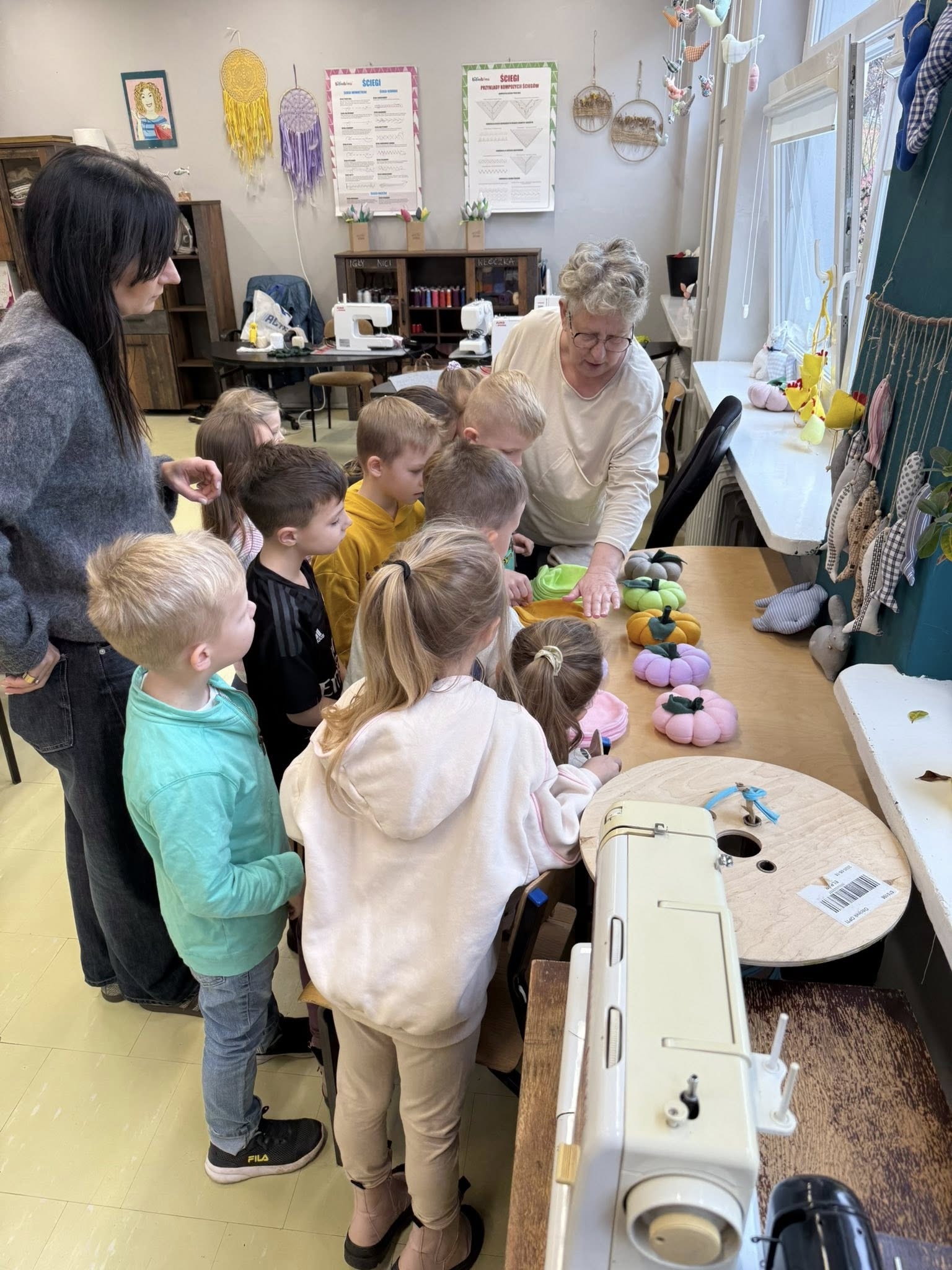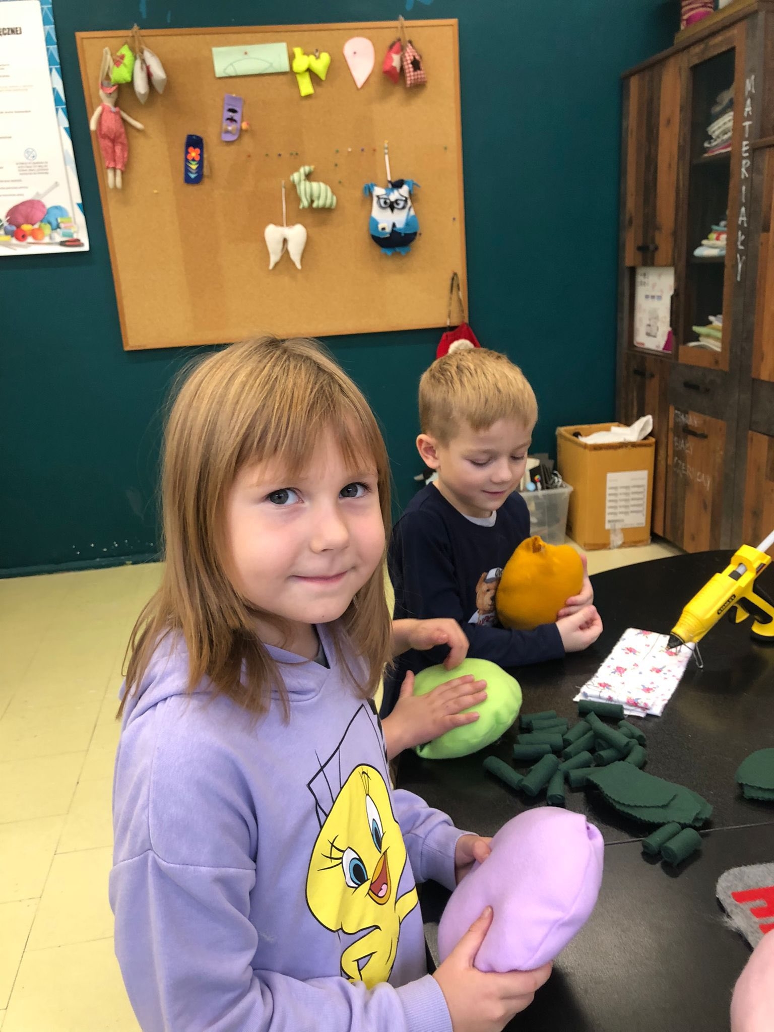 Jednym z najciekawszych punktów programu były warsztaty krawieckie, podczas których dzieci samodzielnie wykonały kolorowe dynie z materiału. Z pomocą prowadzących, mali uczestnicy z ogromnym zaangażowaniem szyli, wypełniali i dekorowali swoje prace. Efekty były zachwycające – każda dynia była inna, wyjątkowa, pełna dziecięcej wyobraźni i radości tworzenia. Warsztaty nie tylko rozwijały zdolności manualne, ale także uczyły cierpliwości, współpracy i dumy z własnych osiągnięć.
