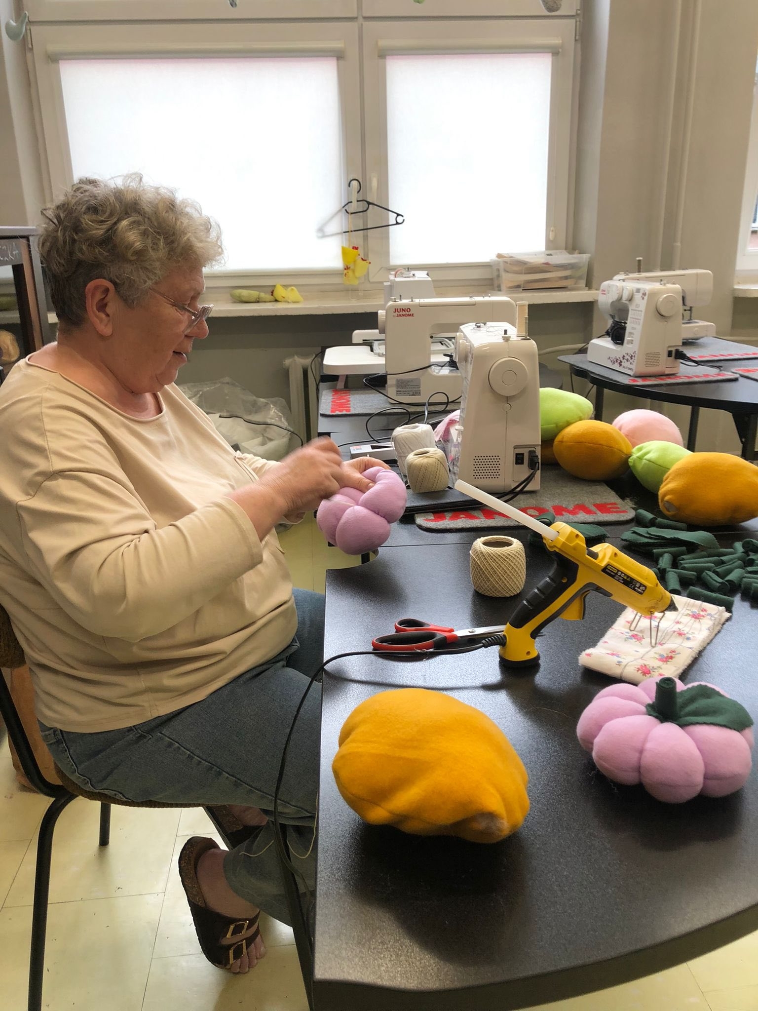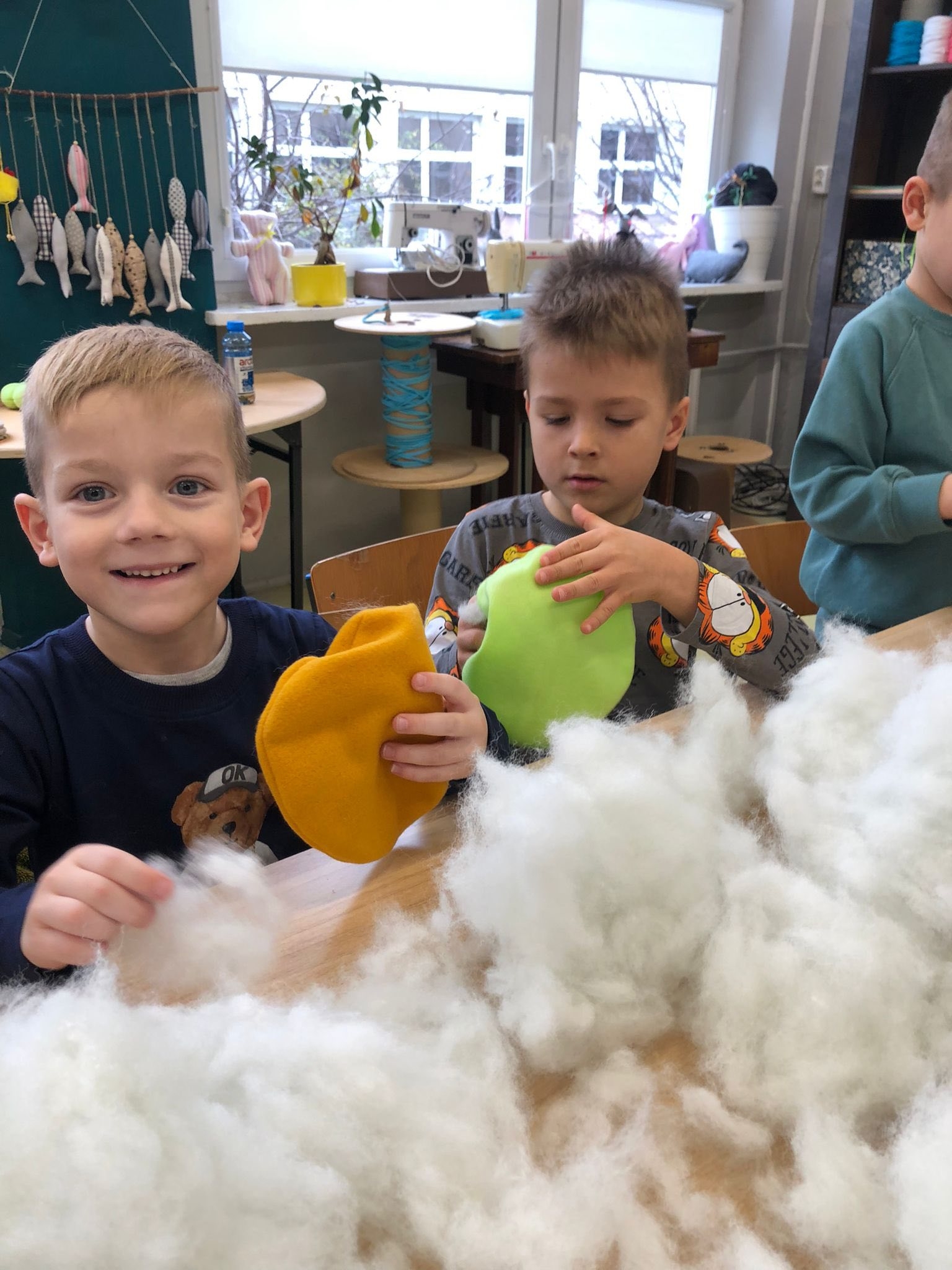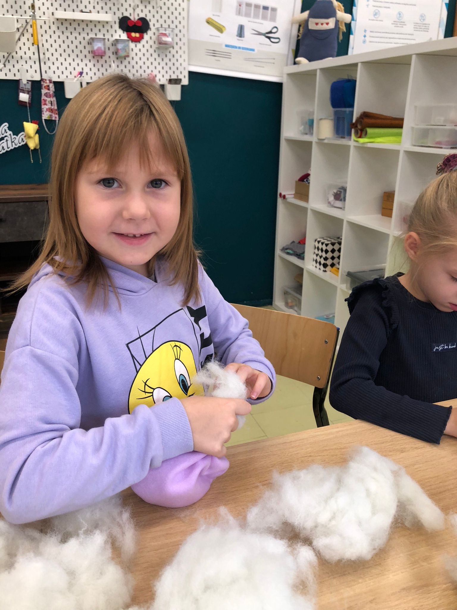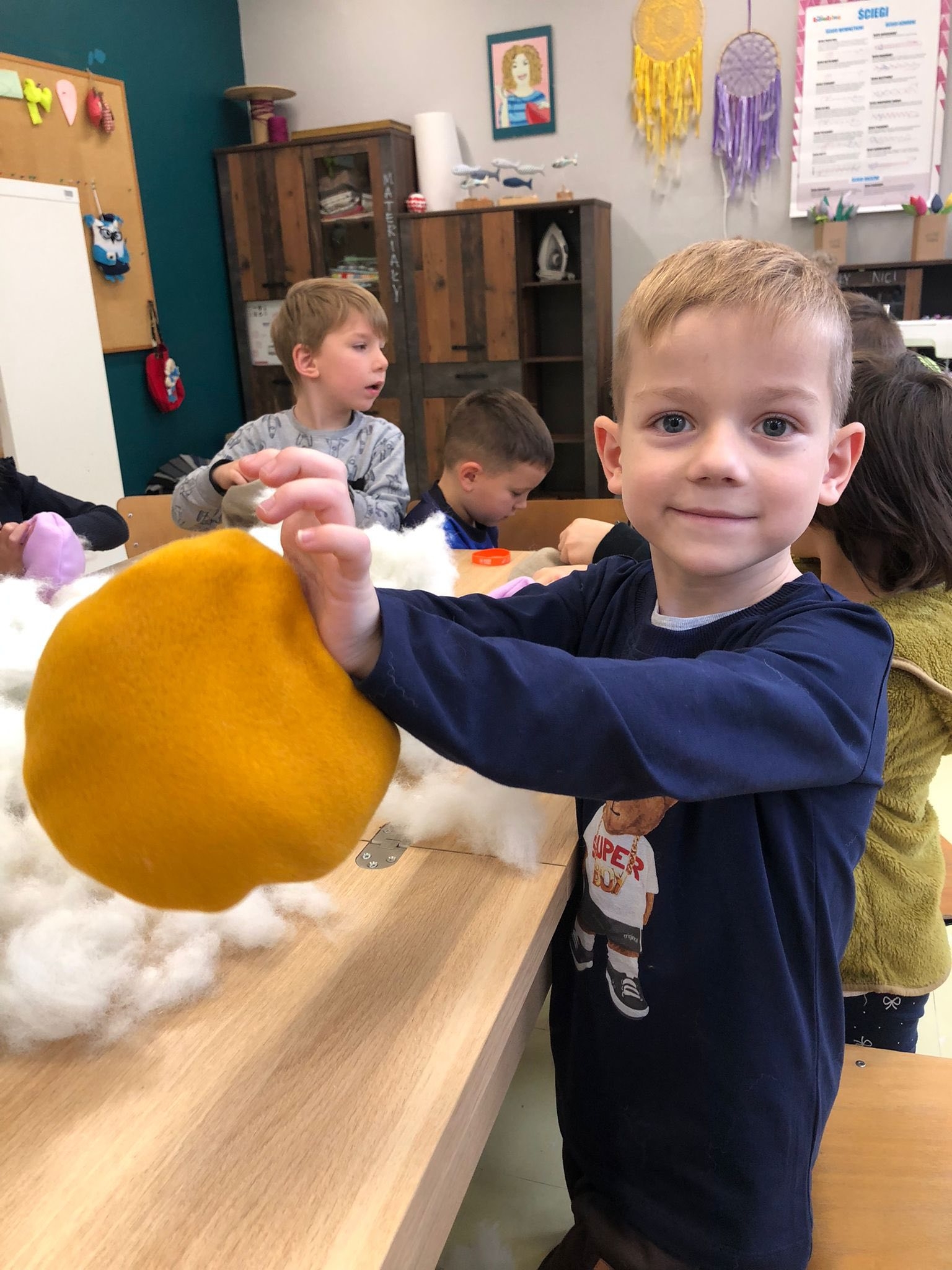 Jednym z najciekawszych punktów programu były warsztaty krawieckie, podczas których dzieci samodzielnie wykonały kolorowe dynie z materiału. Z pomocą prowadzących, mali uczestnicy z ogromnym zaangażowaniem szyli, wypełniali i dekorowali swoje prace. Efekty były zachwycające – każda dynia była inna, wyjątkowa, pełna dziecięcej wyobraźni i radości tworzenia. Warsztaty nie tylko rozwijały zdolności manualne, ale także uczyły cierpliwości, współpracy i dumy z własnych osiągnięć.