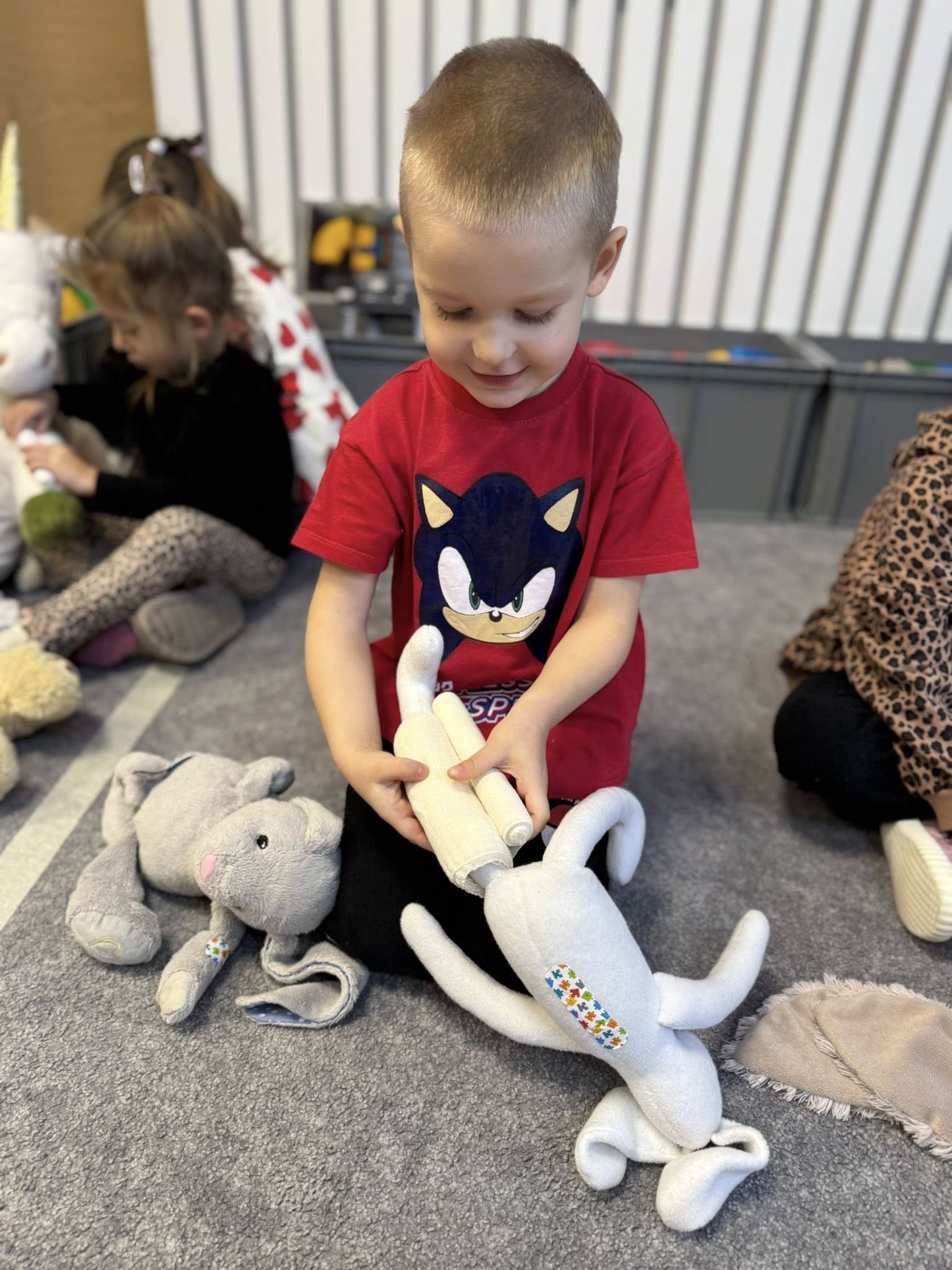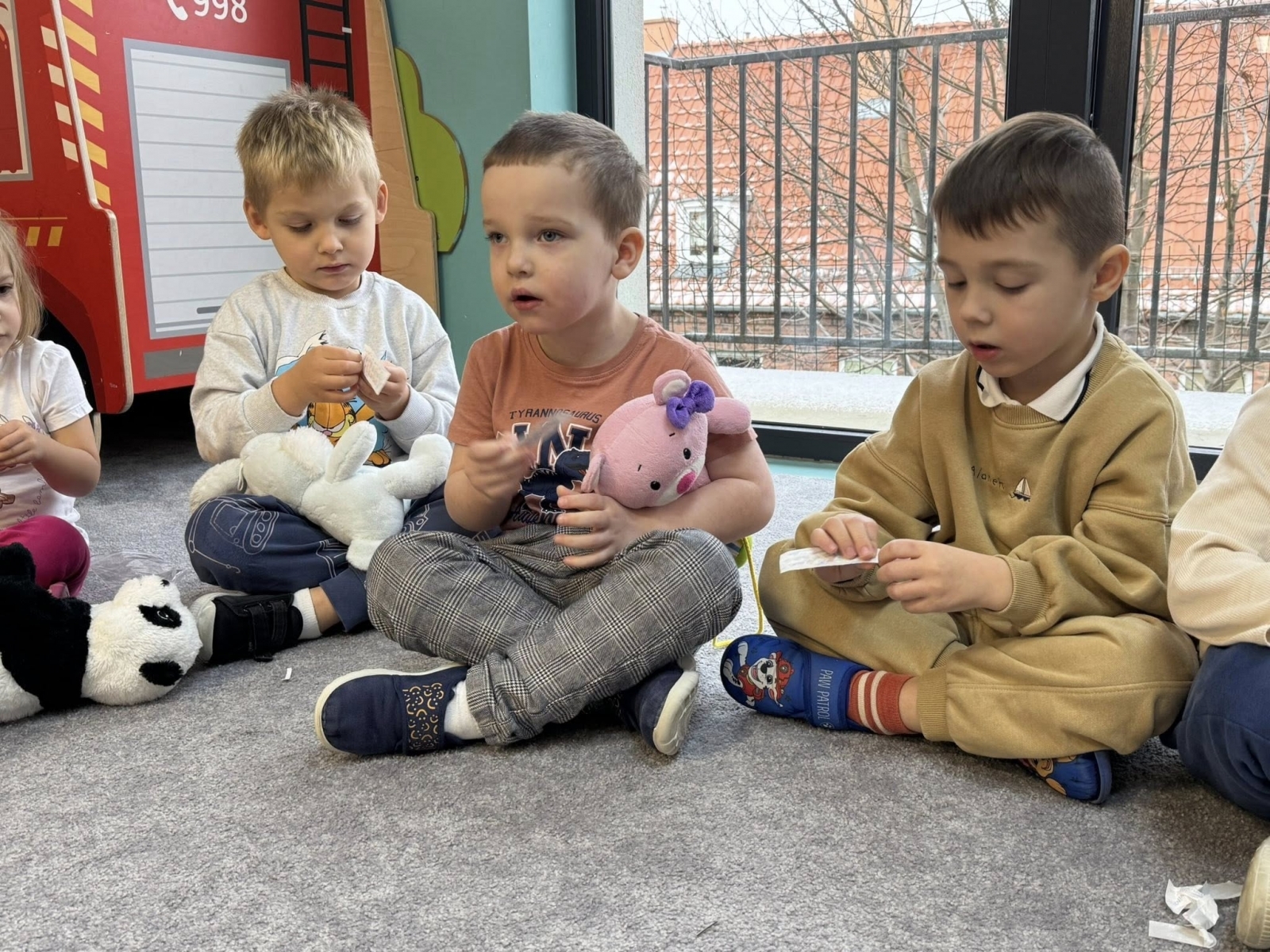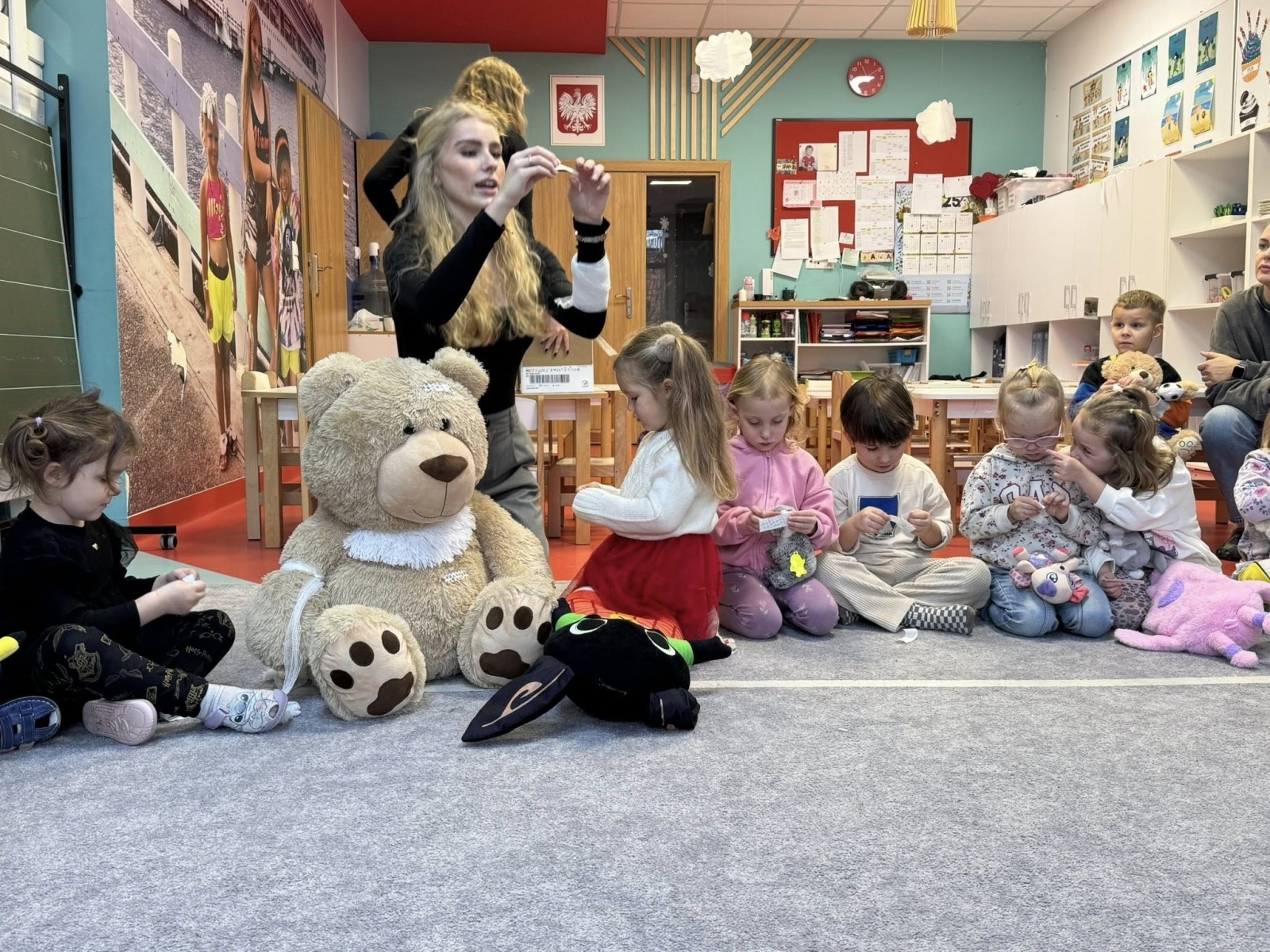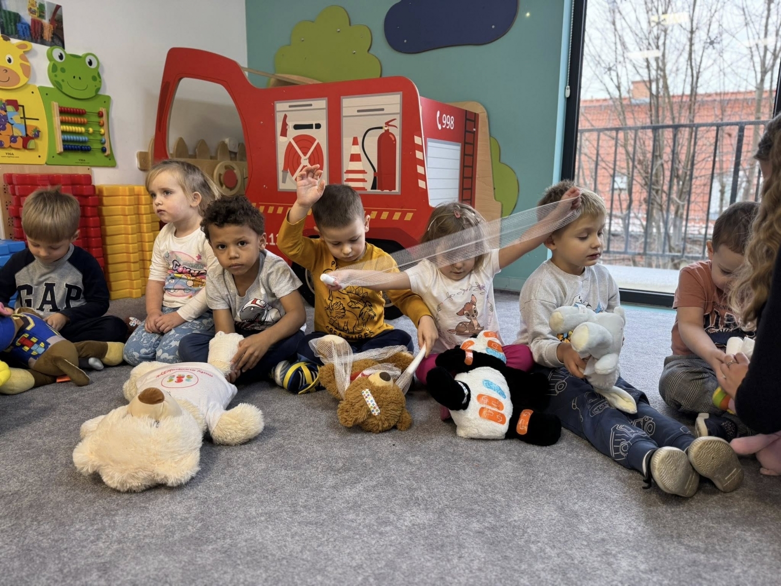 Największą atrakcją zajęć były ćwiczenia praktyczne. Każde dziecko otrzymało możliwość zaopatrzenia swojego „pacjenta” – pluszowego Misia. Maluchy samodzielnie bandażowały łapki, przykleiły plasterki i uczyły się, jak w prosty sposób pomóc w sytuacji drobnego urazu. Dzięki temu nauka stała się zabawą, a zdobyta wiedza została od razu wykorzystana w praktyce.