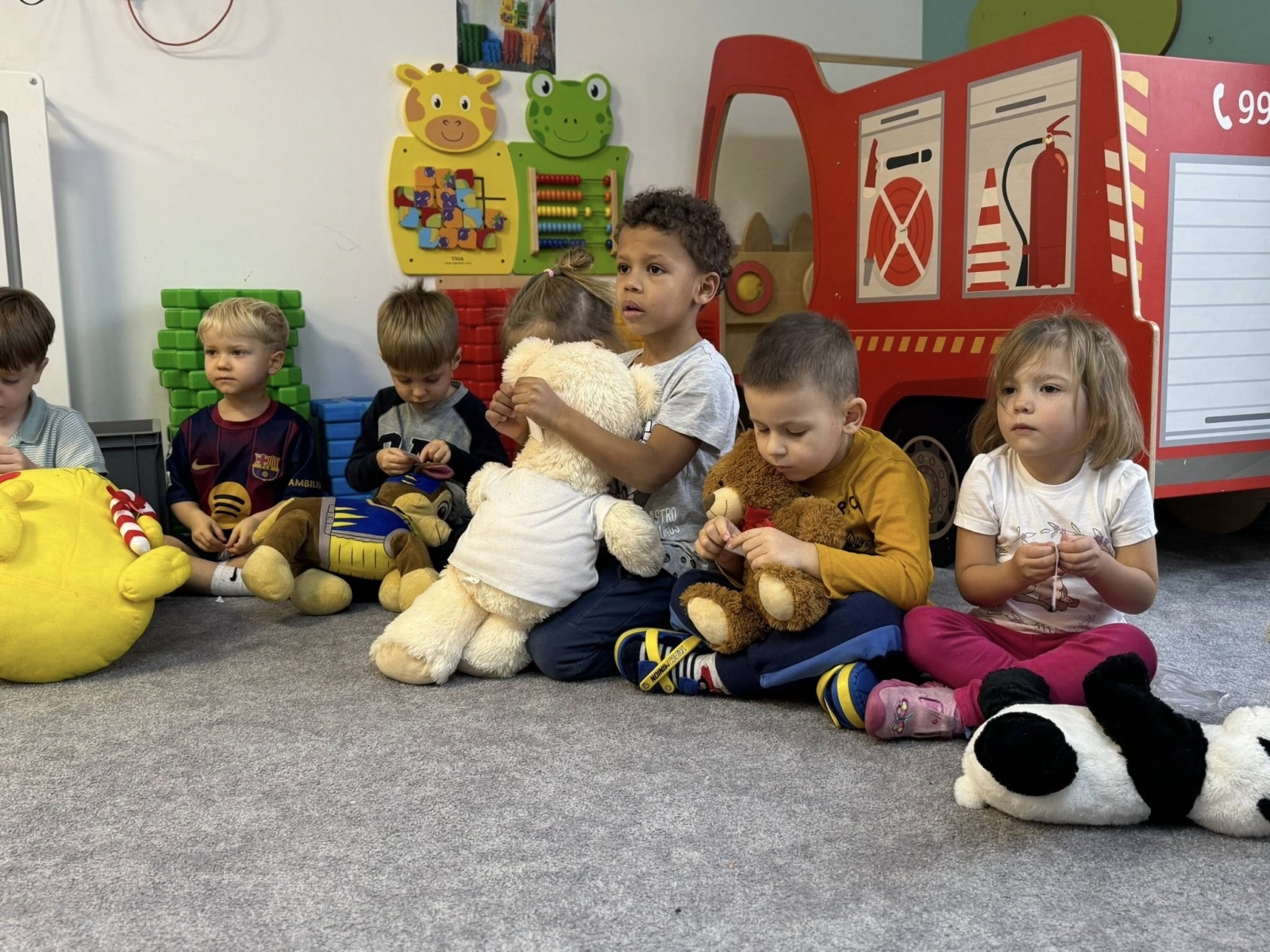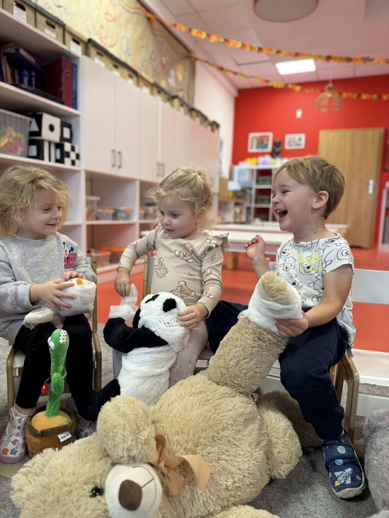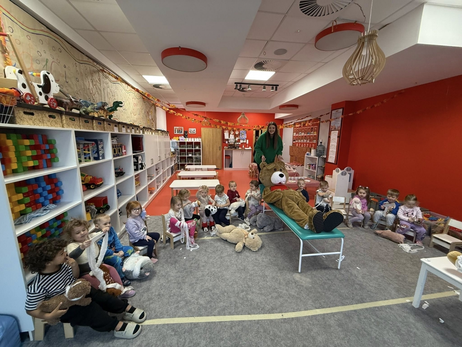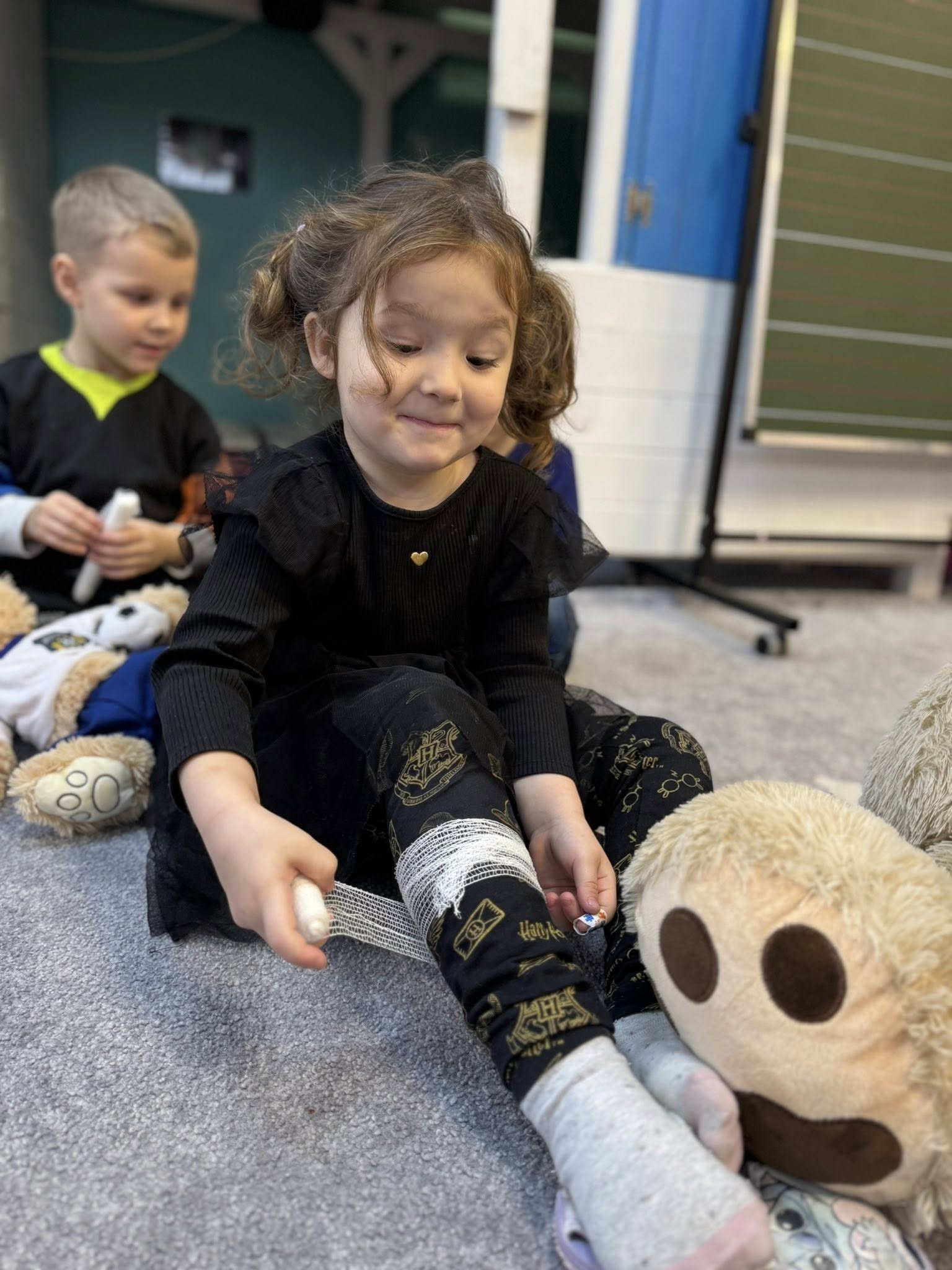 Największą atrakcją zajęć były ćwiczenia praktyczne. Każde dziecko otrzymało możliwość zaopatrzenia swojego „pacjenta” – pluszowego Misia. Maluchy samodzielnie bandażowały łapki, przykleiły plasterki i uczyły się, jak w prosty sposób pomóc w sytuacji drobnego urazu. Dzięki temu nauka stała się zabawą, a zdobyta wiedza została od razu wykorzystana w praktyce.