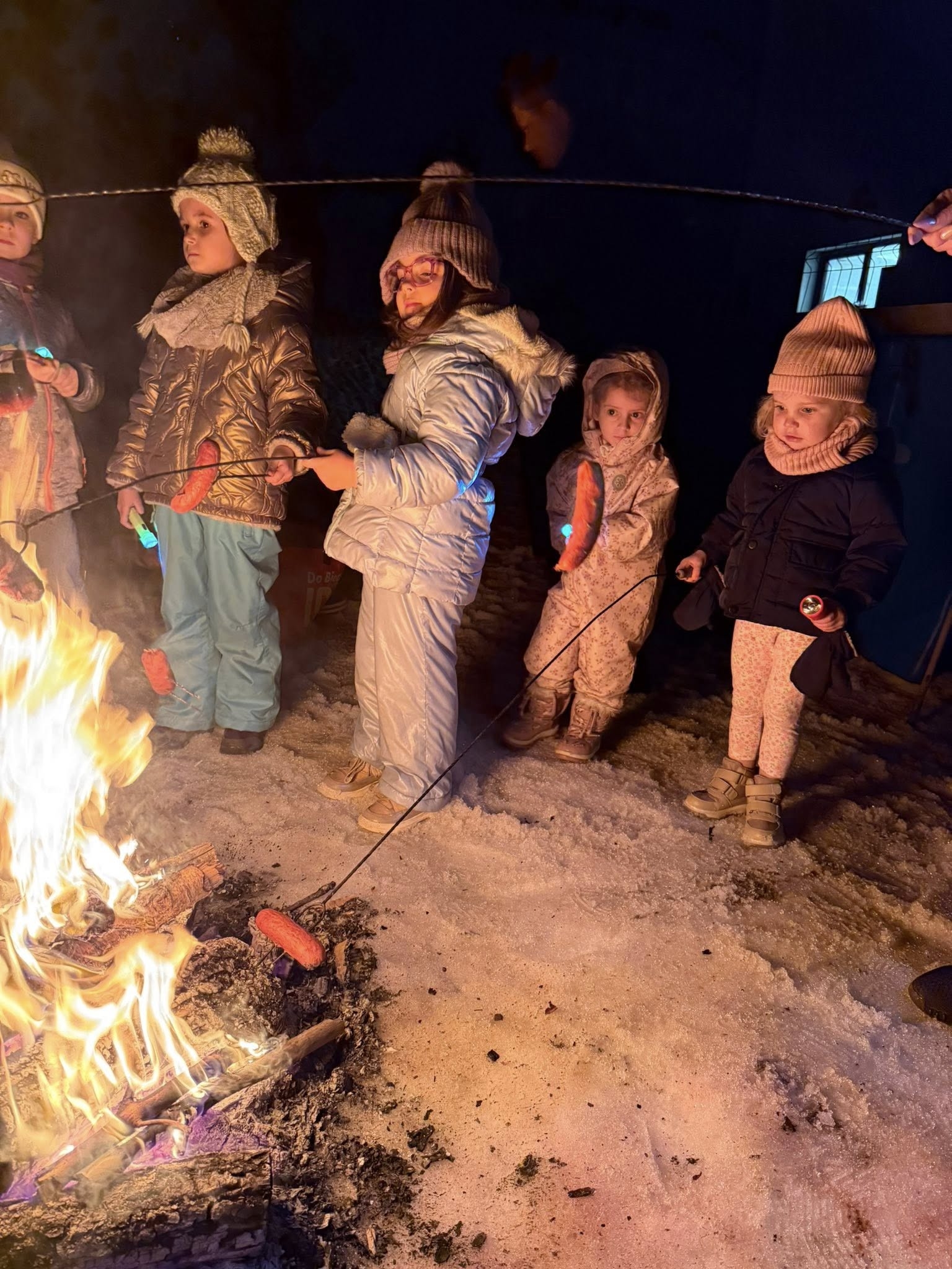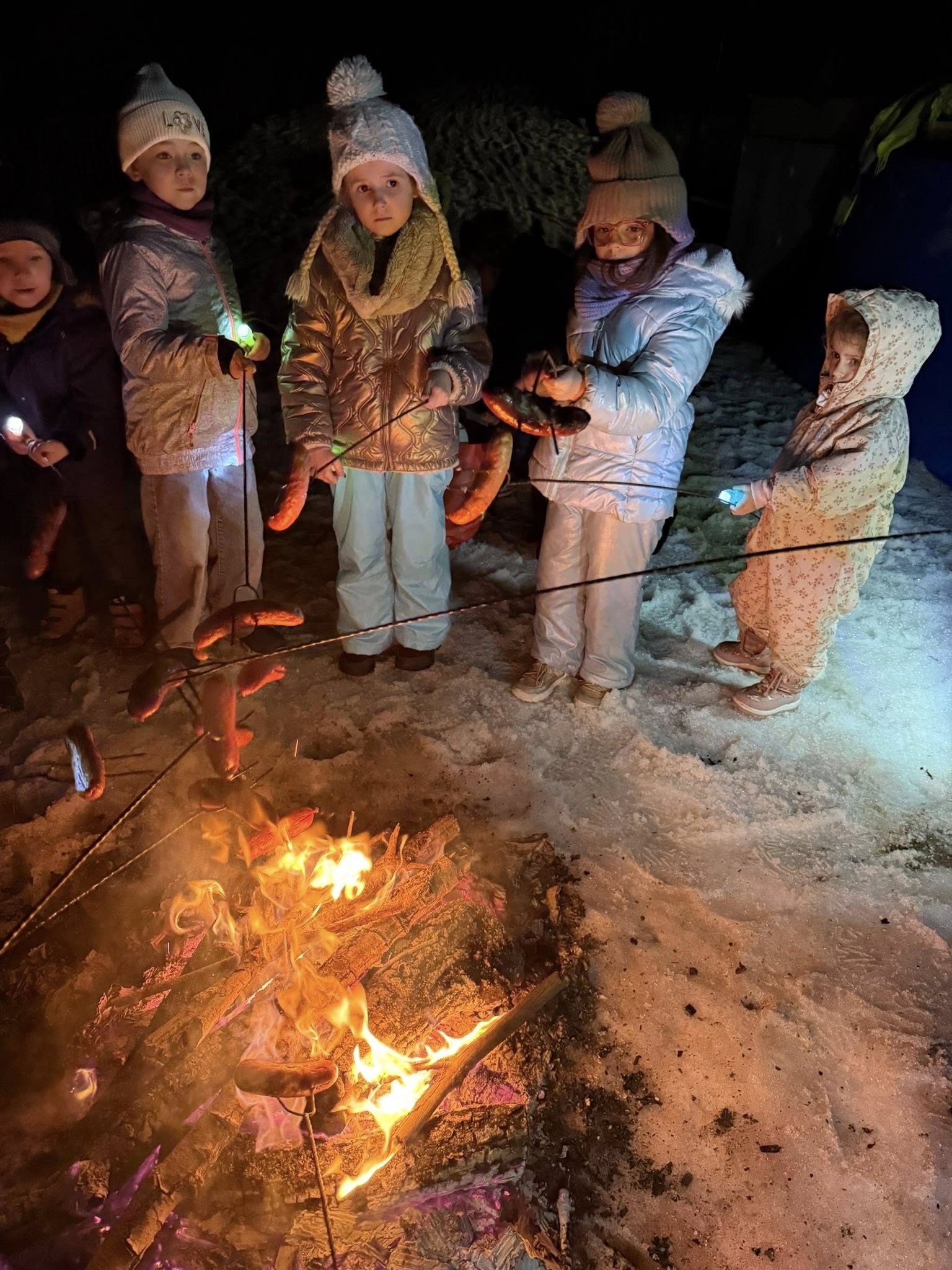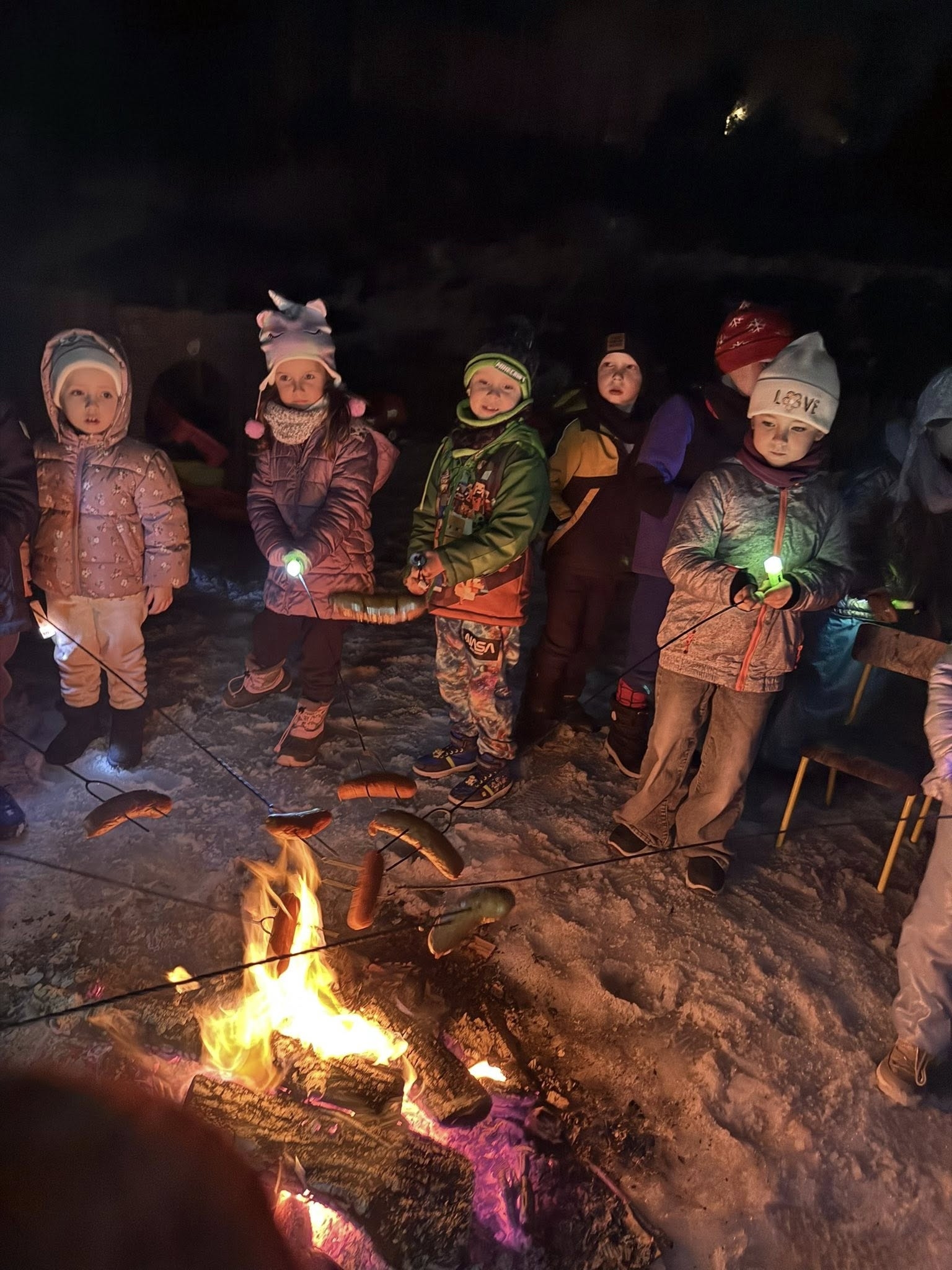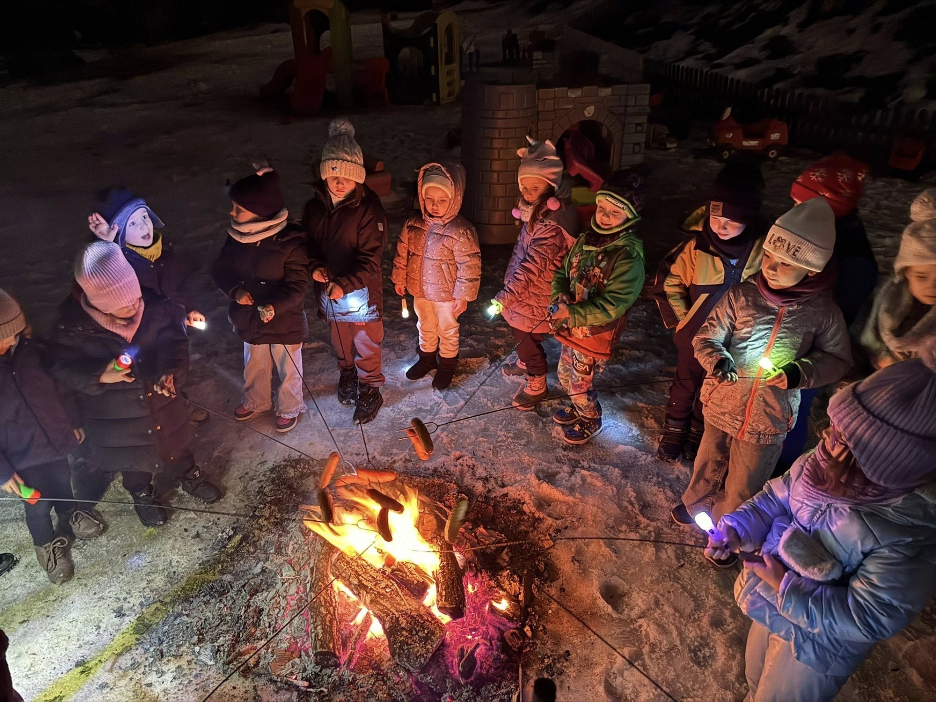 Wieczór rozpoczęliśmy od spotkania, które przeniosło nas prosto w klimat harcerskich wypraw. Na naszym przedszkolnym placu zabaw zapłonęło ognisko. Dzieci z zapartym tchem obserwowały tańczące płomienie, ale najważniejszy był punkt programu: pieczenie kiełbasek. Kiełbaski z ogniska, chrupiąca bułka i ten magiczny trzask drewna – te proste przyjemności sprawiły, że każdy poczuł się jak na prawdziwym biwaku. Ciepło ognia kontrastowało z rześkim, zimowym powietrzem, tworząc atmosferę, której nie da się zapomnieć. Śmiechu było co niemiara, a wspólne posiłki na świeżym powietrzu zawsze smakują najlepiej!