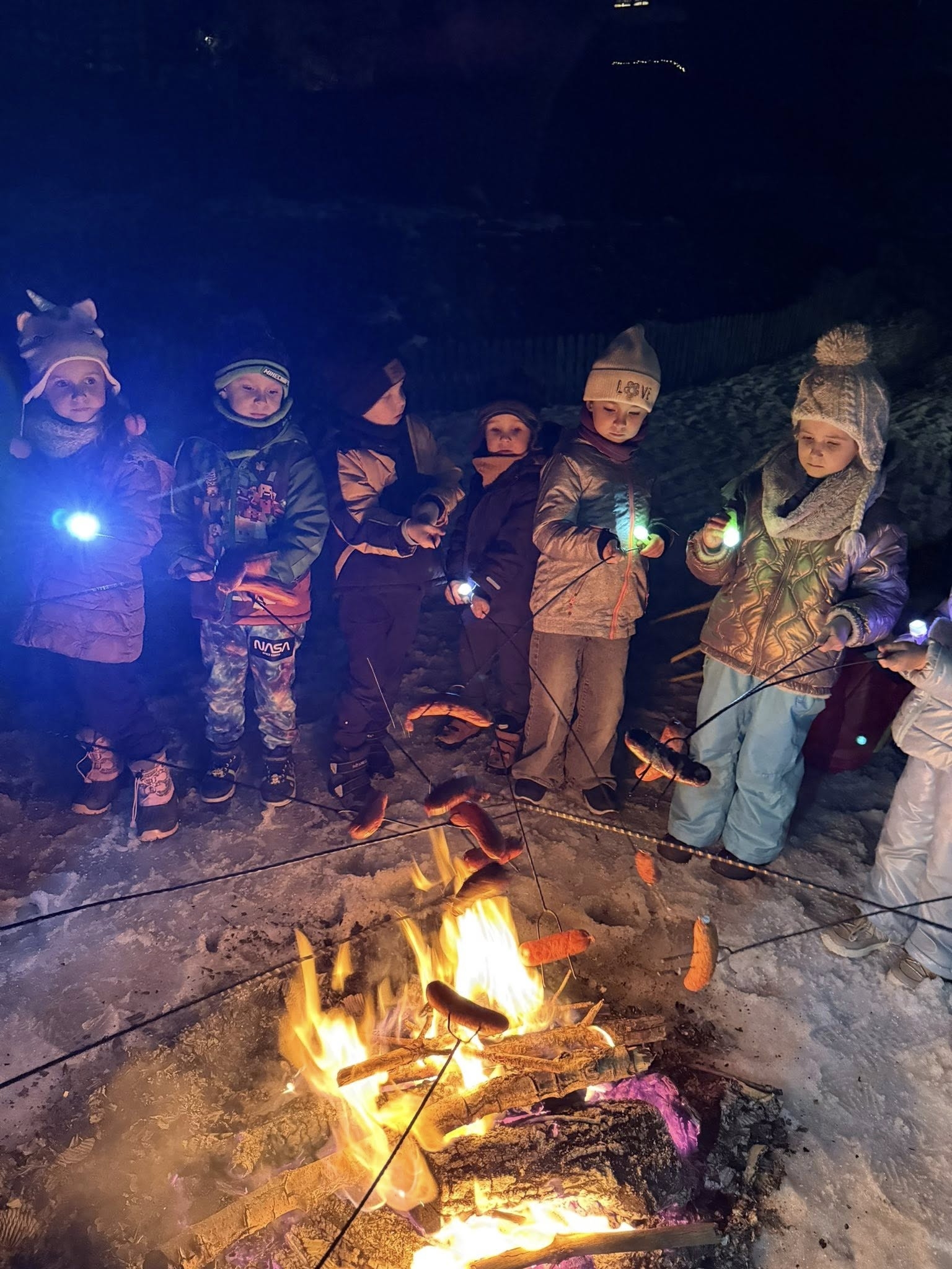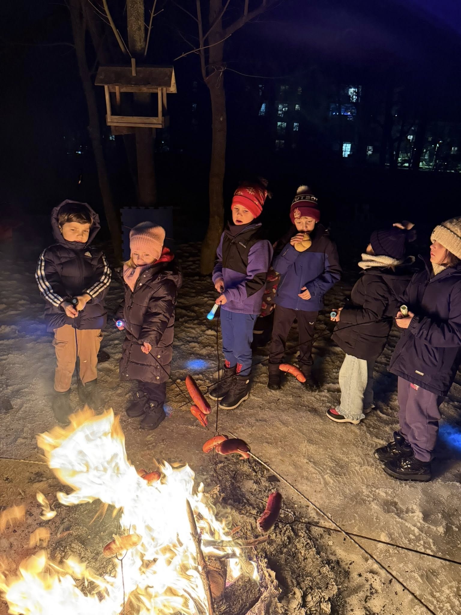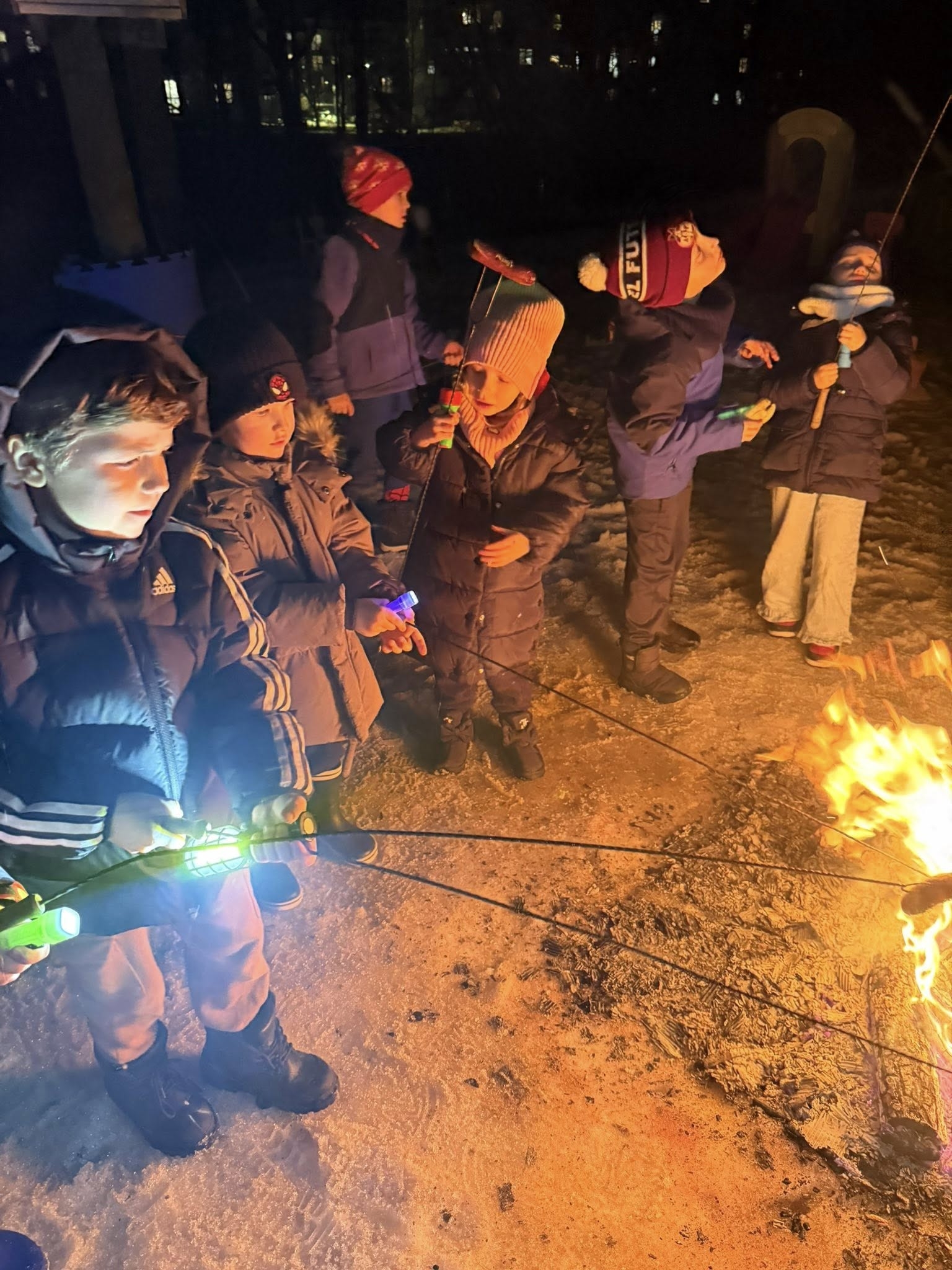 Wieczór rozpoczęliśmy od spotkania, które przeniosło nas prosto w klimat harcerskich wypraw. Na naszym przedszkolnym placu zabaw zapłonęło ognisko. Dzieci z zapartym tchem obserwowały tańczące płomienie, ale najważniejszy był punkt programu: pieczenie kiełbasek. Kiełbaski z ogniska, chrupiąca bułka i ten magiczny trzask drewna – te proste przyjemności sprawiły, że każdy poczuł się jak na prawdziwym biwaku. Ciepło ognia kontrastowało z rześkim, zimowym powietrzem, tworząc atmosferę, której nie da się zapomnieć. Śmiechu było co niemiara, a wspólne posiłki na świeżym powietrzu zawsze smakują najlepiej!