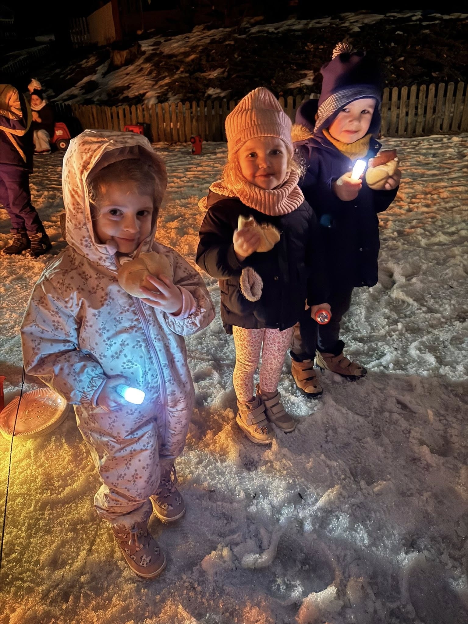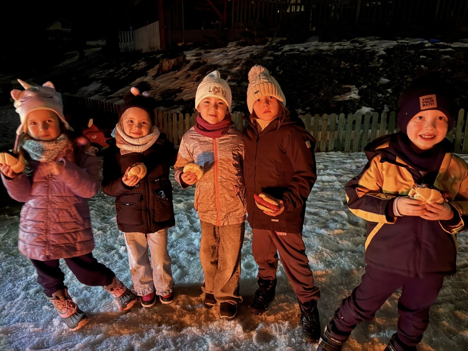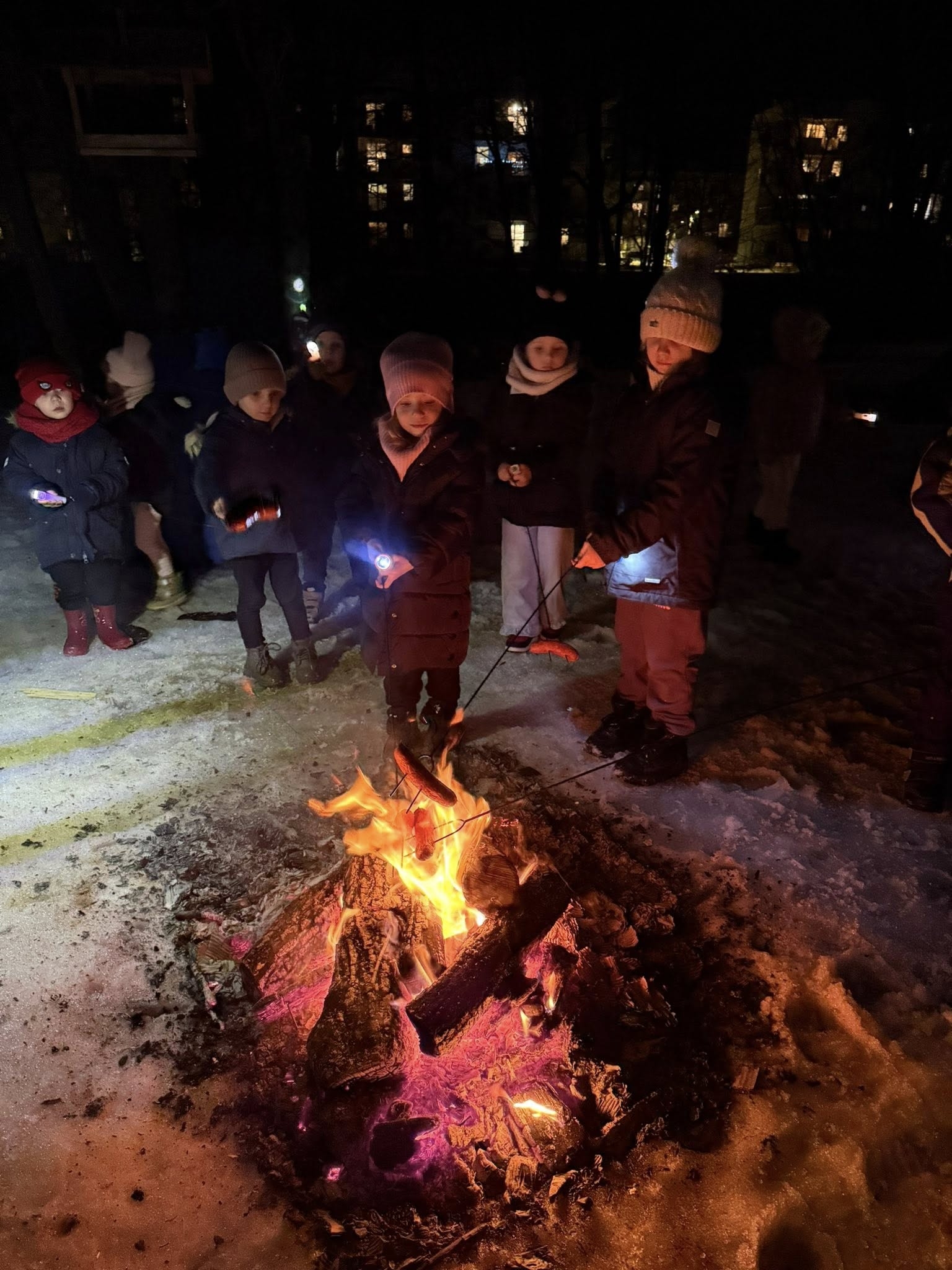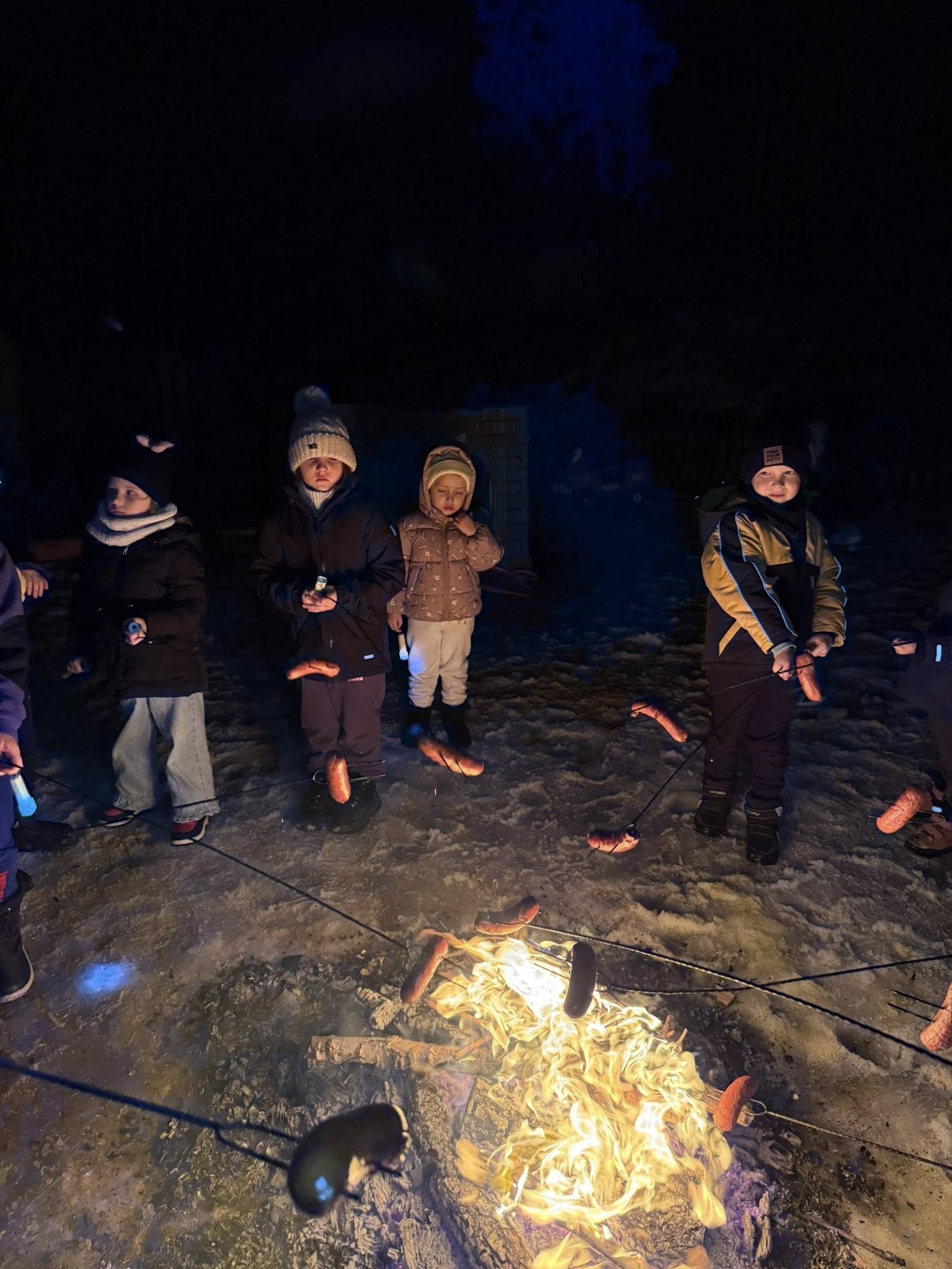 Wieczór rozpoczęliśmy od spotkania, które przeniosło nas prosto w klimat harcerskich wypraw. Na naszym przedszkolnym placu zabaw zapłonęło ognisko. Dzieci z zapartym tchem obserwowały tańczące płomienie, ale najważniejszy był punkt programu: pieczenie kiełbasek. Kiełbaski z ogniska, chrupiąca bułka i ten magiczny trzask drewna – te proste przyjemności sprawiły, że każdy poczuł się jak na prawdziwym biwaku. Ciepło ognia kontrastowało z rześkim, zimowym powietrzem, tworząc atmosferę, której nie da się zapomnieć. Śmiechu było co niemiara, a wspólne posiłki na świeżym powietrzu zawsze smakują najlepiej!