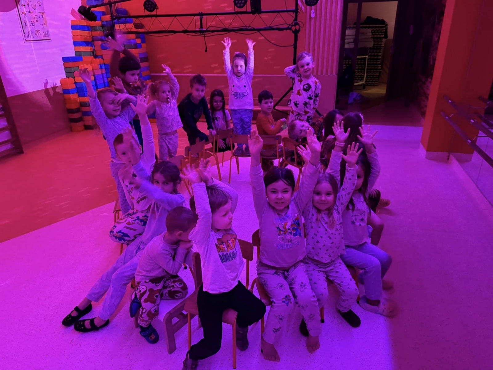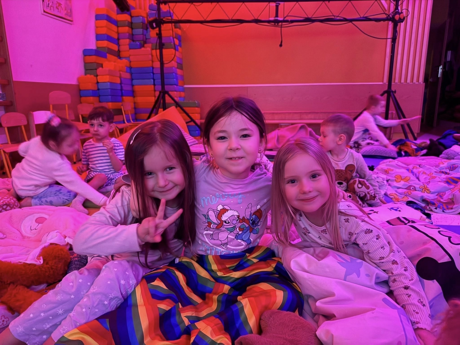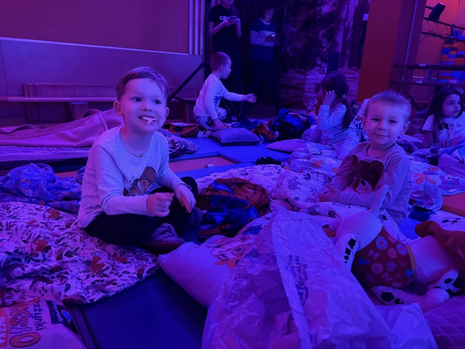 Po powrocie do budynku emocje wcale nie opadły. Zamieniliśmy kurtki na piżamy i rozpoczęliśmy drugą część wieczoru. Sale przedszkolne wypełniły się kolorowymi śpiworami i pluszakami.