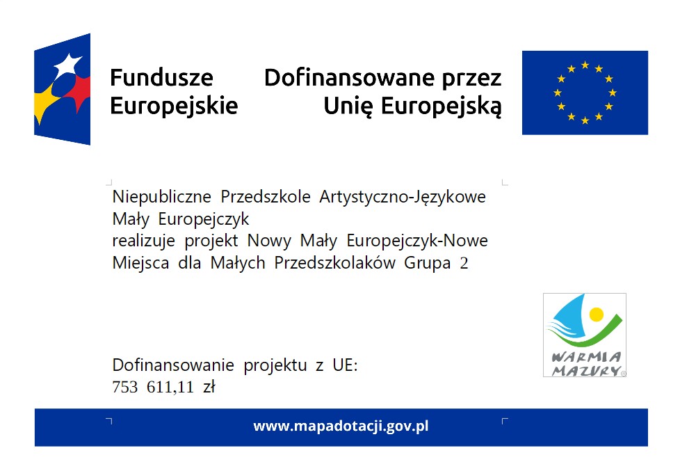 „Nowy mały Europejczyk – Nowe Miejsca dla Małych Przedszkolaków Grupa 2” w ramach programu regionalnego Fundusze Europejskie dla Warmii i Mazur (FEWiM) 2021-2027, działanie 6.2 Edukacja przedszkolna.