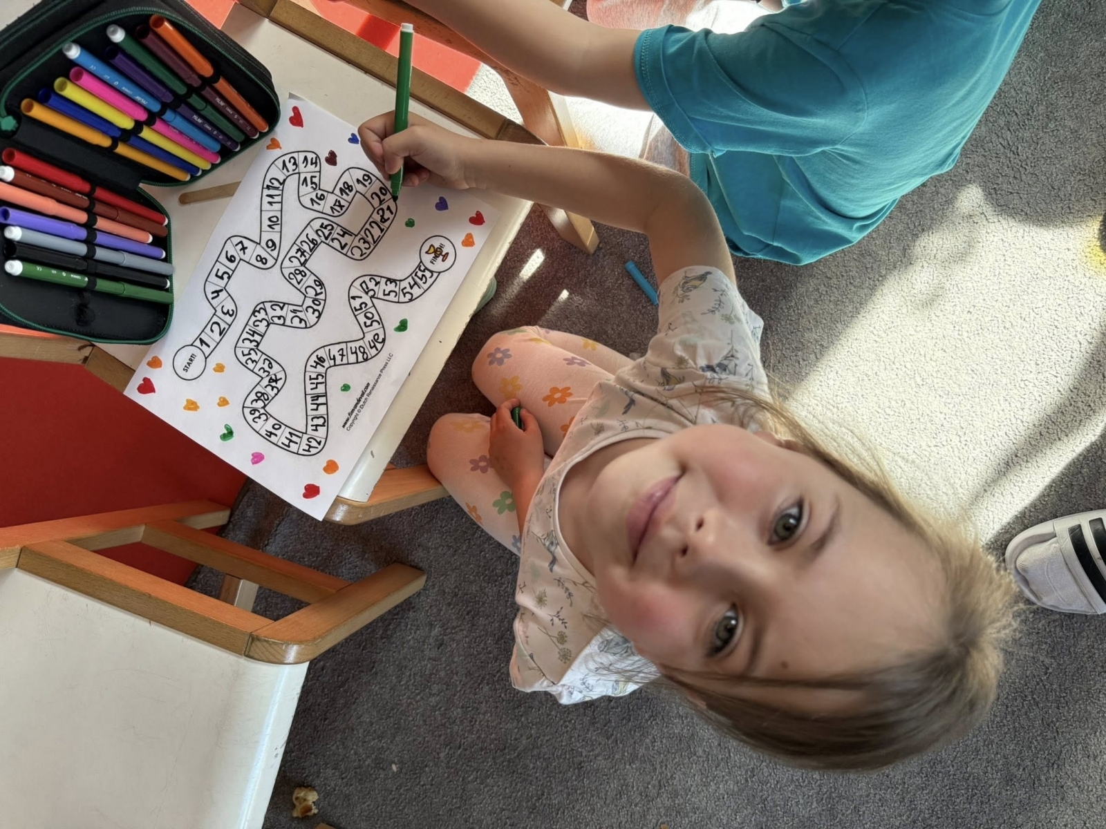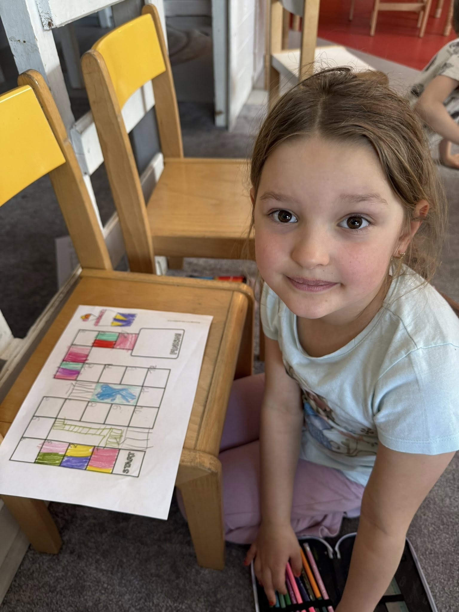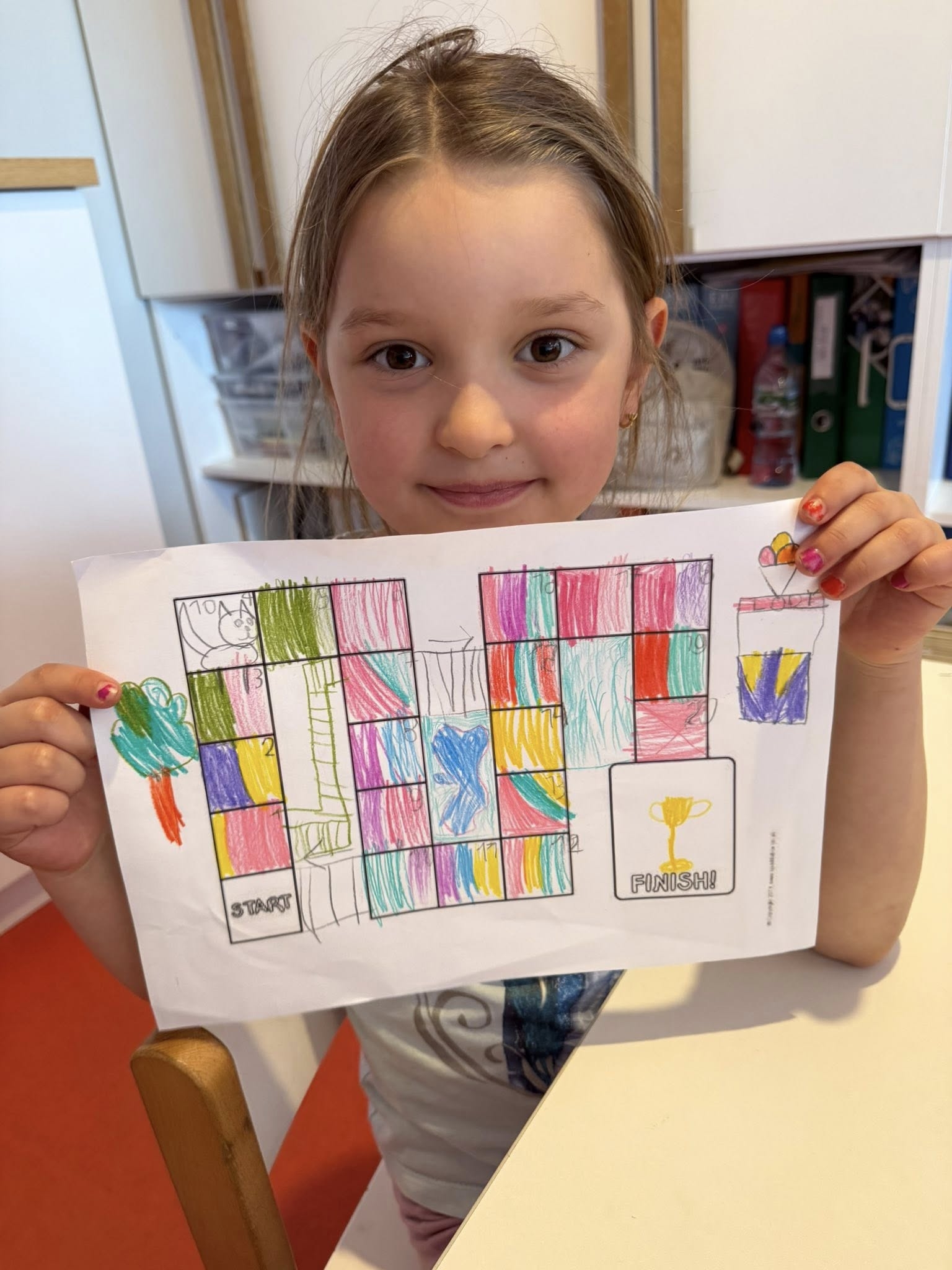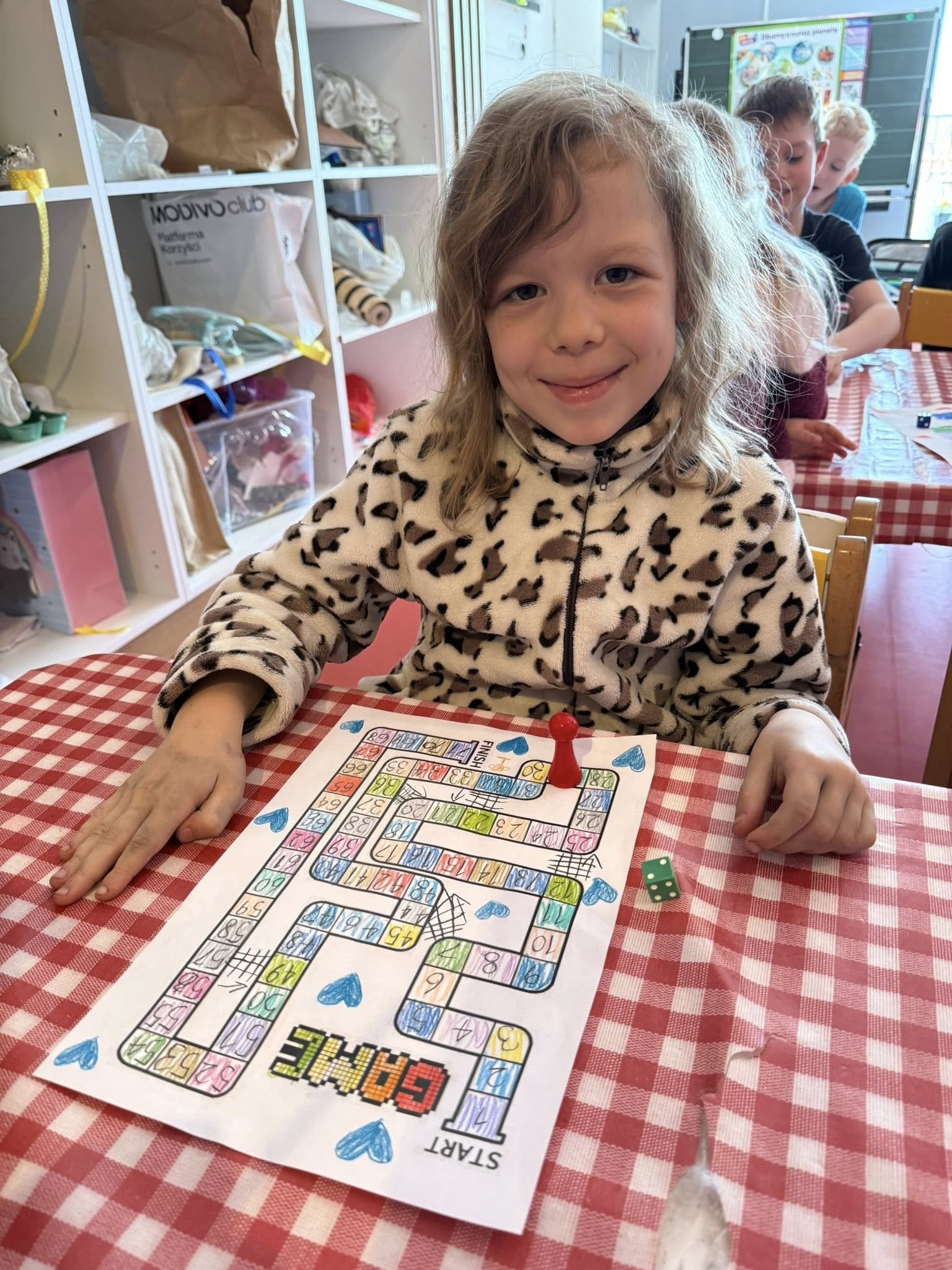 Podczas tej aktywności nasze przedszkolaki i uczniowie zerówki utrwalali znajomość cyfr i liczenie podczas numerowania pól i przesuwania pionków. Ćwiczyli motorykę małą i pisanie, tworząc opisy, legendy i rysując precyzyjne trasy. Rozwijali logiczne myślenie, planując mechanikę gry i przewidując skutki danych zasad. Uczyli się współpracy i empatii, testując gry innych i wspólnie rozwiązując sporne sytuacje.