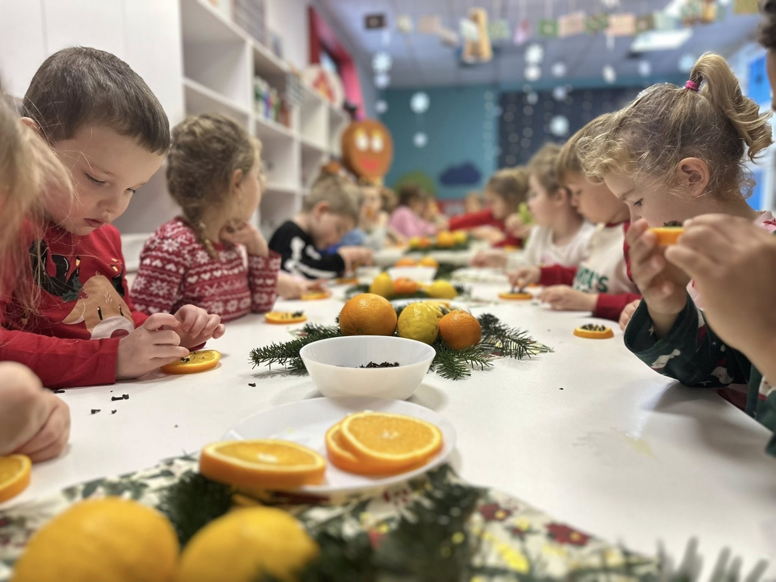 Prawdziwą atrakcją było tworzenie ekologicznych ozdób – wbijanie goździków w soczyste pomarańcze sprawiło, że w całym przedszkolu unosił się zapach Świąt. Takie zajęcia nie tylko uczą uważności, ale też pozwalają dzieciom celebrować bliskość i radość z bycia razem.
