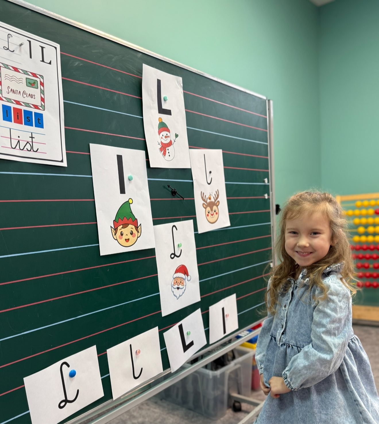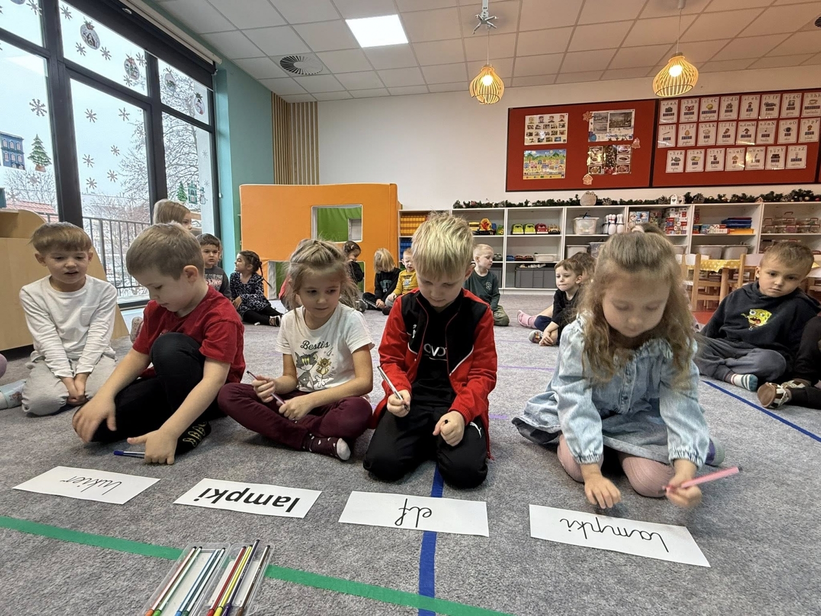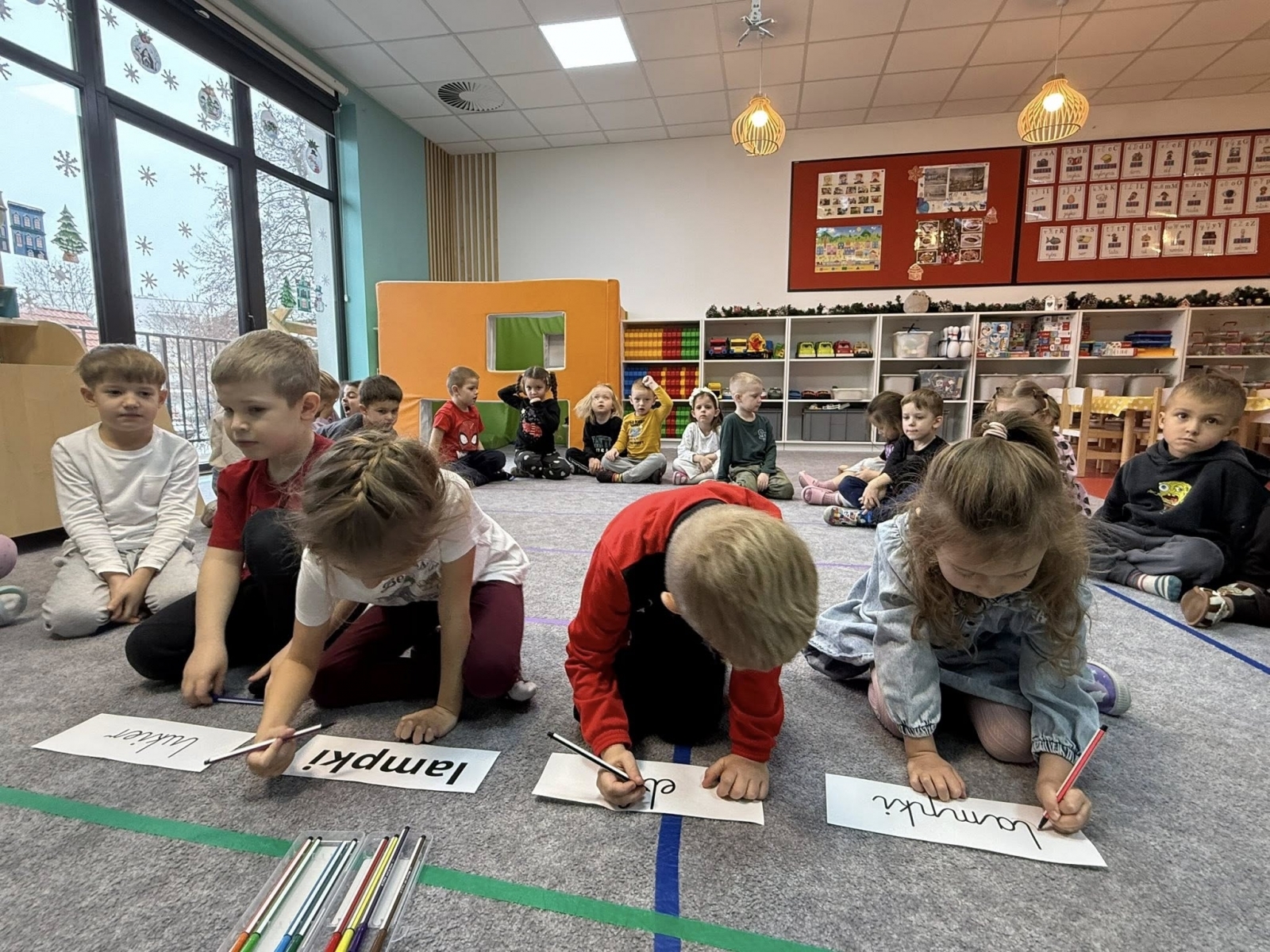 Największą niespodzianką był list od samej litery L – bohaterki, która życzyła wszystkim dużo literkowej i świątecznej zabawy. Dzieci układały literę L z własnych ciał, pracowały w książkach i przygotowały kolorowe wklejki do zeszytów. Dzięki temu nauka stała się prawdziwą przygodą, a świąteczny klimat towarzyszył im na każdym kroku.