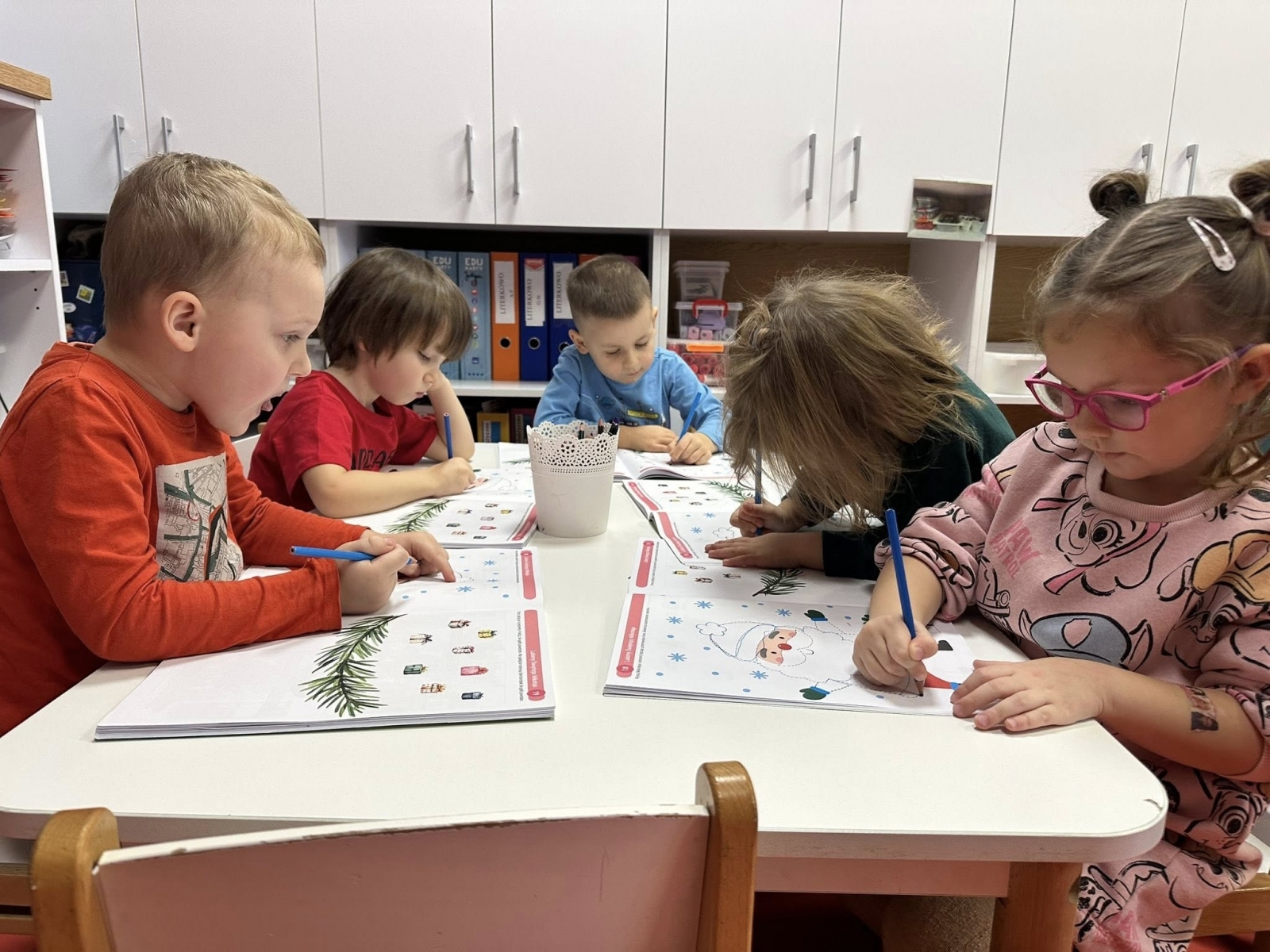 W książeczkach rysowały po śladzie postać Mikołaja, liczyły prezenty i sprawdzały, czy każdy pomocnik Świętego potrafi dobrze liczyć paczuszki. Nie zabrakło też zabaw ruchowych – Mikołaj na siłowni ćwiczył razem z dziećmi, aby być w formie na wielkie rozdawanie prezentów.