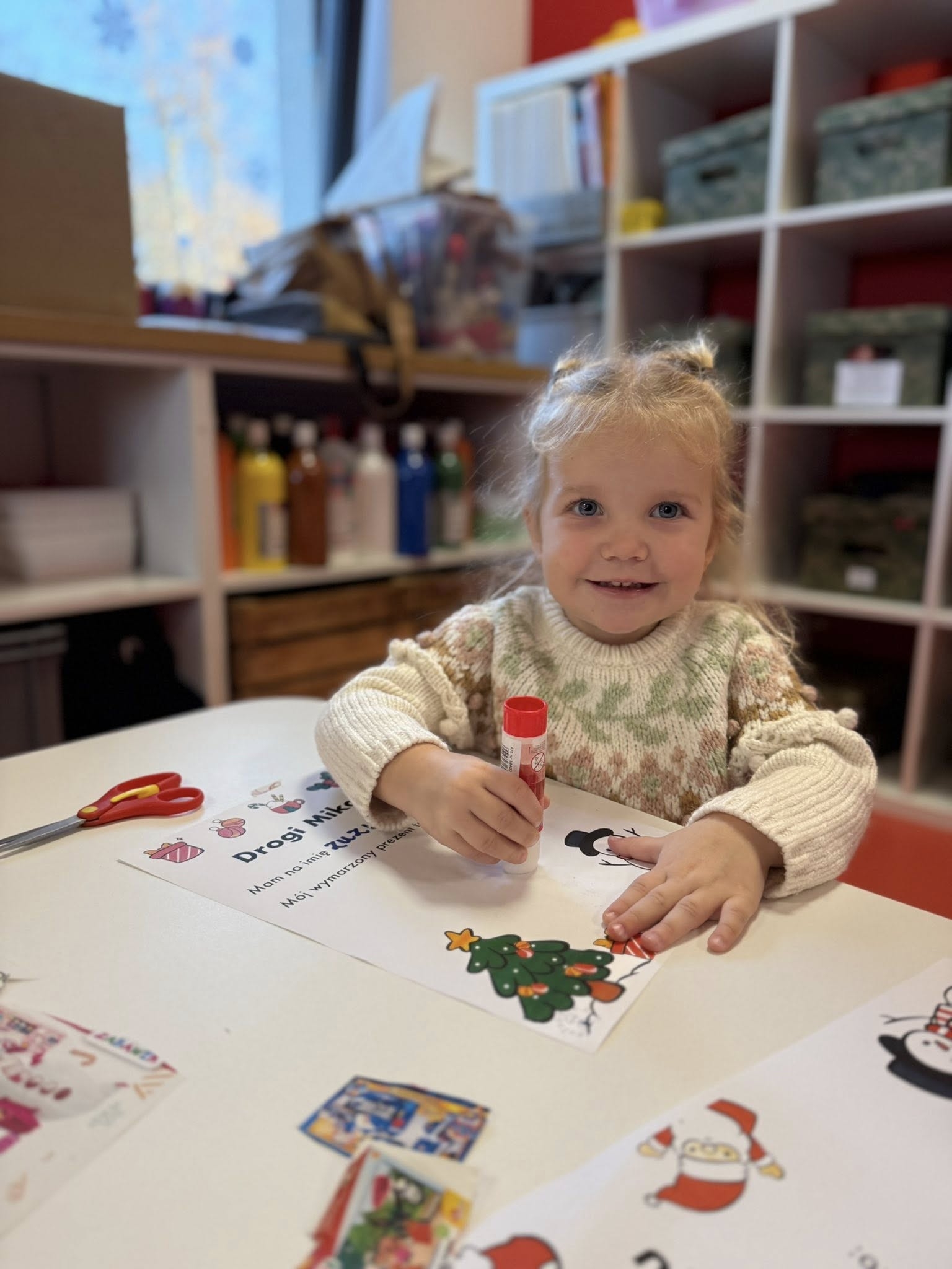 Największą atrakcją dnia było pisanie listów do Świętego Mikołaja. Dzieci z ogromnym zaangażowaniem tworzyły swoje kartki – jedne pełne rysunków, inne bogato ozdobione kolorami i naklejkami. Każdy list był wyjątkowy, bo zawierał nie tylko marzenia o prezentach, ale także życzenia pełne ciepła i radości.