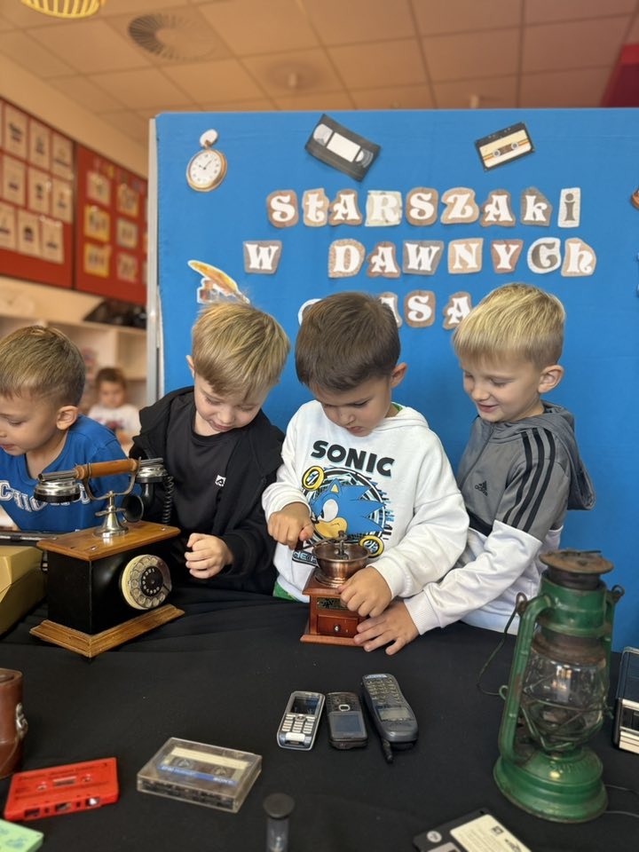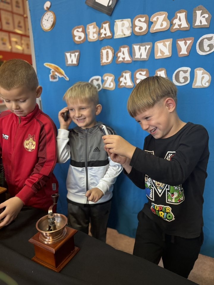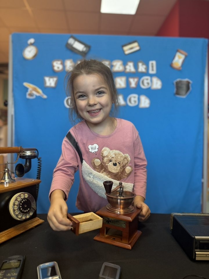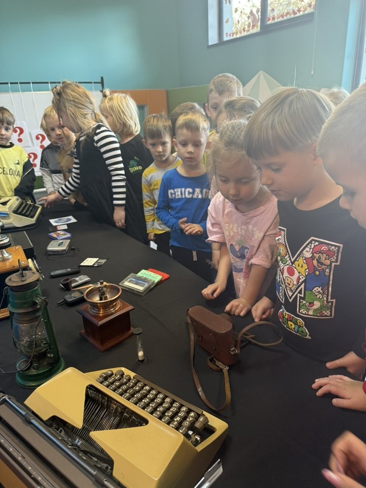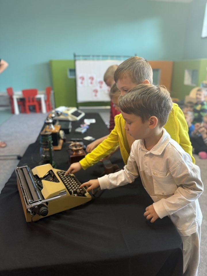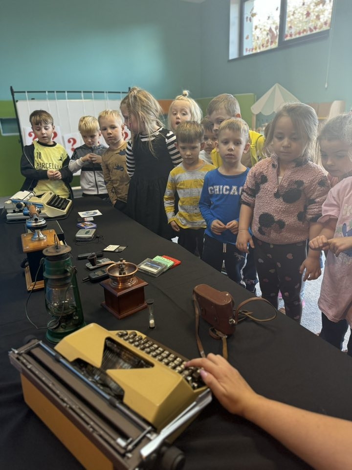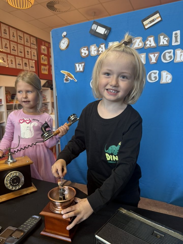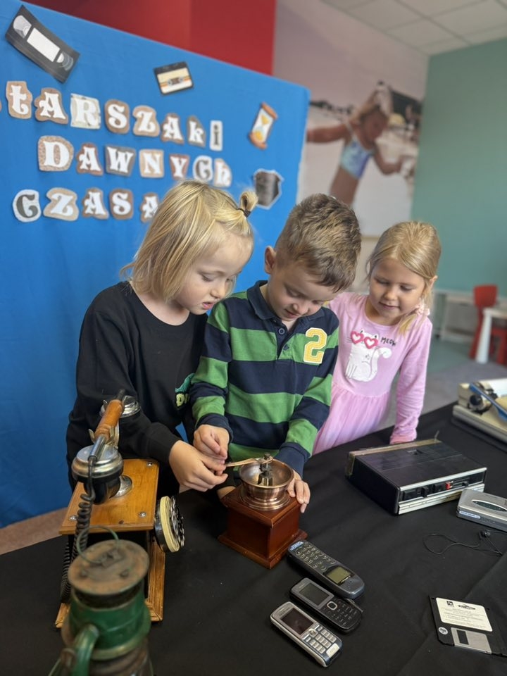 Dzieci z naszego przedszkola w Elblągu miały okazję zobaczyć i dotknąć przedmioty, które dla wielu dorosłych są dziś wspomnieniem dzieciństwa. Wśród eksponatów znalazły się m.in. stare telefony z tarczą, maszyny do pisania, lampa naftowa, kasety magnetofonowe, dyskietki, aparat fotograficzny, odtwarzacze muzyki oraz klasyczny młynek do kawy. Każdy z tych przedmiotów wzbudzał ciekawość i zachwyt — a niektóre nawet zdziwienie, że kiedyś były codziennością.