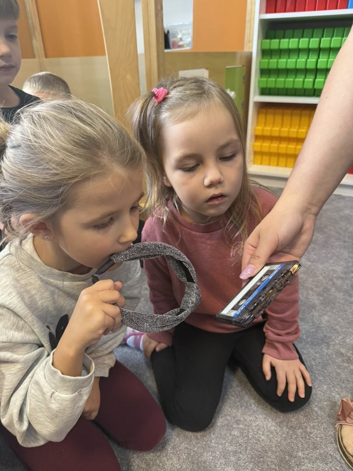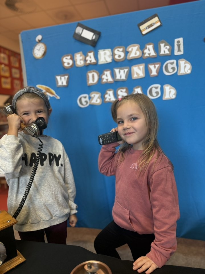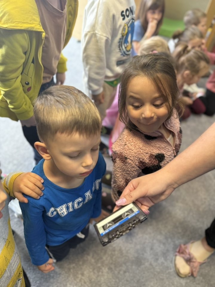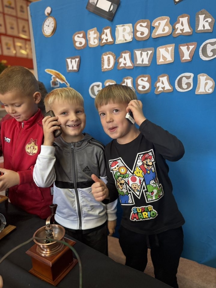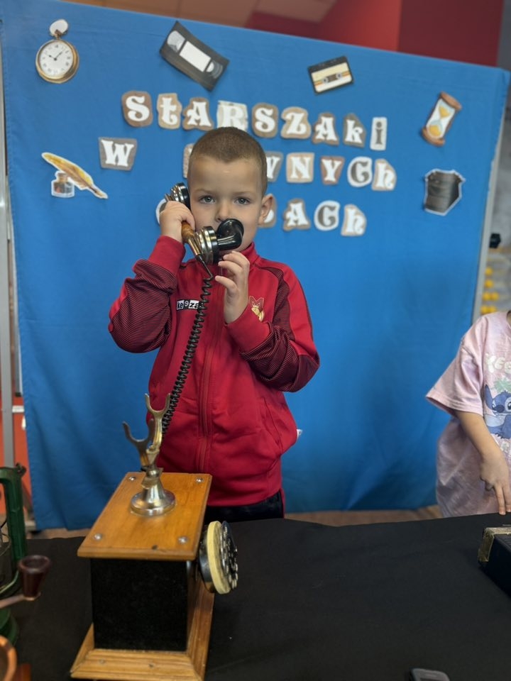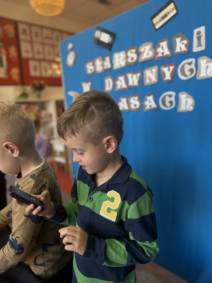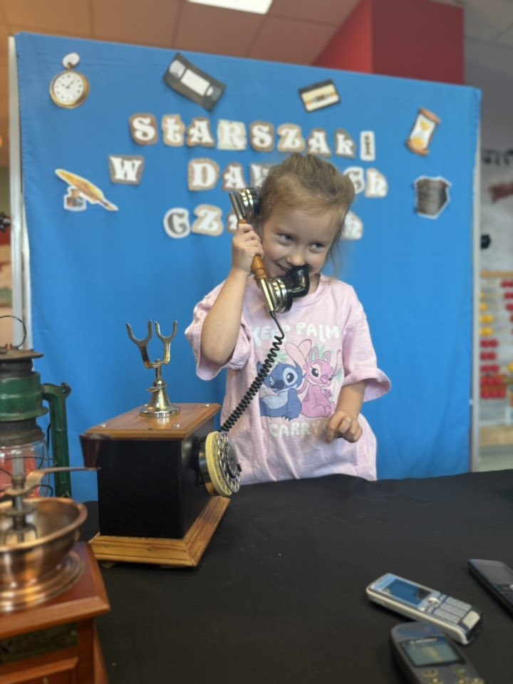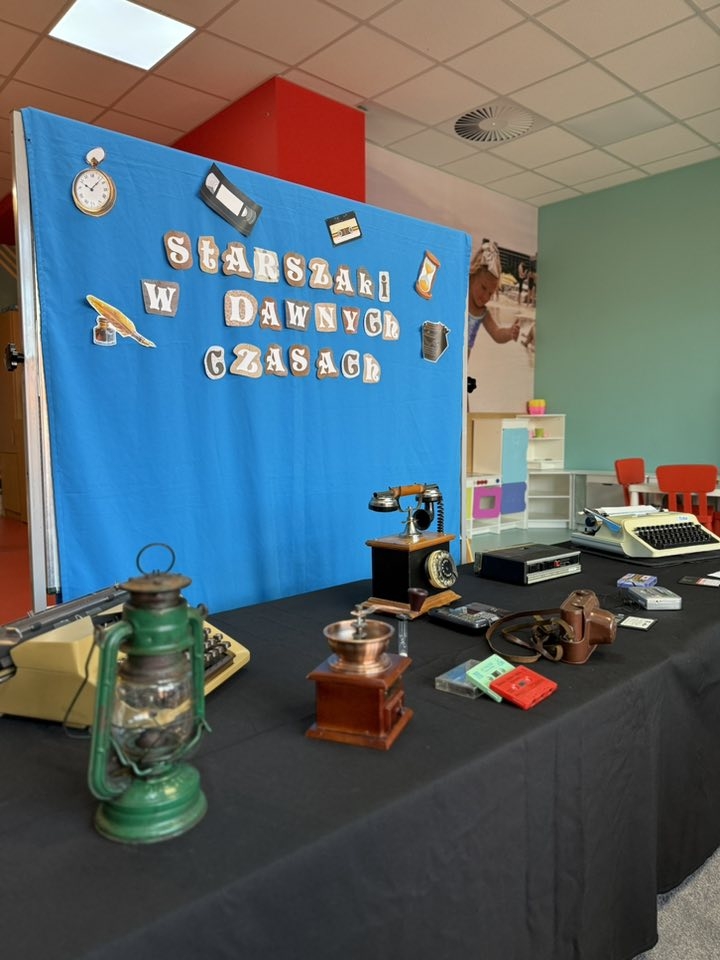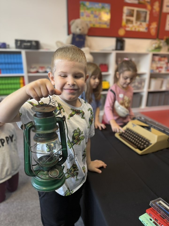 Dzieci z naszego przedszkola w Elblągu miały okazję zobaczyć i dotknąć przedmioty, które dla wielu dorosłych są dziś wspomnieniem dzieciństwa. Wśród eksponatów znalazły się m.in. stare telefony z tarczą, maszyny do pisania, lampa naftowa, kasety magnetofonowe, dyskietki, aparat fotograficzny, odtwarzacze muzyki oraz klasyczny młynek do kawy. Każdy z tych przedmiotów wzbudzał ciekawość i zachwyt — a niektóre nawet zdziwienie, że kiedyś były codziennością.