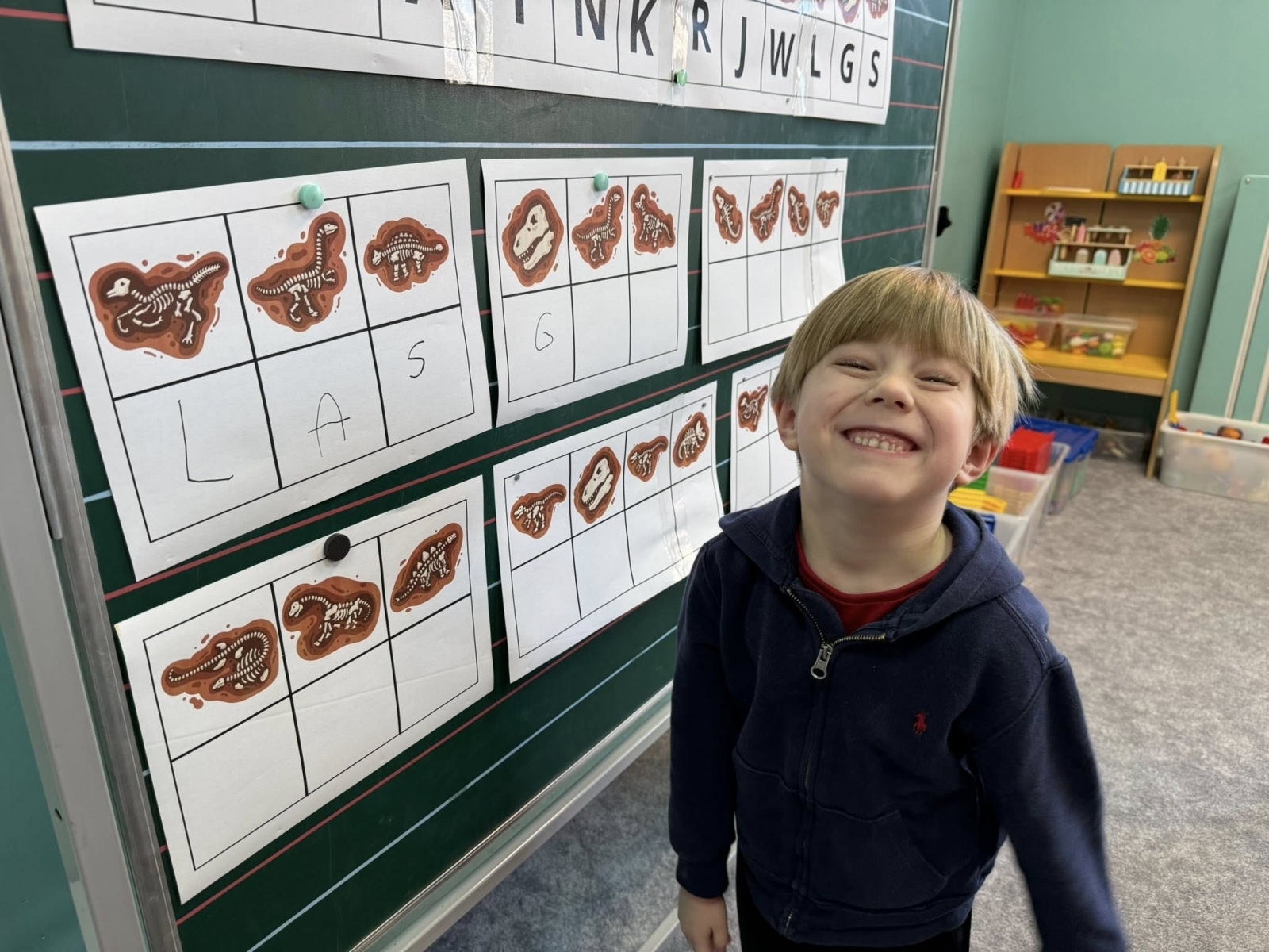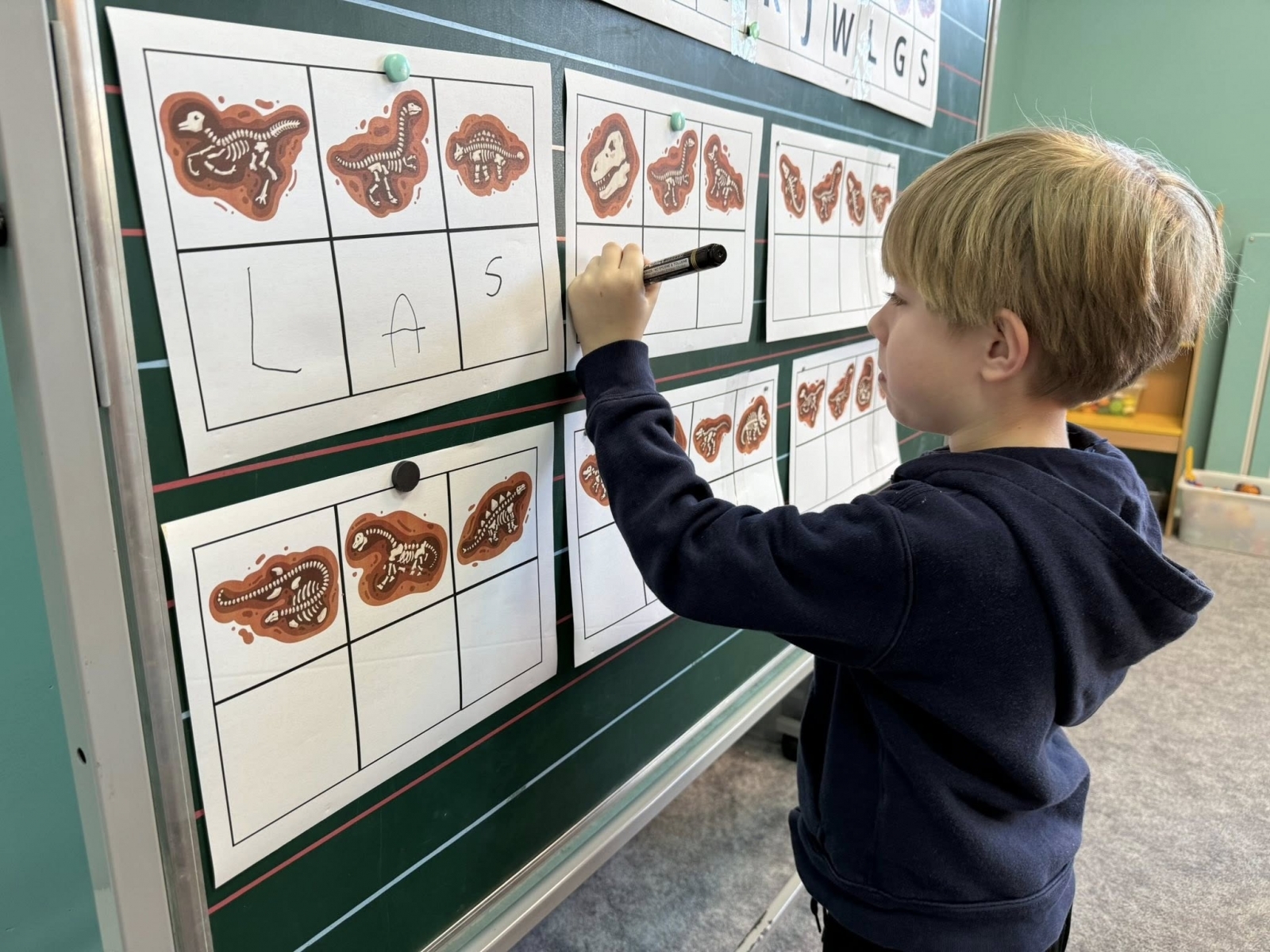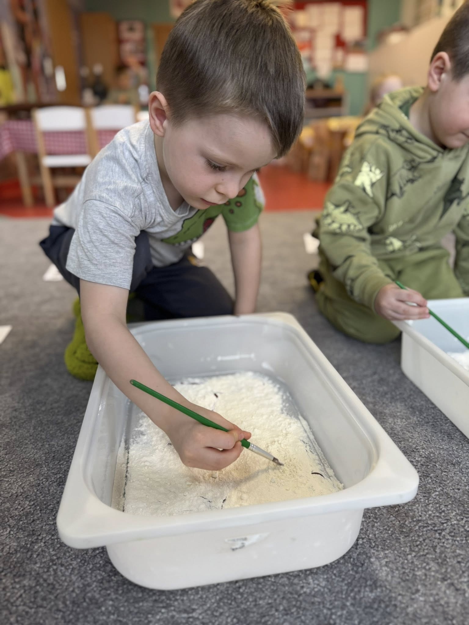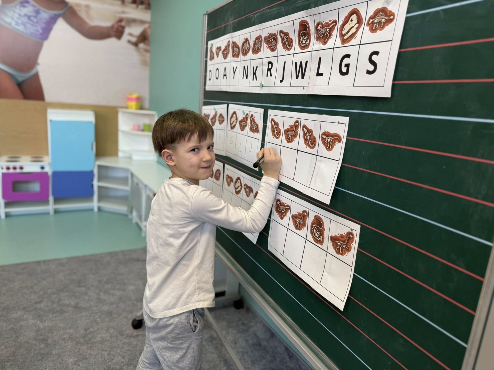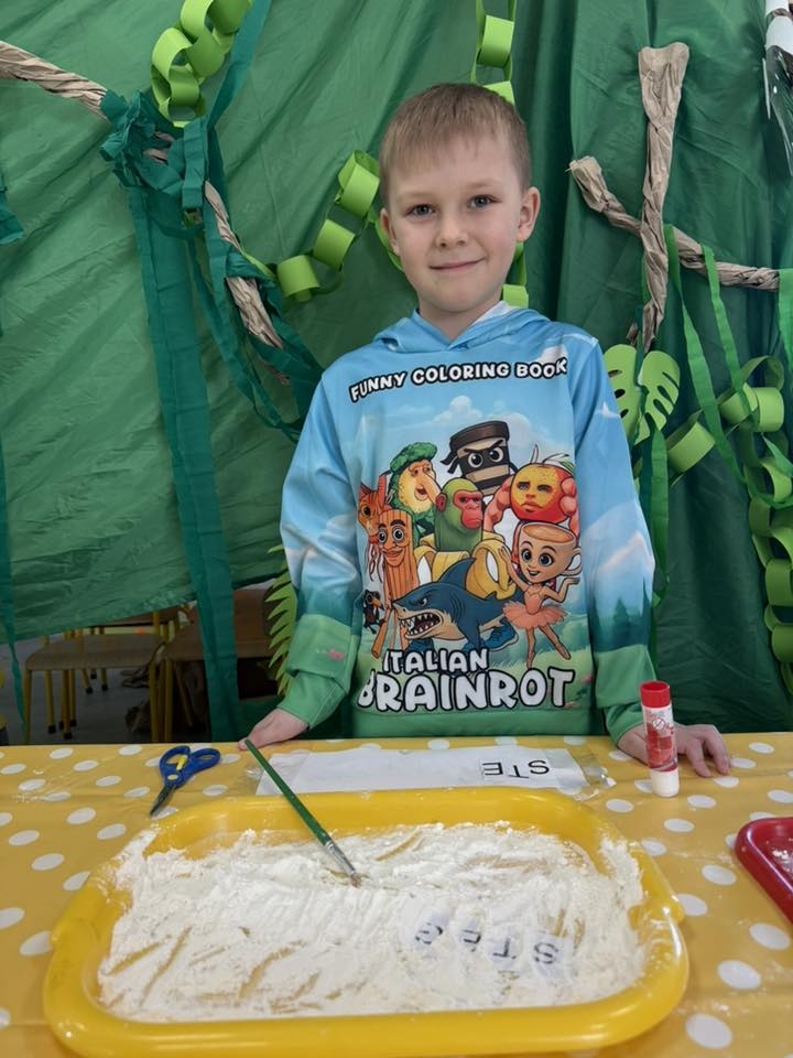 Następnie nasi specjaliści przeszli do wymagających zadań edukacyjnych. Ćwiczyli czytanie, wyszukując ukryte literki i układając z nich skomplikowane wyrazy oraz dopasowując sylaby do nazw prehistorycznych gadów. Precyzyjne wycinanie haseł nożyczkami pozwoliło na doskonały trening motoryki małej, a zajęcia z pędzelkami uczyły cierpliwości podczas delikatnego odkrywania „znalezisk” w piasku. Nie zabrakło również bogatych doznań sensorycznych – badanie i przesypywanie materiałów sprawiło dzieciom mnóstwo frajdy, a zwieńczeniem prac były artystyczne kolorowanki wykonane pastelami, które ozdobiły naszą salę.