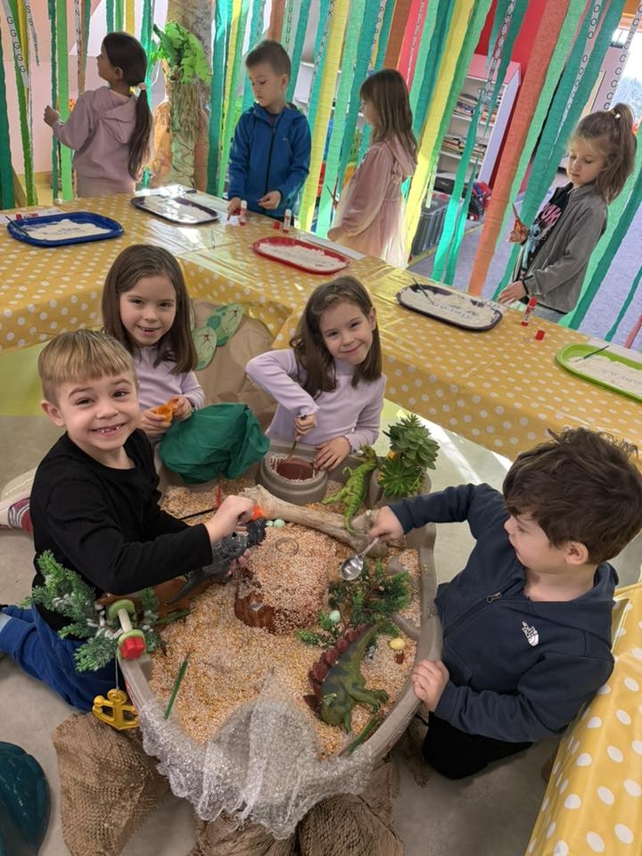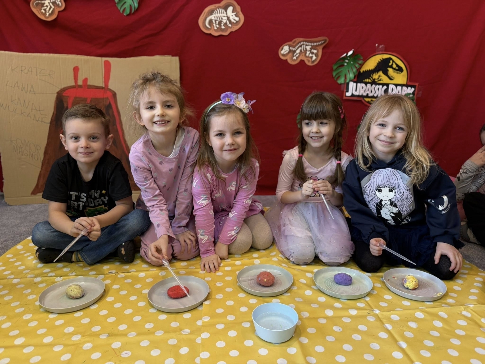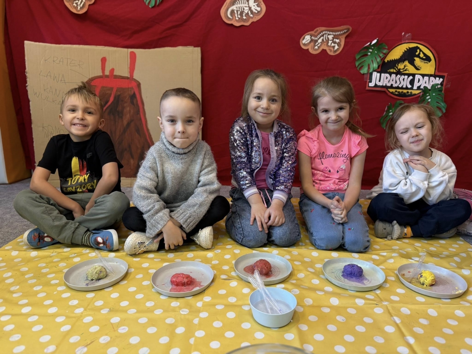 Poszukiwanie jaj w „wykopaliskach” stało się okazją do poznawania fascynujących faktów o życiu tych gadów, dostosowanych do wieku naszych małych podopiecznych. Ogromne wrażenie na dzieciach zrobił bezpieczny eksperyment z „wybuchem” wulkanu, który dostarczył niezapomnianych wrażeń wizualnych i wywołał falę uśmiechów.