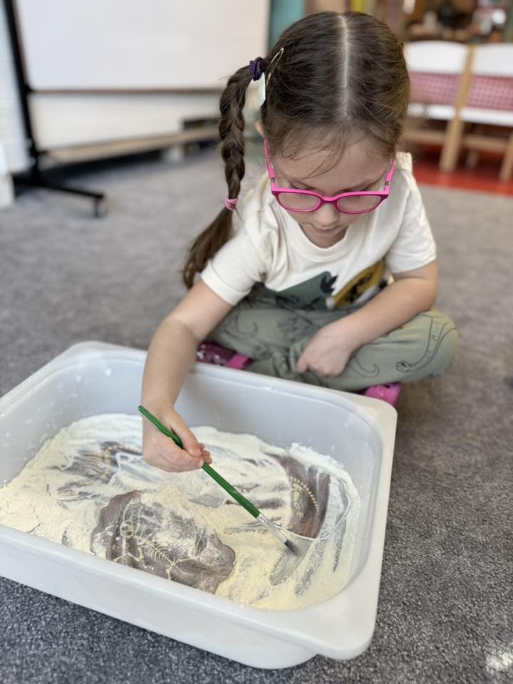 W grupie Starszaków postawiliśmy na eksperymenty, które połączyły prehistorię z naukami ścisłymi w sposób absolutnie magiczny. Dzień rozpoczął się od wielkiej lekcji geologii, podczas której dzieci poznały budowę wulkanu, dowiadując się, czym jest magma, lawa oraz krater. Największe emocje wzbudził oczywiście widowiskowy pokaz erupcji. Kolejnym etapem były „matematyczne wykopaliska” – mali odkrywcy polewali octem dinozaurowe jajka, by wydobyć z nich ukryte zadania.