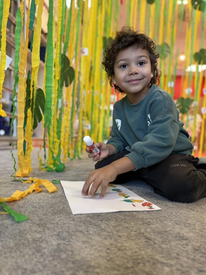 Najważniejszym punktem dnia była jednak praca w prawdziwej dinozaurowej dżungli. Wśród gęstych pasków bibuły maluchy musiały odszukać parę dinozaura ze swojej karty pracy, a następnie precyzyjnie przykleić go na kartkę. Ta pełna emocji zabawa była doskonałym ćwiczeniem dla małych rączek i paluszków, a śmiech i radosne rozmowy o przygodach badaczy wypełniły całe przedpołudnie.