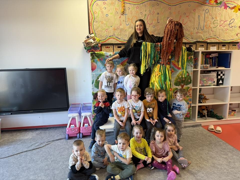 Dzieci z ogromnym entuzjazmem uczyły się żabich skoków, co było doskonałym treningiem siły nóg i koordynacji ruchowej. Nie zabrakło też lekcji elegancji w wykonaniu... bocianów! Chodzenie „stylem bociana” – z wysoko uniesionymi kolanami i dumnie wypiętą piersią – okazało się nie tylko świetną zabawą, ale i trudnym sprawdzianem dla dziecięcej równowagi. Podczas zabaw muzyczno-ruchowych maluszki w pełni wcieliły się w swoje role, a radosne „kumkanie” i „klekotanie” niosło się po całym przedszkolu.