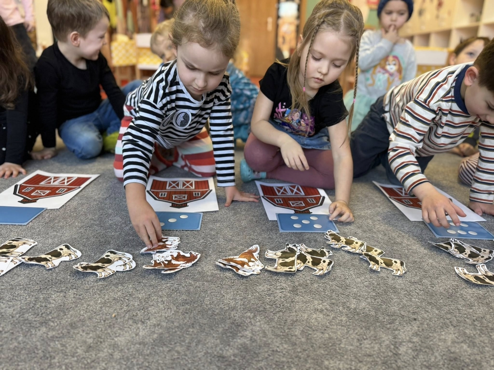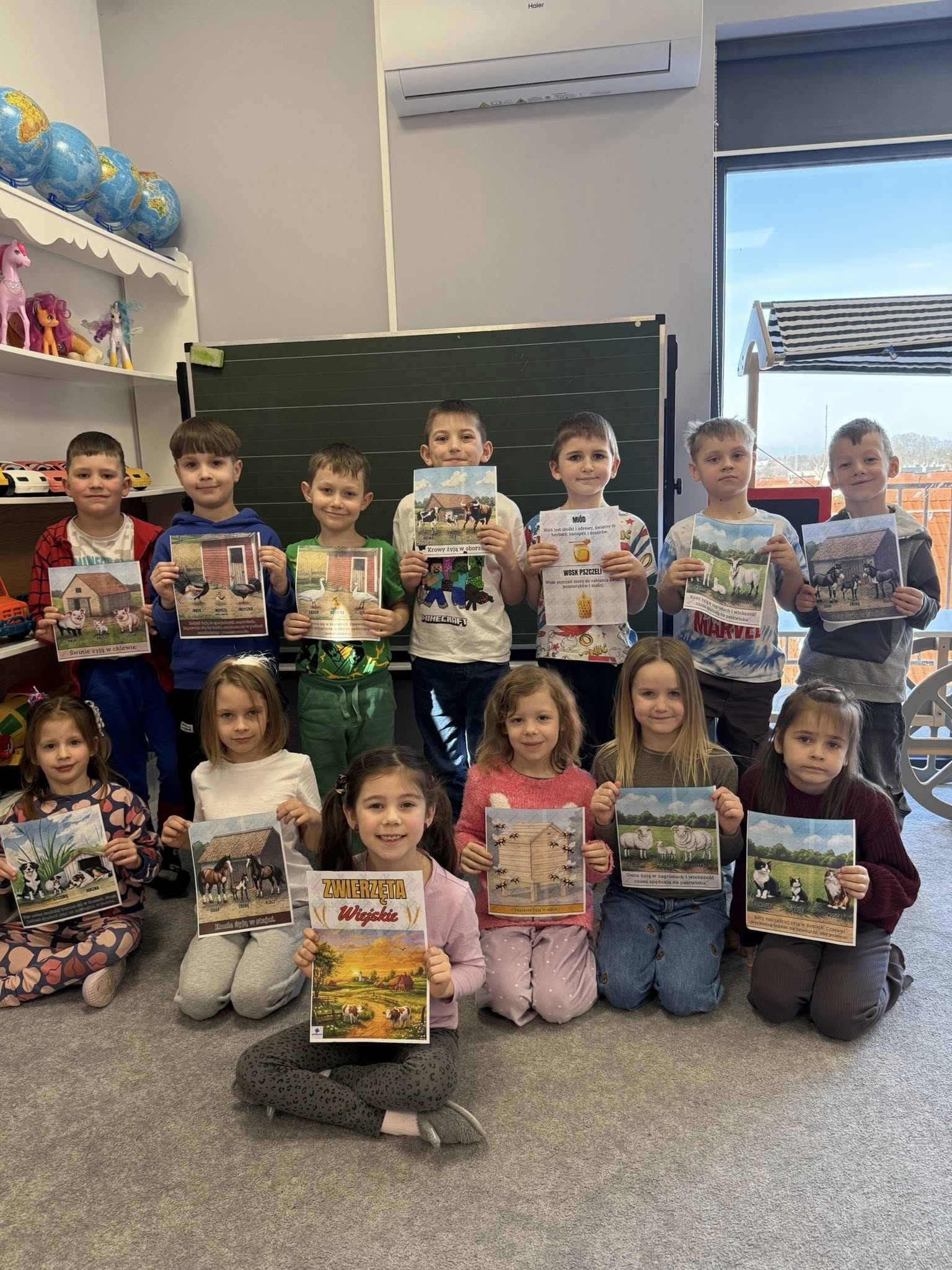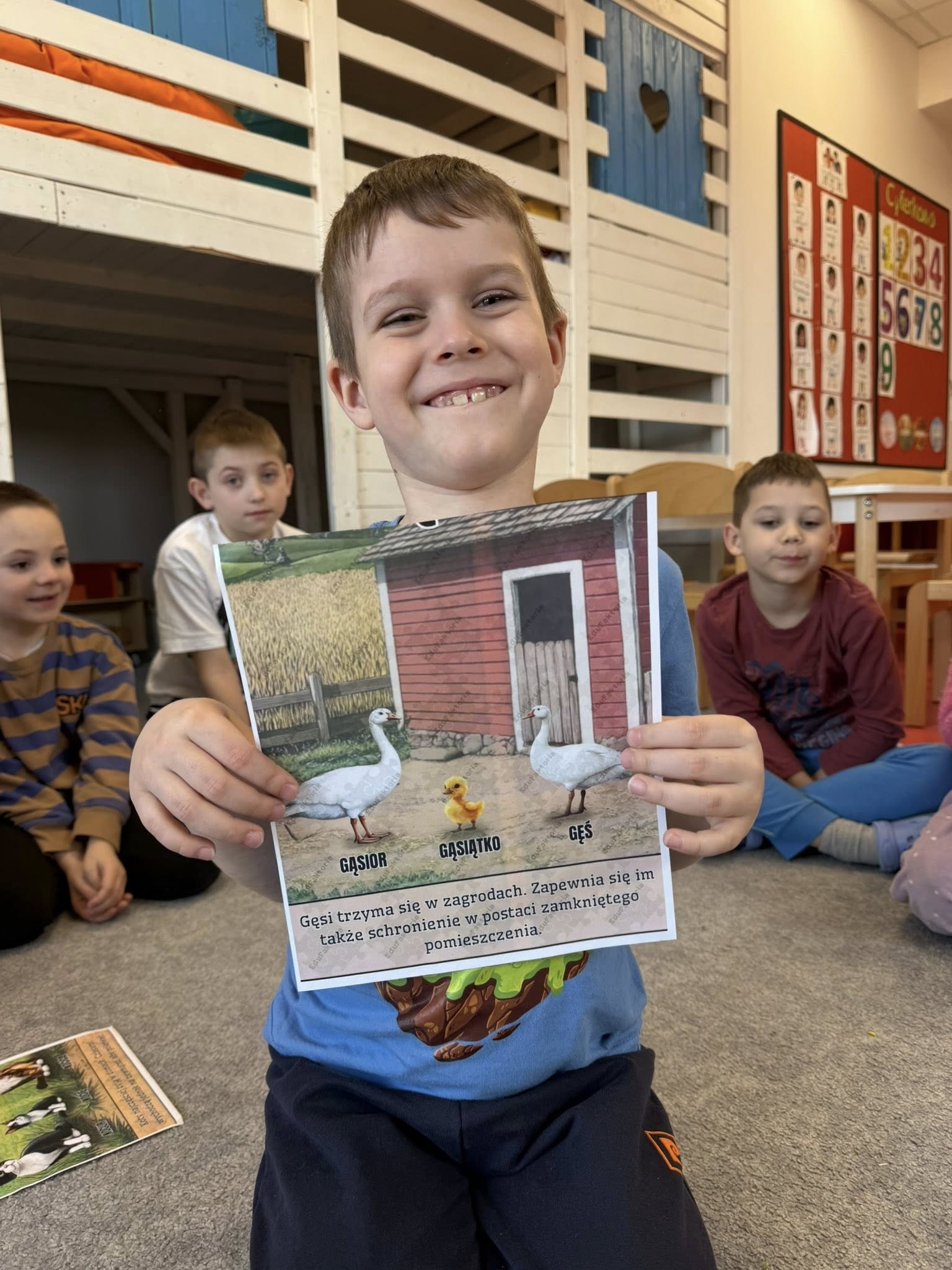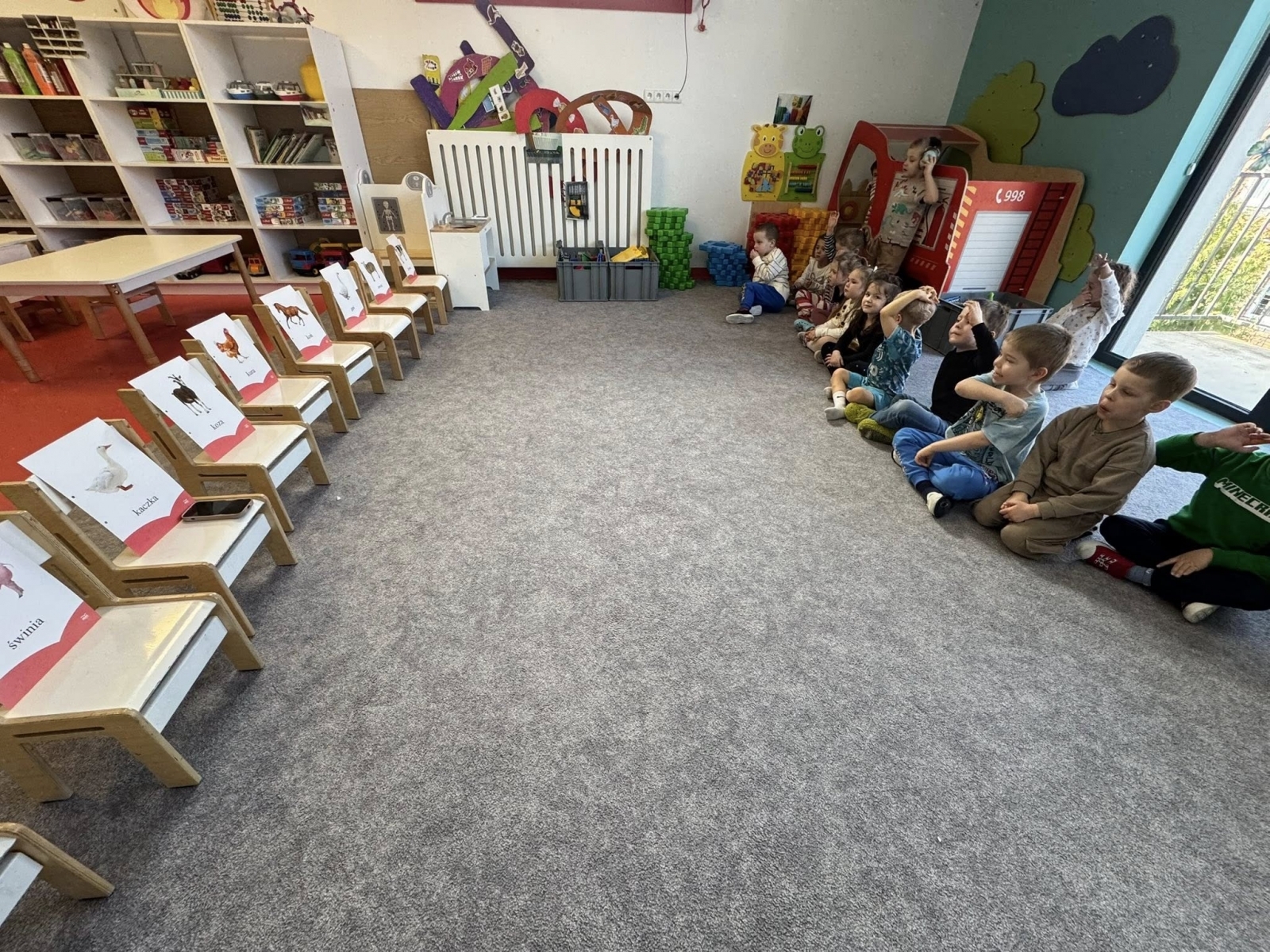 Podczas lekcji starszaki zgłębiały wiedzę o cyklach życia i strukturach rodzinnych w świecie zwierząt. Wspólnie poznawaliśmy różnice między krową, bykiem i cielęciem, a także uczyliśmy się poprawnego nazewnictwa w rodzinie psów, rozróżniając psa, suczkę i szczenię. Była to nie tylko doskonała okazja do utrwalania wiedzy przyrodniczej, ale również świetny trening spostrzegawczości oraz koncentracji, tak ważnej na etapie przygotowania do pierwszej klasy szkoły podstawowej.