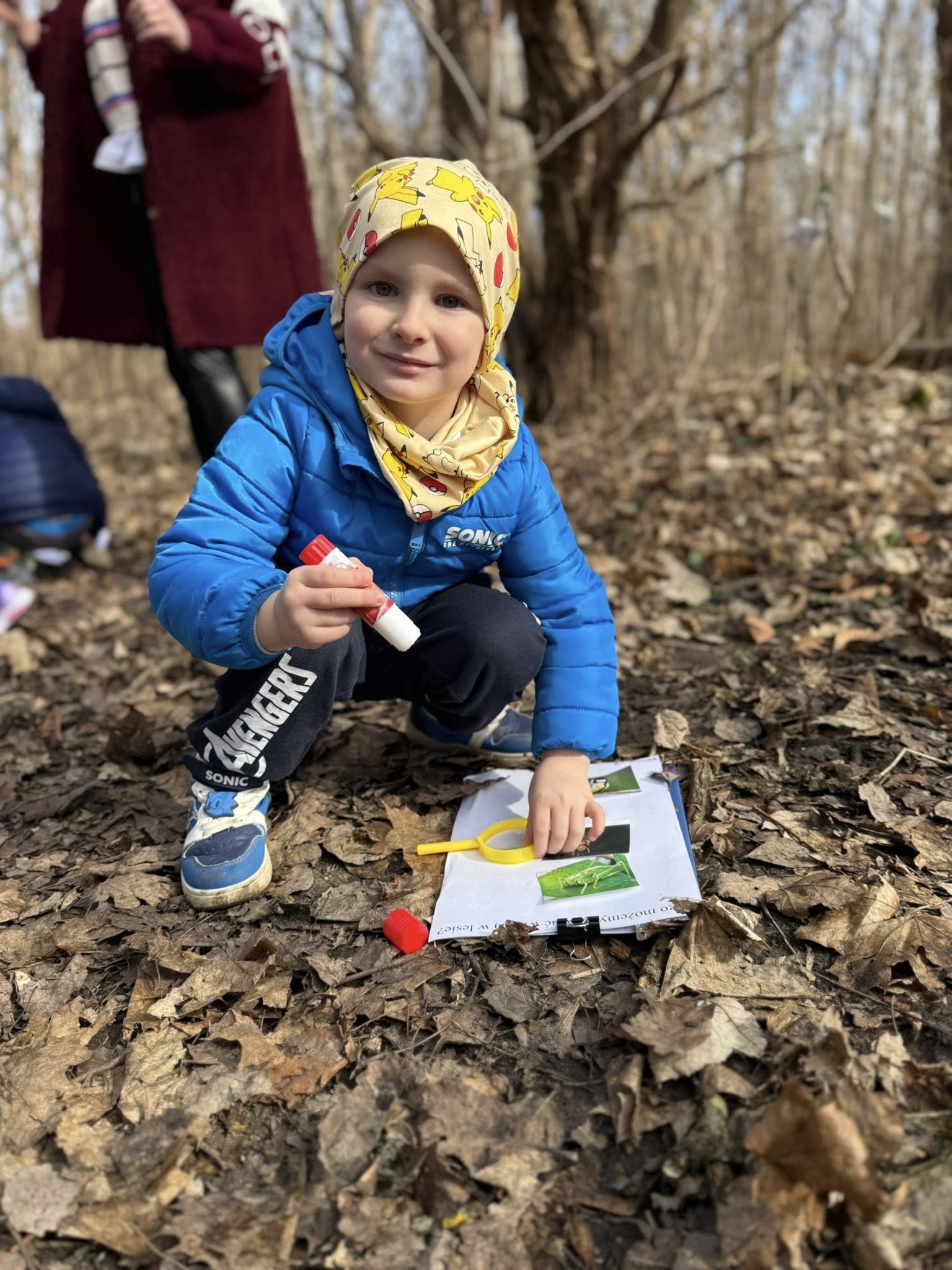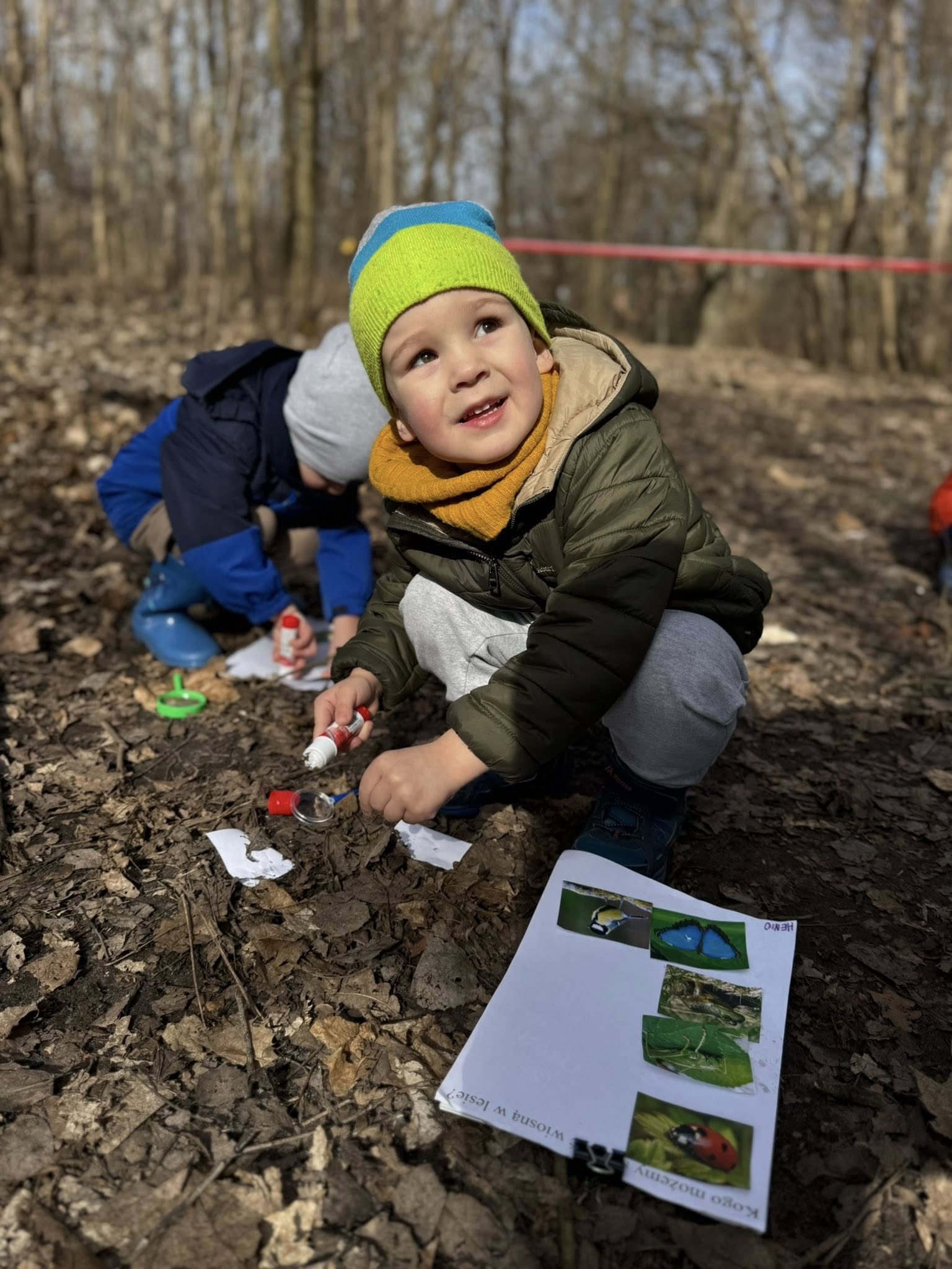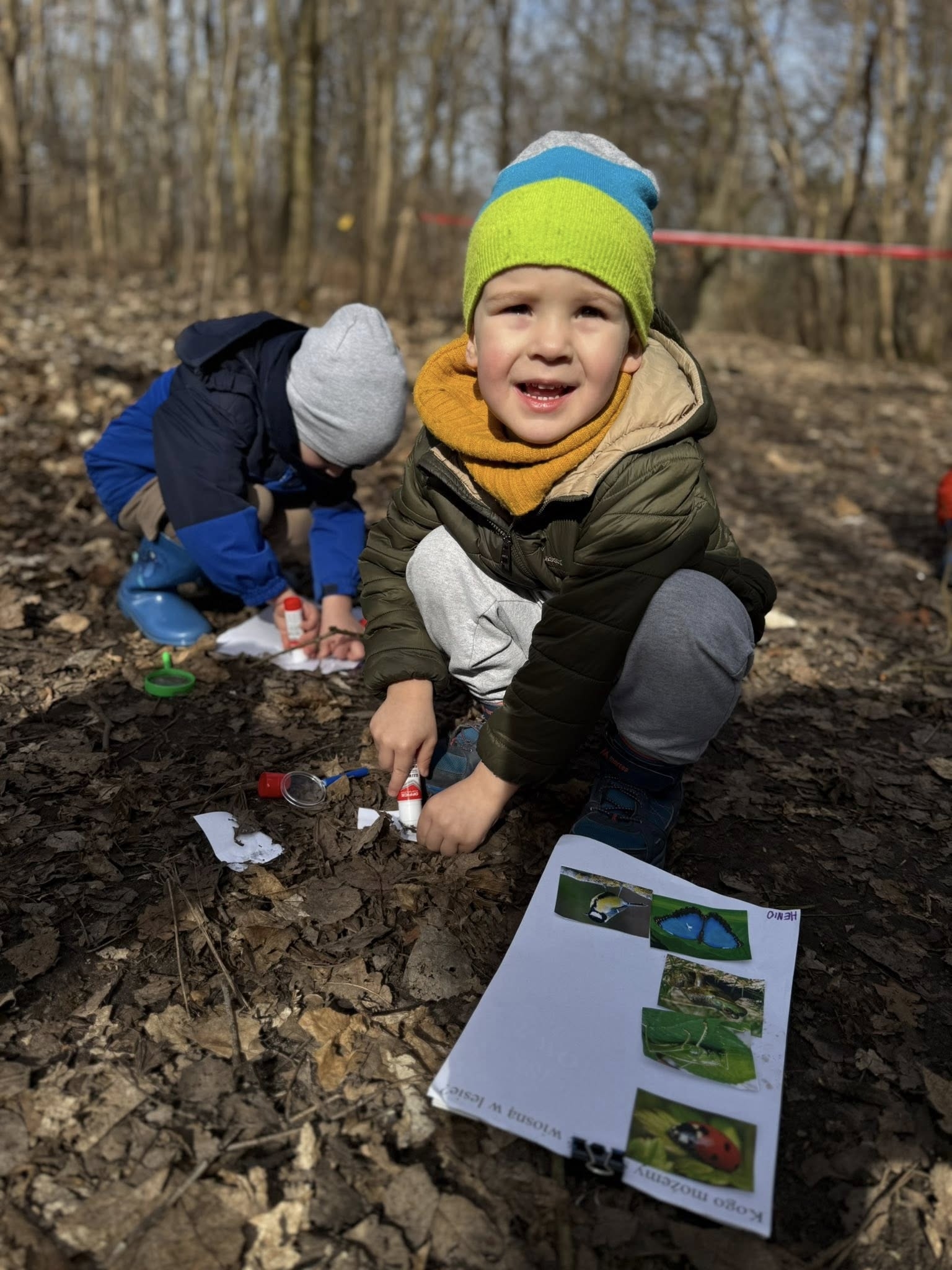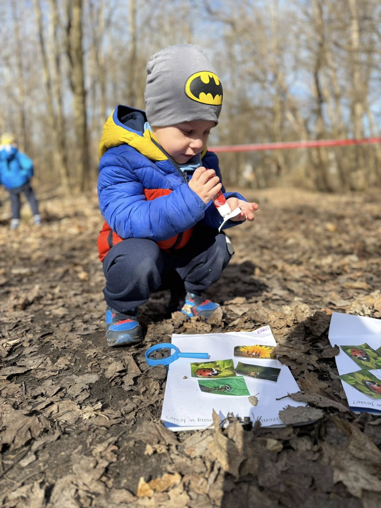 Zajęcia dydaktyczne w Żłobku, Przedszkolu i Zerówce Mały Europejczyk w Elblągu często wykraczają poza budynek, czego najlepszym przykładem była wyprawa naszych Maluszków do pobliskiego lasu. Celem tej terenowej lekcji było odkrywanie, kogo można spotkać wiosną w leśnej gęstwinie. Dzieci z ogromnym zaangażowaniem tropiły ukryte na trasie ilustracje przedstawiające żabki, koniki polne, biedronki czy pająki, a następnie precyzyjnie wyklejały nimi swoje karty pracy.