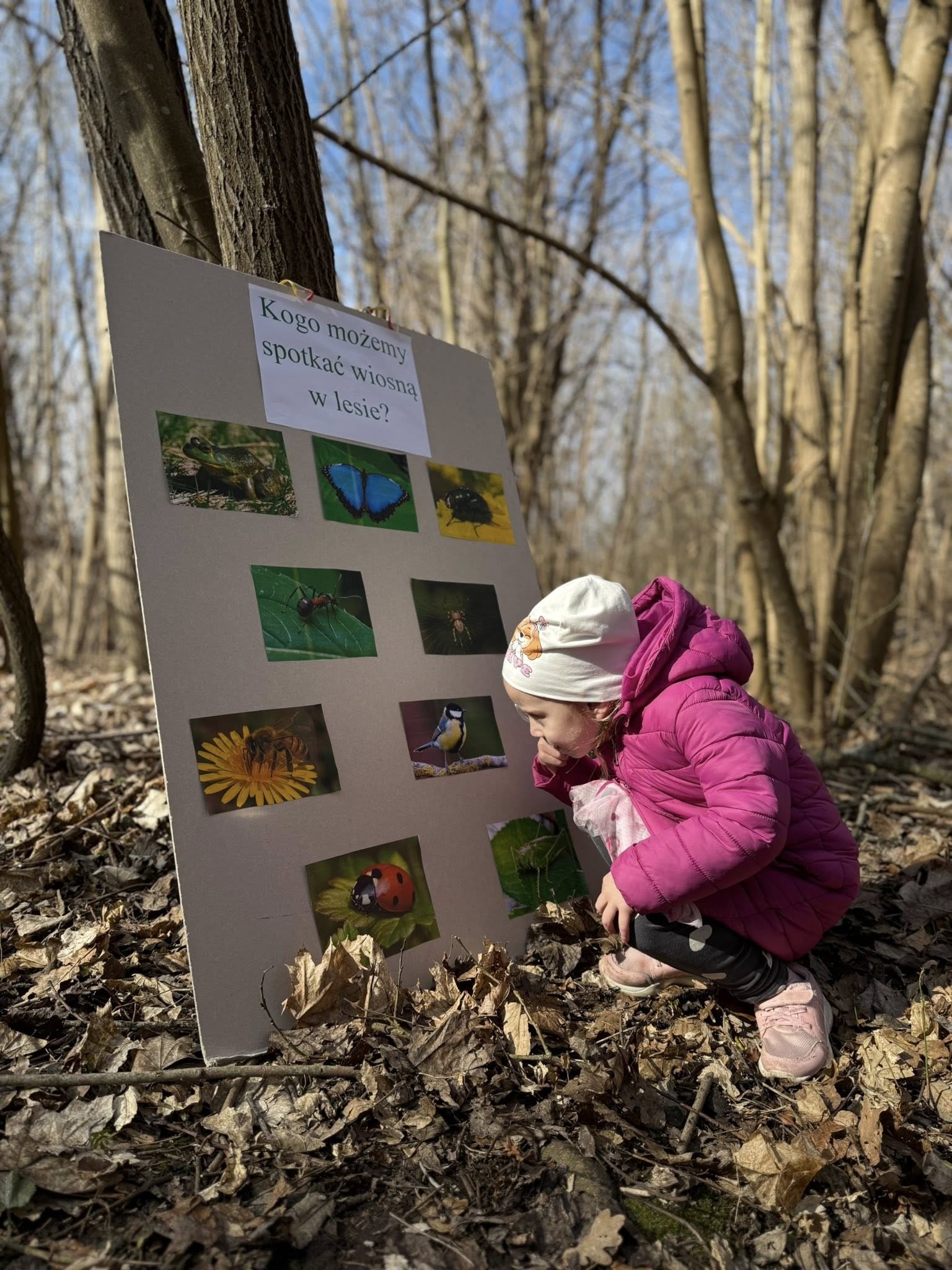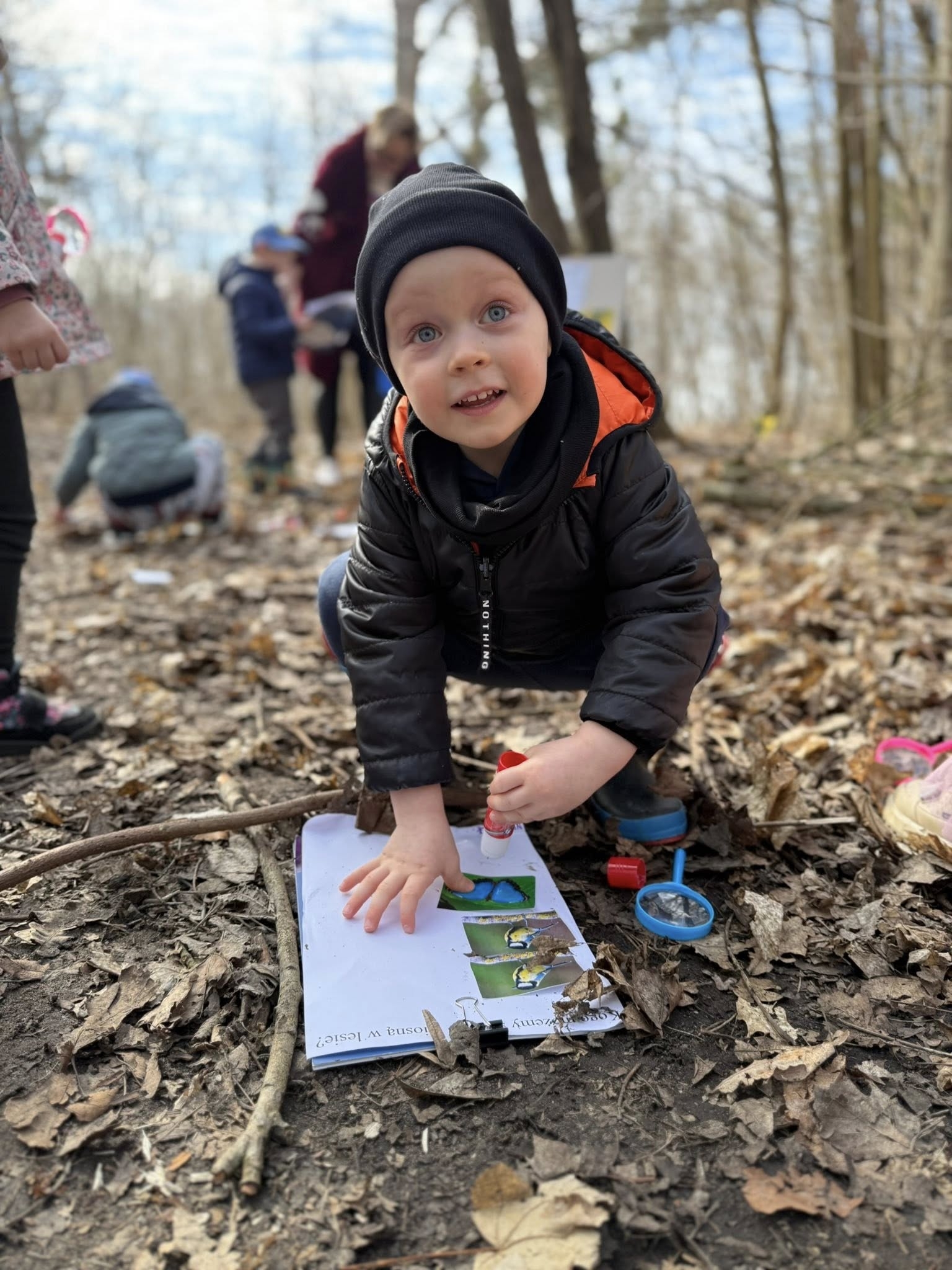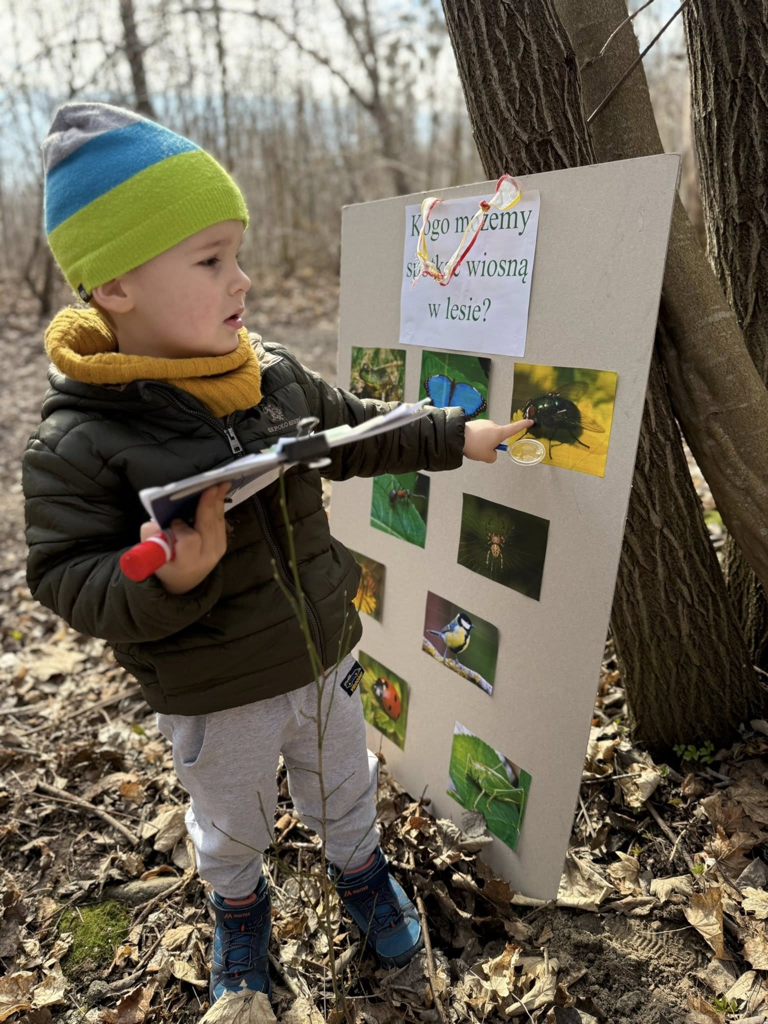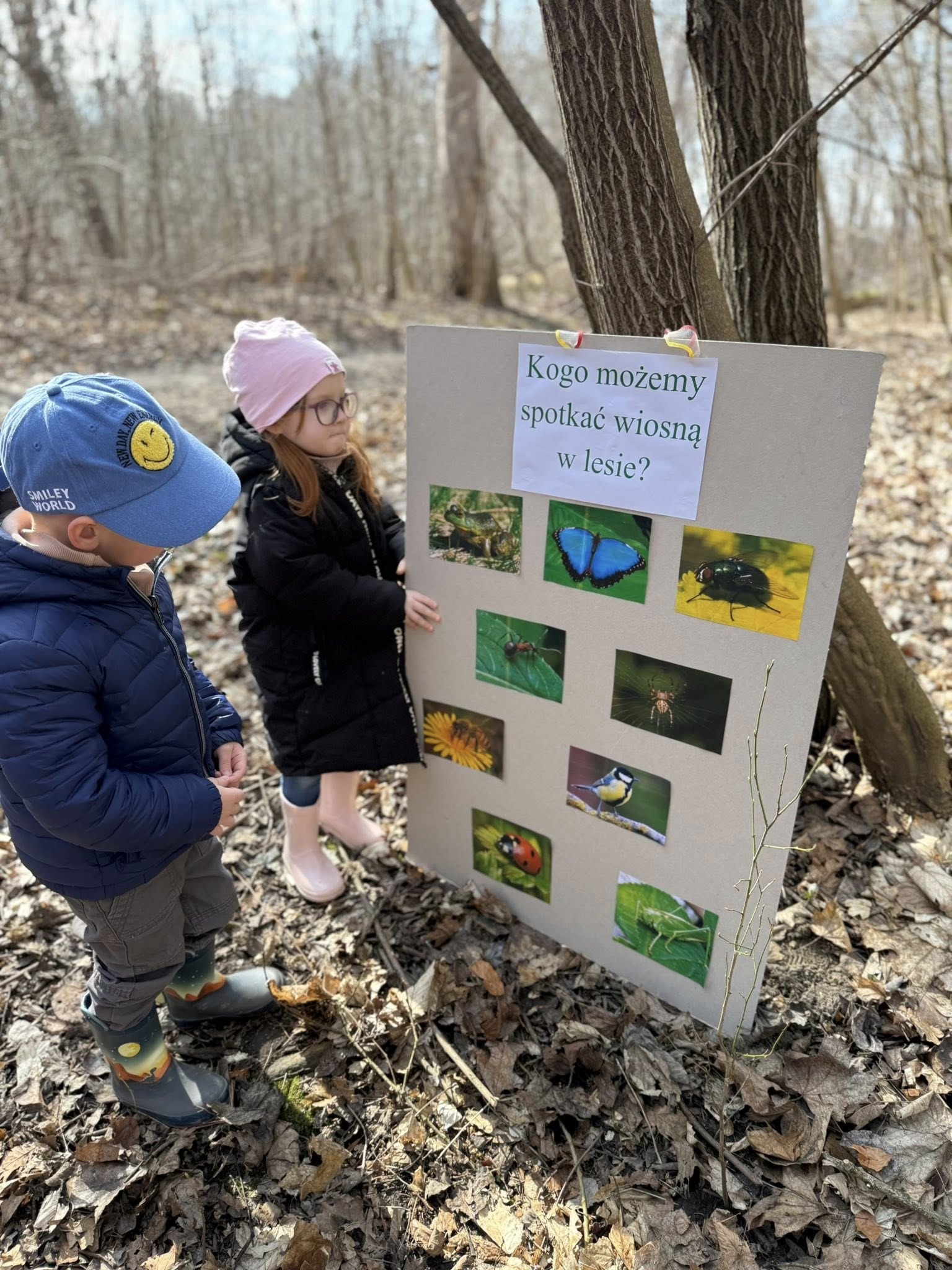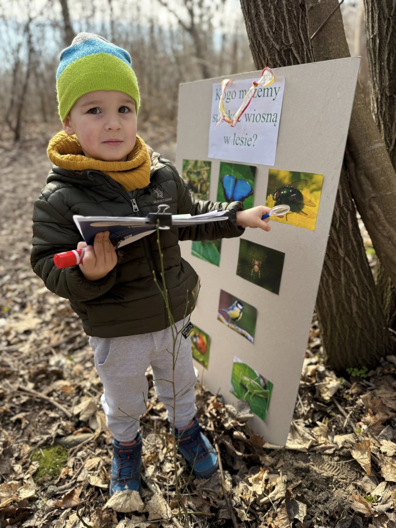 Zajęcia dydaktyczne w Żłobku, Przedszkolu i Zerówce Mały Europejczyk w Elblągu często wykraczają poza budynek, czego najlepszym przykładem była wyprawa naszych Maluszków do pobliskiego lasu. Celem tej terenowej lekcji było odkrywanie, kogo można spotkać wiosną w leśnej gęstwinie. Dzieci z ogromnym zaangażowaniem tropiły ukryte na trasie ilustracje przedstawiające żabki, koniki polne, biedronki czy pająki, a następnie precyzyjnie wyklejały nimi swoje karty pracy.
