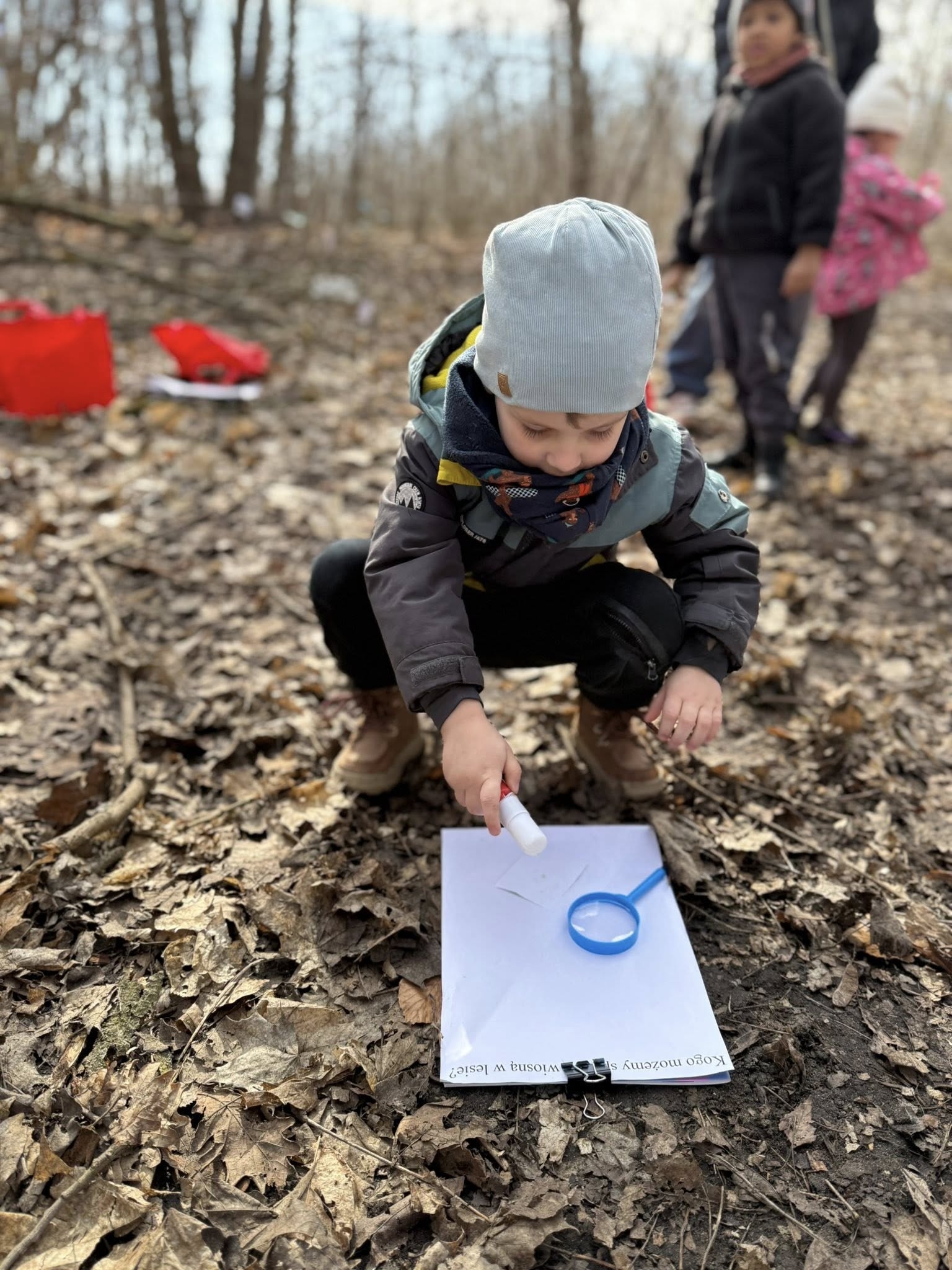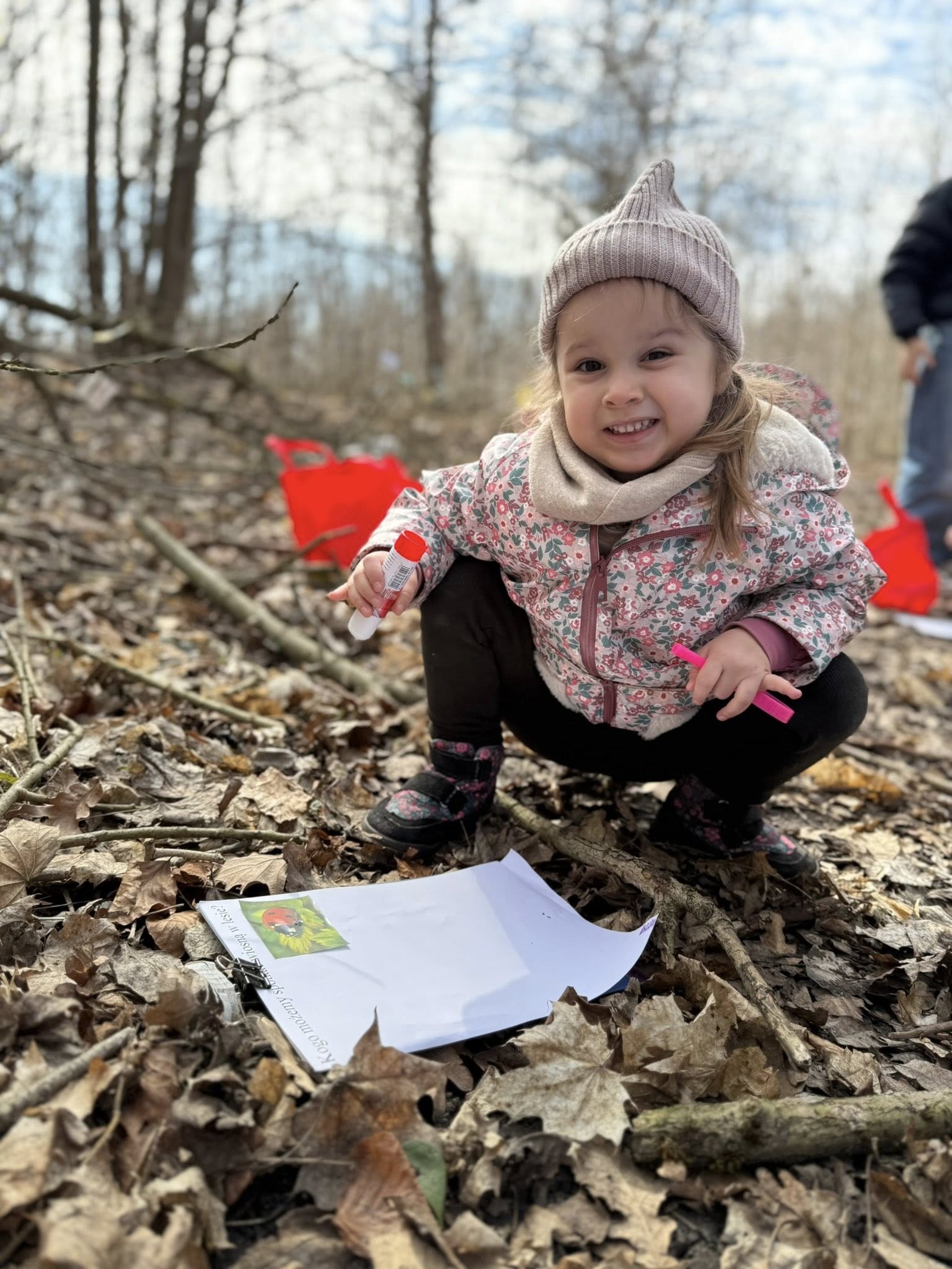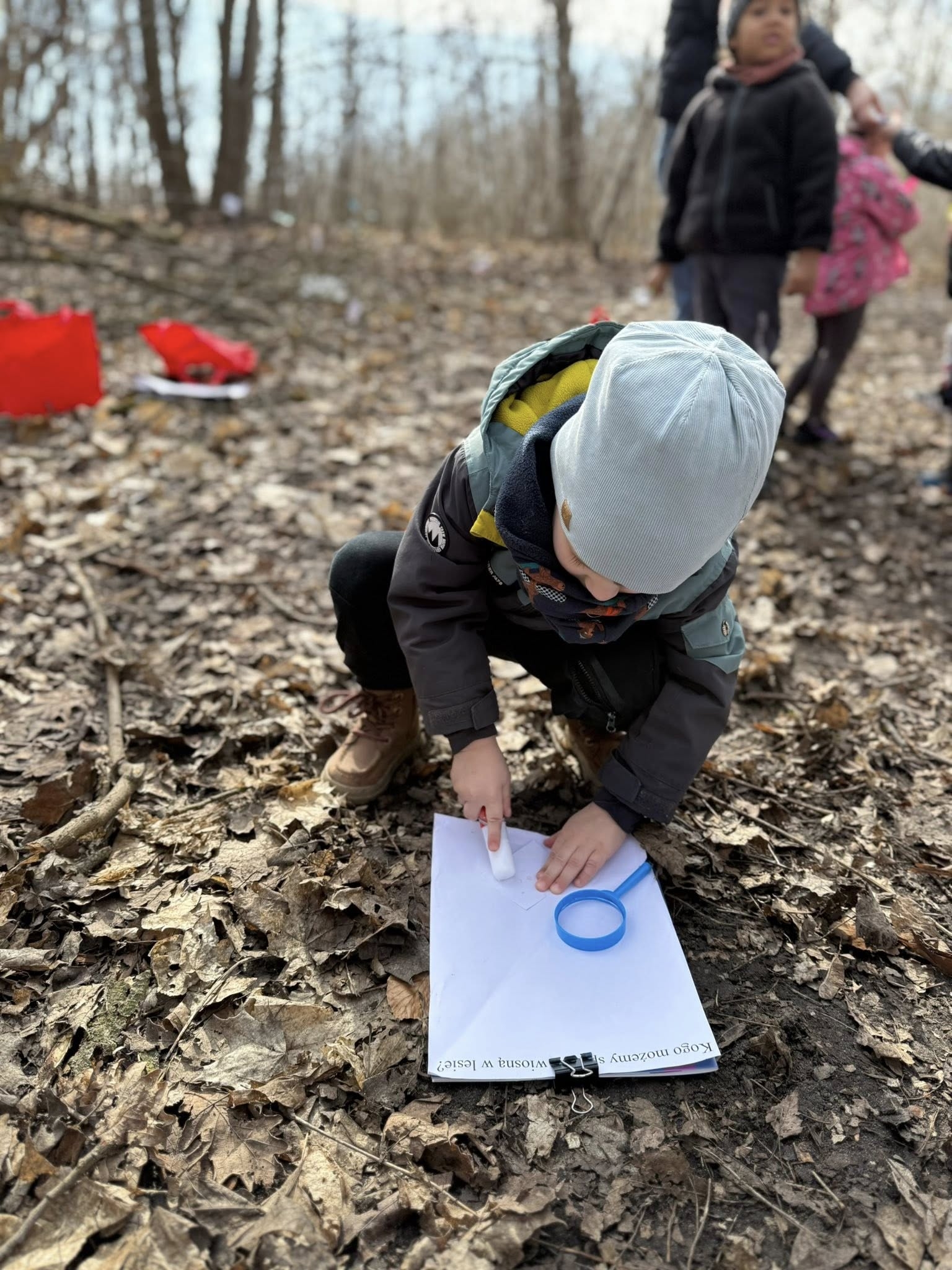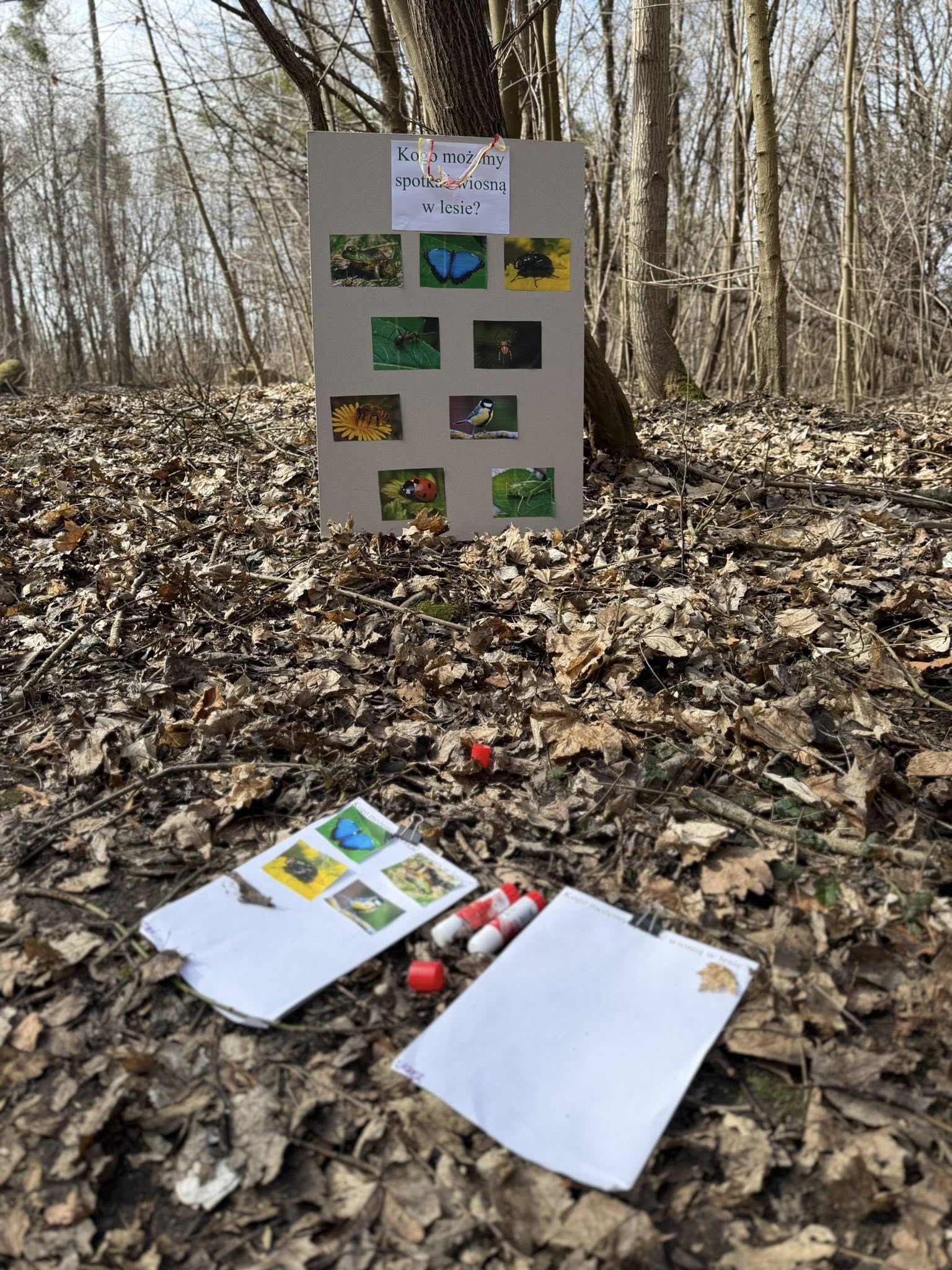 Zajęcia dydaktyczne w Żłobku, Przedszkolu i Zerówce Mały Europejczyk w Elblągu często wykraczają poza budynek, czego najlepszym przykładem była wyprawa naszych Maluszków do pobliskiego lasu. Celem tej terenowej lekcji było odkrywanie, kogo można spotkać wiosną w leśnej gęstwinie. Dzieci z ogromnym zaangażowaniem tropiły ukryte na trasie ilustracje przedstawiające żabki, koniki polne, biedronki czy pająki, a następnie precyzyjnie wyklejały nimi swoje karty pracy.