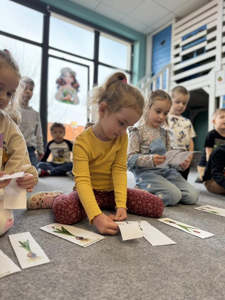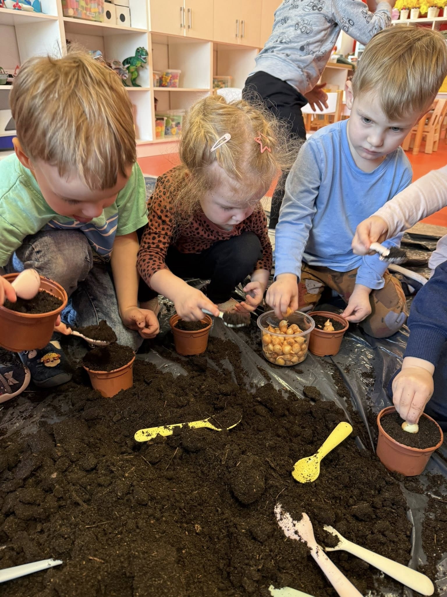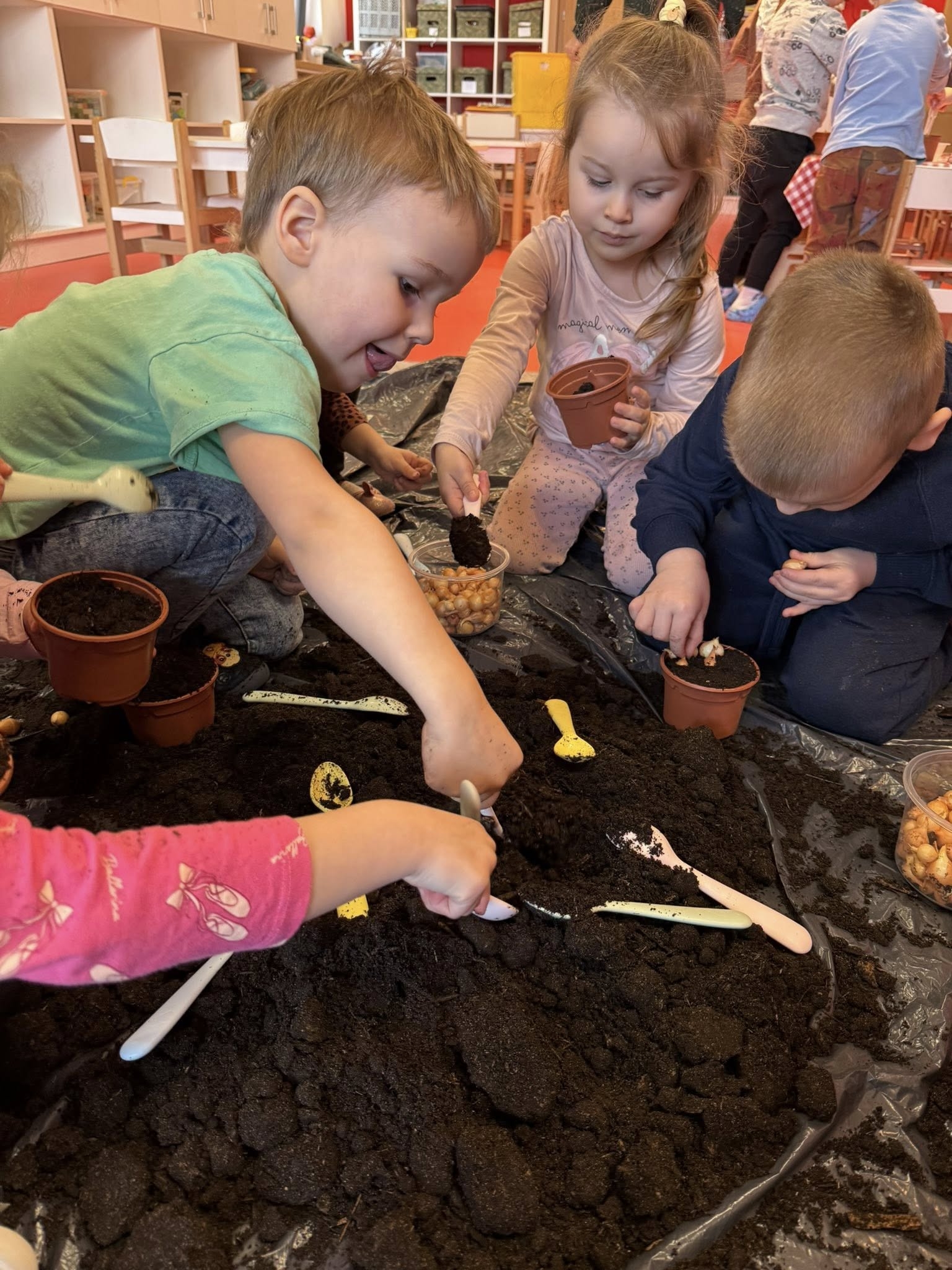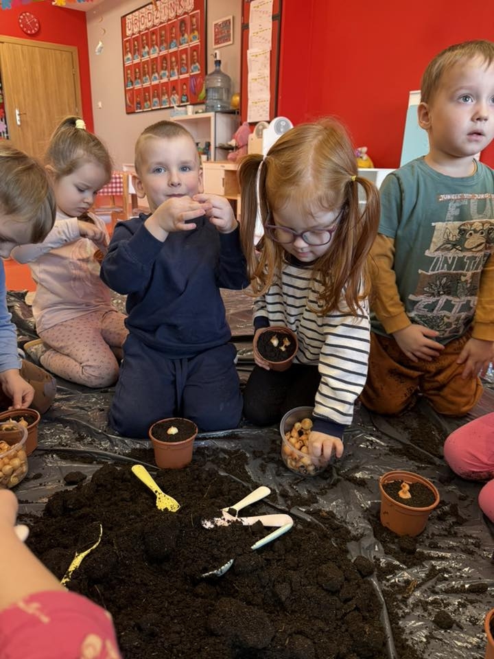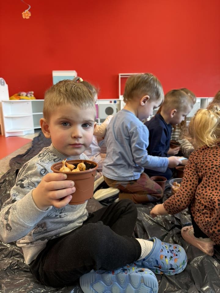 Nawet nasi najmłodsi podopieczni aktywnie włączyli się w wiosenne prace. W grupie Maluszków odbyły się ważne zajęcia przyrodnicze, których główną bohaterką była... cebula. Dzieci z wielkim skupieniem i delikatnością pomagały w sadzeniu cebulek do doniczek. Teraz z niecierpliwością doglądają swoich upraw, czekając na pierwsze zielone listki szczypiorku. To proste ćwiczenie uczy dzieci cierpliwości oraz opiekuńczości wobec roślin, pokazując im magiczny proces wzrostu, który odbywa się na ich oczach.