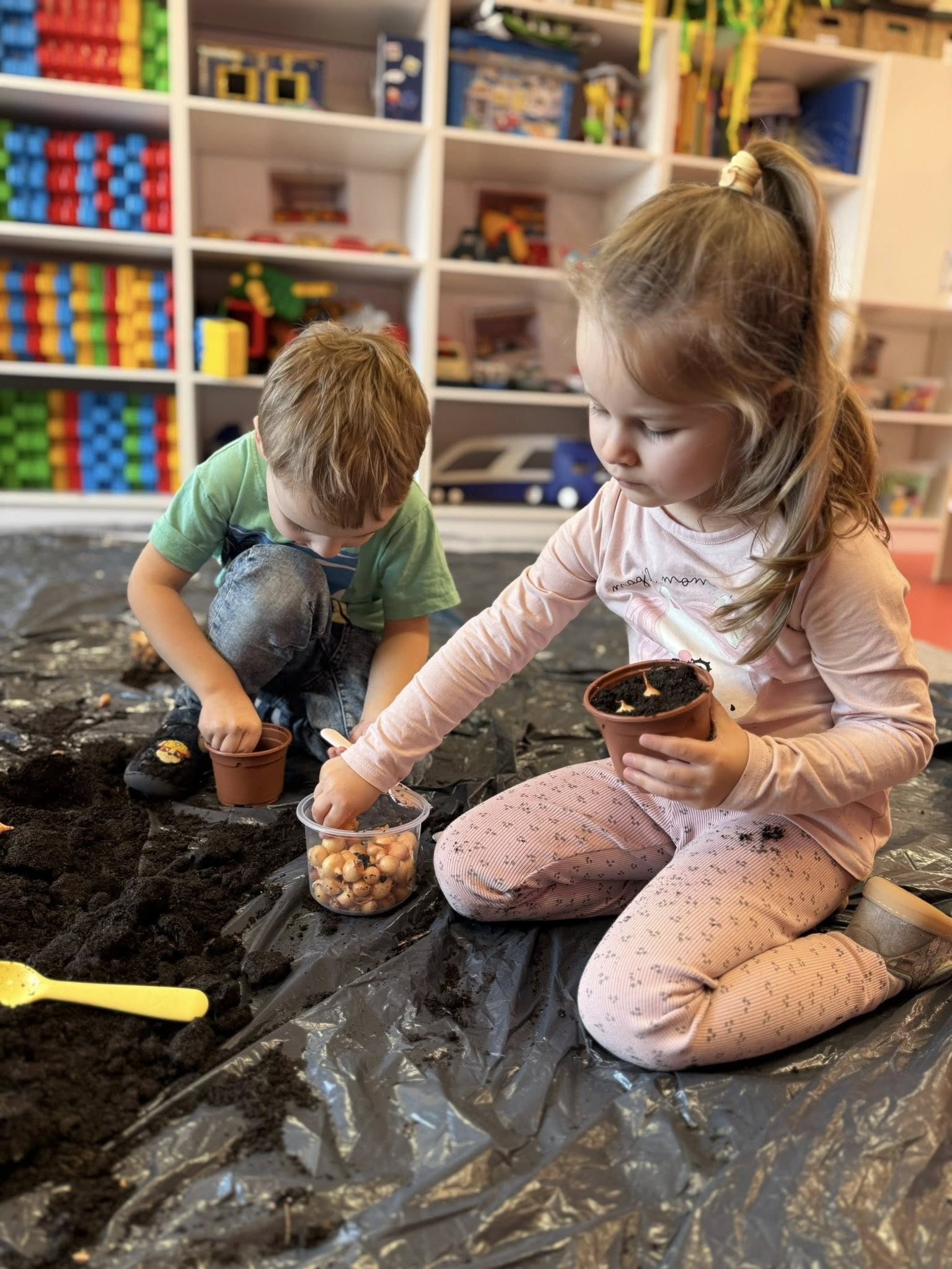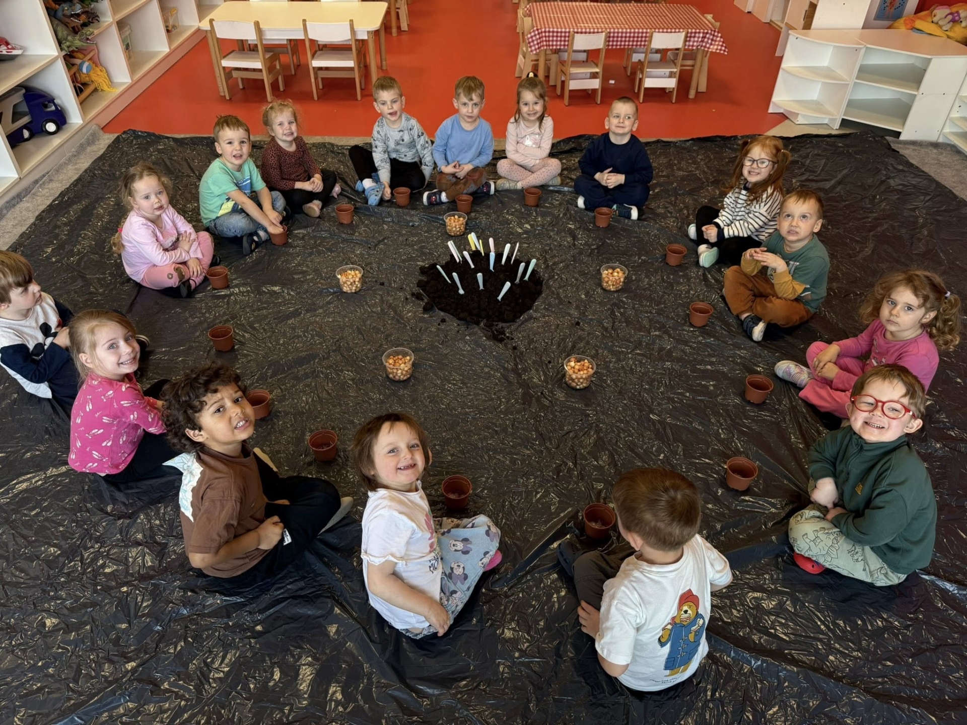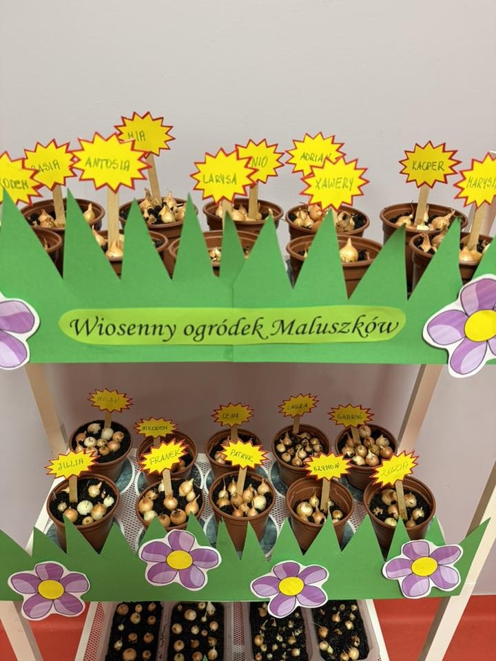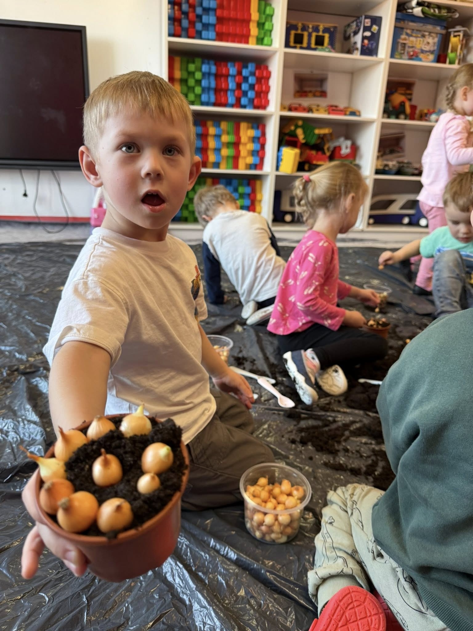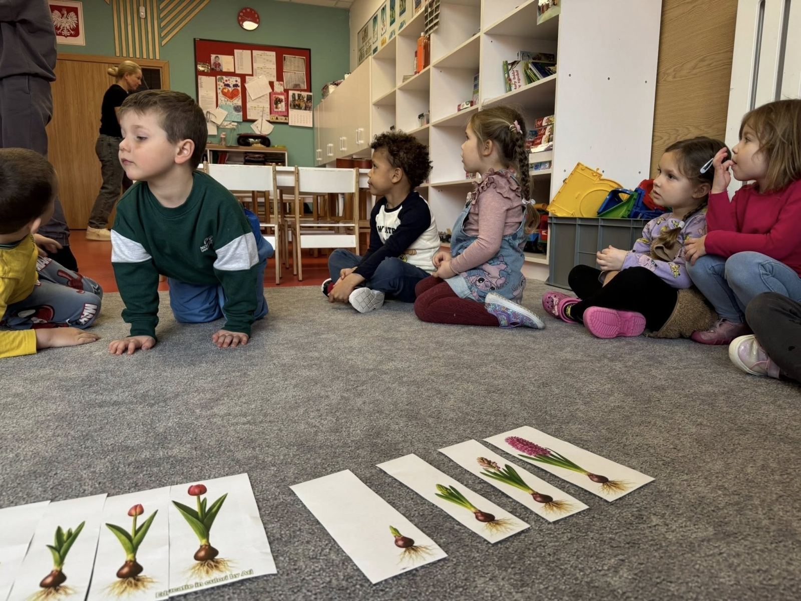 Nawet nasi najmłodsi podopieczni aktywnie włączyli się w wiosenne prace. W grupie Maluszków odbyły się ważne zajęcia przyrodnicze, których główną bohaterką była... cebula. Dzieci z wielkim skupieniem i delikatnością pomagały w sadzeniu cebulek do doniczek. Teraz z niecierpliwością doglądają swoich upraw, czekając na pierwsze zielone listki szczypiorku. To proste ćwiczenie uczy dzieci cierpliwości oraz opiekuńczości wobec roślin, pokazując im magiczny proces wzrostu, który odbywa się na ich oczach.