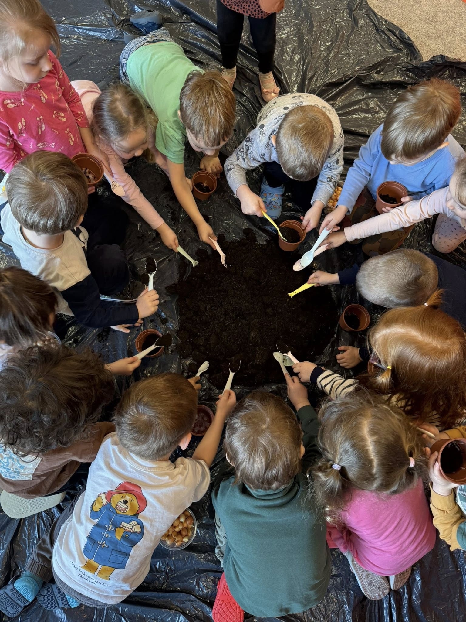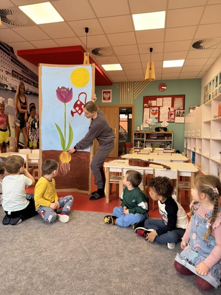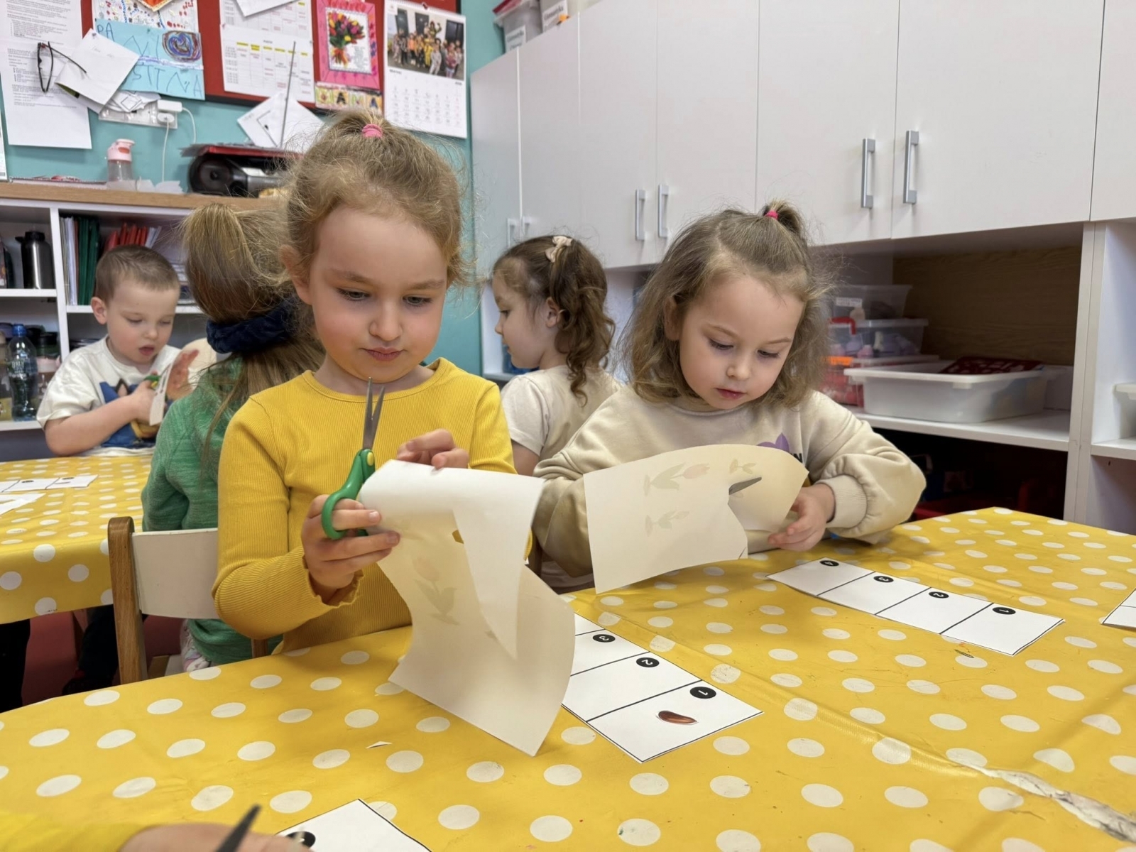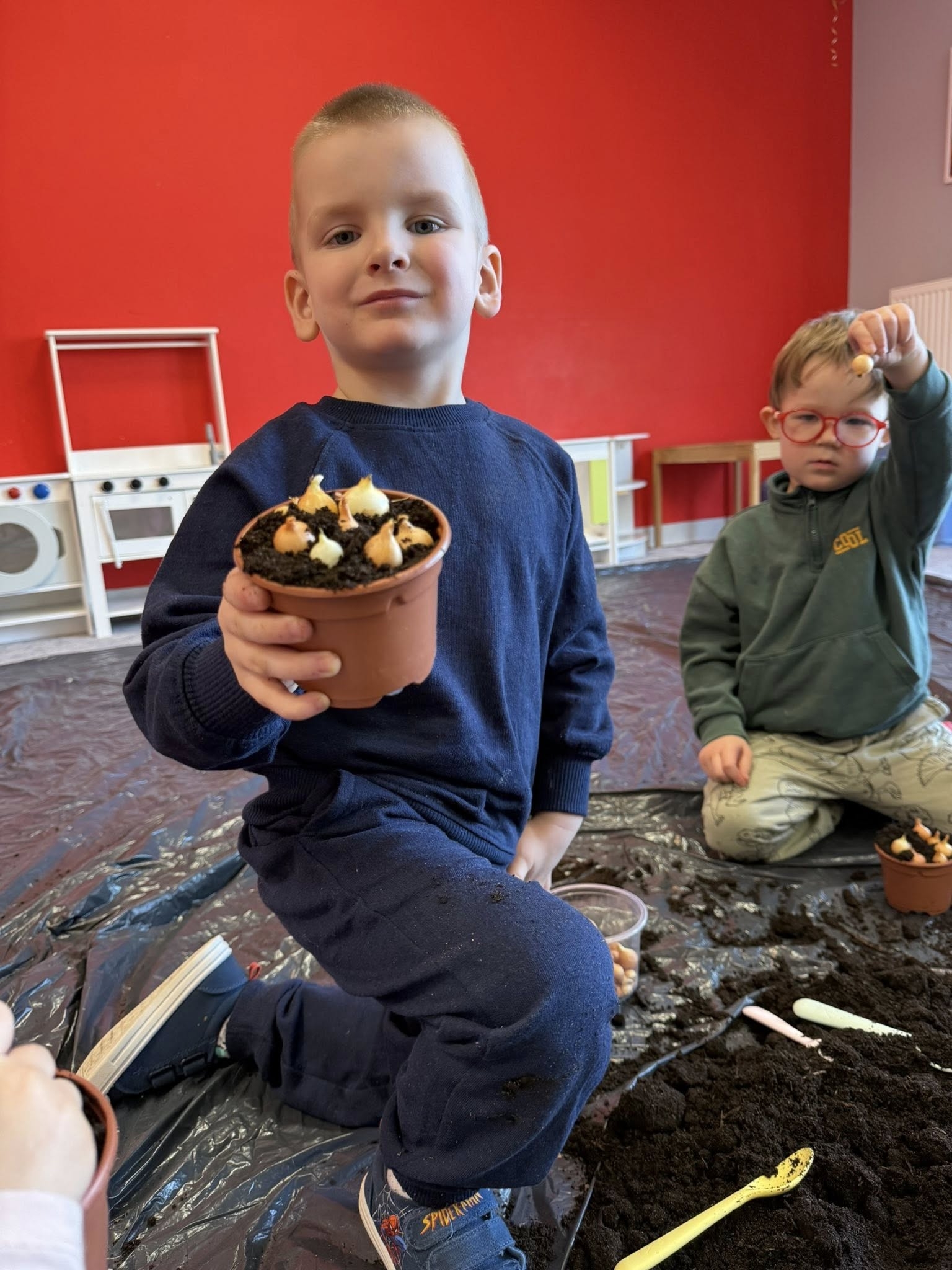 Nawet nasi najmłodsi podopieczni aktywnie włączyli się w wiosenne prace. W grupie Maluszków odbyły się ważne zajęcia przyrodnicze, których główną bohaterką była... cebula. Dzieci z wielkim skupieniem i delikatnością pomagały w sadzeniu cebulek do doniczek. Teraz z niecierpliwością doglądają swoich upraw, czekając na pierwsze zielone listki szczypiorku. To proste ćwiczenie uczy dzieci cierpliwości oraz opiekuńczości wobec roślin, pokazując im magiczny proces wzrostu, który odbywa się na ich oczach.