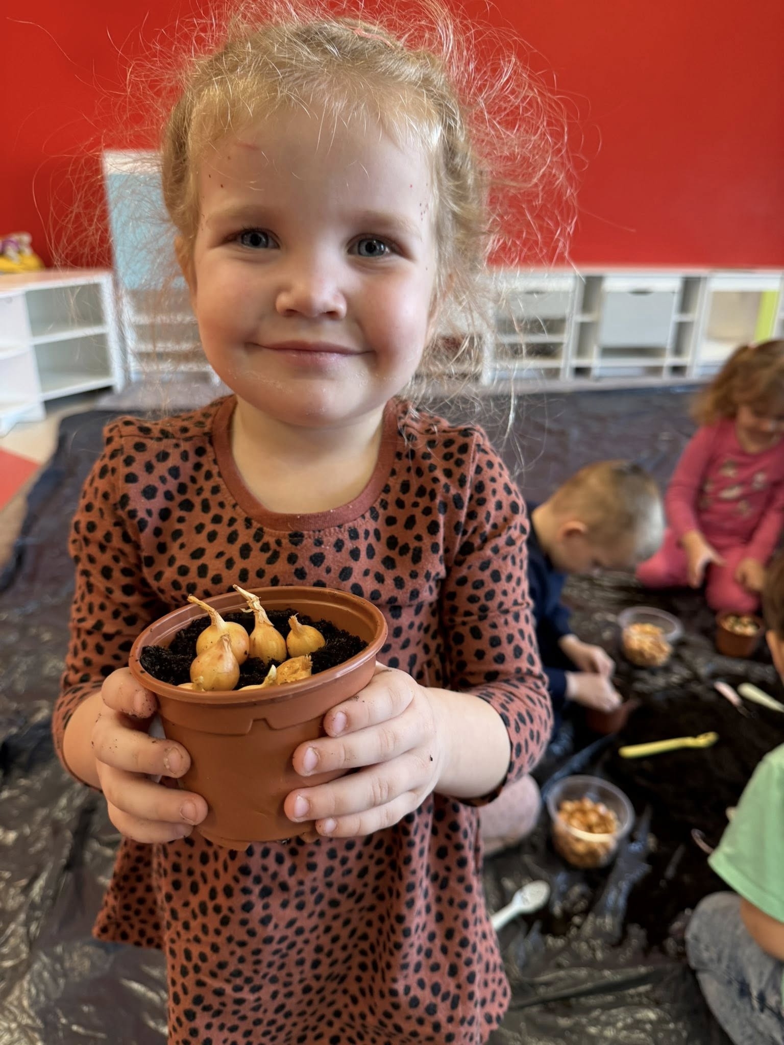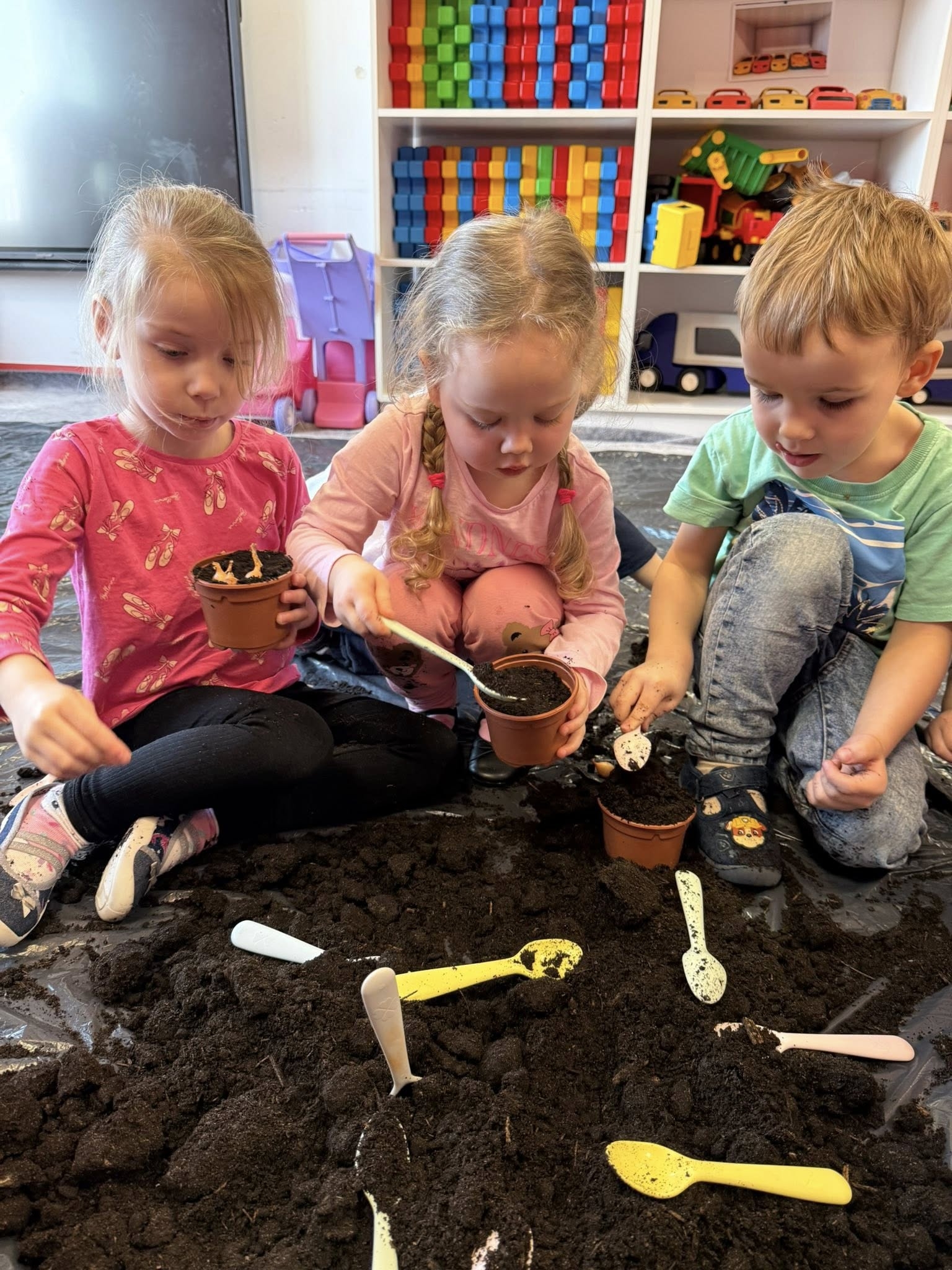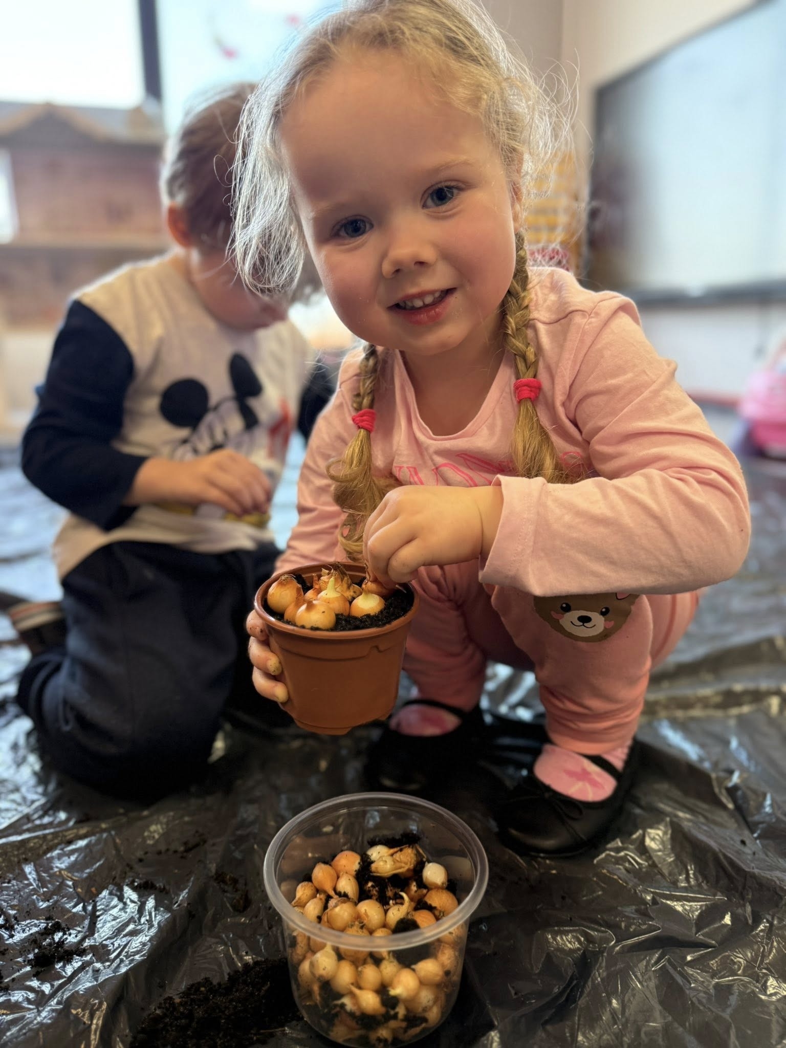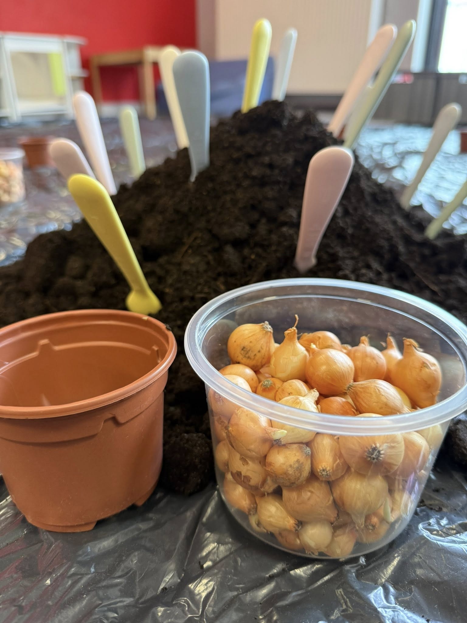 Nawet nasi najmłodsi podopieczni aktywnie włączyli się w wiosenne prace. W grupie Maluszków odbyły się ważne zajęcia przyrodnicze, których główną bohaterką była... cebula. Dzieci z wielkim skupieniem i delikatnością pomagały w sadzeniu cebulek do doniczek. Teraz z niecierpliwością doglądają swoich upraw, czekając na pierwsze zielone listki szczypiorku. To proste ćwiczenie uczy dzieci cierpliwości oraz opiekuńczości wobec roślin, pokazując im magiczny proces wzrostu, który odbywa się na ich oczach.